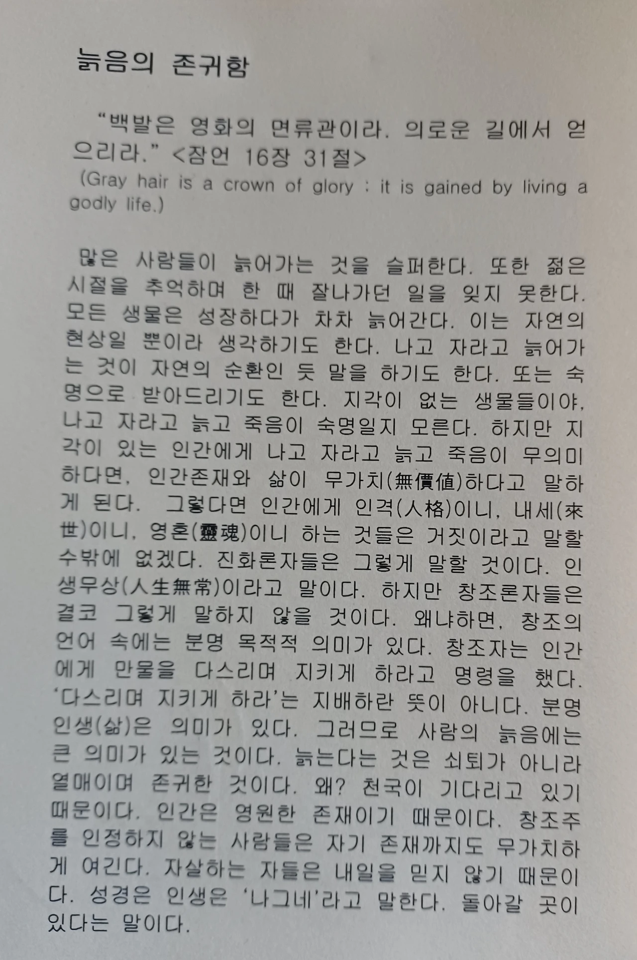 어느 날 파고다 공원에서 한 늙은 노인과 대화를 했었다. 긴 푸념을 인내하며 끝까지 경청을 했다. 그다음 날도 뵙고 같은 푸념을 끝까지 경청을 했다. 난 노인복지를 위한 논문을 쓰기 위해 노인들을 이해하기 위해서였다. 열에 아홉은 비슷한 푸념들이었다. 여기서 푸념이란 용어를 씀은 노인들께 무척 죄송스럽다. 하지만 푸념을 사용하는 이유는... 노인들이 어떤 해답이나 해결을 바라시는 것이 아니라고 말씀하셨다. 그냥 들어달라고만 하셨기 때문이다. 그렇다 오늘내일의 과제도 아니다. 그래서 늙음은 슬프다고 하소연을 하신다. 유일하게도 인간만이 늙음을 괴로워하고 슬퍼한다. 그래서 배웠다는 지식인들이 하는 말, 인생무상이니, 인생은 허무하다, 삶은 무가치하다. 그러면서 내심 훌륭한 삶을 추구하고, 성공을 향해 달리고, 억척같이 살려고 발버둥 친다. 그지 허무하고 무가치하다면... 왜 그렇게 아등바등할까? 대충 살다가는게 진실한 태도가 아닌가? 입으론 불평하고 행동으론 질주하는 모습은 무엇을 말해주는가? 인간만이 아니다. 동물도, 식물도, 하물며 바람도, 물도... 이들로써 일어나거나 현상들에는 원인과 이유가 있기에.. 끝없이 나고, 자라고, 죽고 하는 흐름이 연속되는 것이 아니겠는가? 순간에 사라지는 것도 흔적을 남기거나 영향을 주고 사라진다. 그렇다면... 긍정적으로 살펴보면, 성장과 쇠퇴... 또는 늙어감에는 분명 가치(의미)가 있는 것이다. 어떻게 늙어가든... 그 세월은 무의미하지 않다는 것이다. 그러므로 늙어감이란 용어에는 수많은 의미를, 수많은 일(사건)로 엮어진 결실이 숨어있는 것이라고 나는 생각한다. 그래서 늙음은 아름답고 존귀하다고 말하고 싶다. 살아온 결실인 것이다. 벼가 알곡을 맺듯이, 나무가 꽃피우고 열매를 맺듯이 말이다. 어떤 결심을 맺는가에 대한 평가(심판)를 겸허하게 받아들이는 것이 이성이 있는 인간이 아니겠는가?