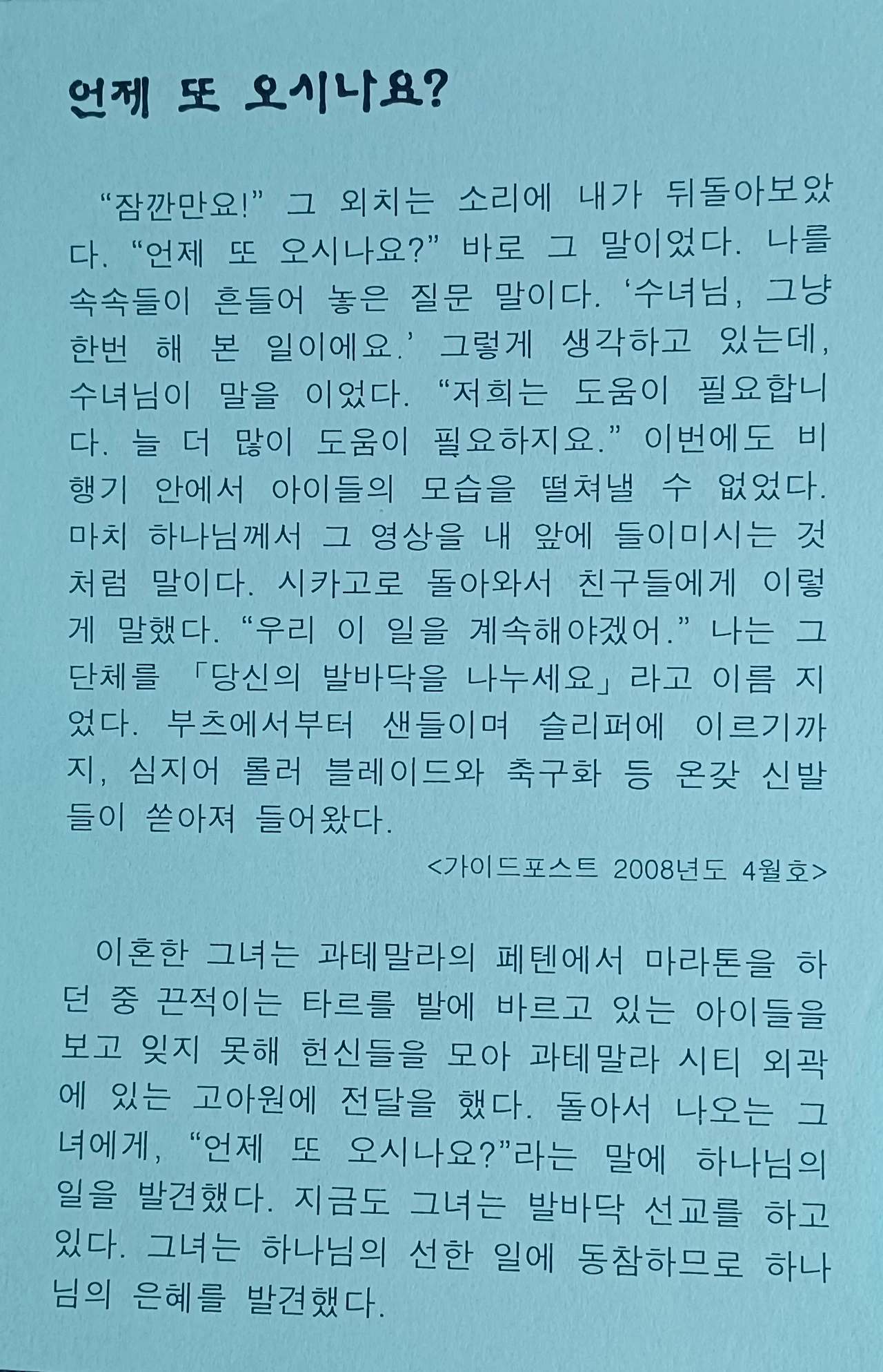 "언제 또 오시나요?" 돌아서 가는 봉사들은 자주 듣는 질문일 게다. 제가 중학생 시절에 학교에서 고아원을 방문한 적이 있었다. 어찌해서 내가 함께 하게 됐는지 자세한 것은 기억나지 않지만... 그때에 어린 고아들의 눈빛을 아직도 생생하게 기억한다. 처음엔 얼떨떨하던 고아 어린이들... 차츰 친근해지고 짧은 시간였지만 함께 했을 때.. 참 좋아하는 모습들이었다. 자리를 떠날 때, 쉽게 손을 놓지 않던 그 손길이 많은 세월이 흘러서도 잊히지 않는다. 콜타르를 발바닥에 바르며 마라톤을 하는 과테말라의 아이들에게 헌신들을 모아 전해준 이혼한 그녀의 자비의 마음은 세월이 흘러도, 문명이 발달해도, 결코 사라지거나 소멸되지 않는다. 또 누군가에게서 다시 자비의 마음은 생성되고, 울려지며, 물결처럼 퍼져갈 것이다. 천지의 창조는 선하시고 신실하신 사랑이 충만하신 창조주의 산물이기 때문이다. 난 그렇게 생각한다. 선함과 의로움은 결코 무너지지 않으며, 사라지지 않는다. 겉보기엔 악이 이길듯 보이나 악은 사라질 것이다. 그것이 진리인 것이다. 혹시 반감을 갖는 이가 있겠지? 겉만 보며 사는 이들은 마치 세상이 손안에 있다고 자만하여... 고통의 세상을, 공포의 세상을 만들겠다고 할지라도... 여전히 선함과 의로움은 멈추지 않을 것이다. 그런 믿음을 주는 발바닥 선교처럼, 한편 "언제 또 오시나요?" 하는 질문이 있는 한 결코 멈추지 않을 것이라 믿는다.