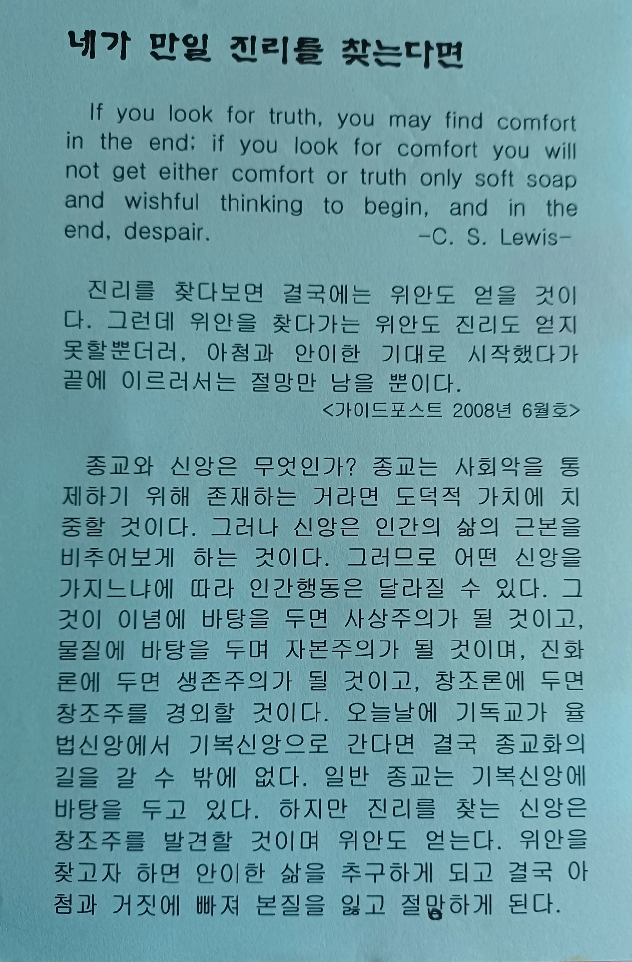 이 세상에는 많은 지식인들이 진리를 찾고, 진리를 논한다. 그런데... 진작에 진리는 어디에 있을까? 나는 예수가 많은 이적을 행하면서... 갑자기 제자들에게, "너희는 진리를 알라. 진리가 너희를 자유케 할 것이다."라고 말했을 때에 크게 놀라고 감동을 받았다. 그리고 여기서 나는 크게 깨달았다. 그 후로 나는 세상적 관념, 이념과 사상으로부터 자유할 수가 있게 됐다.