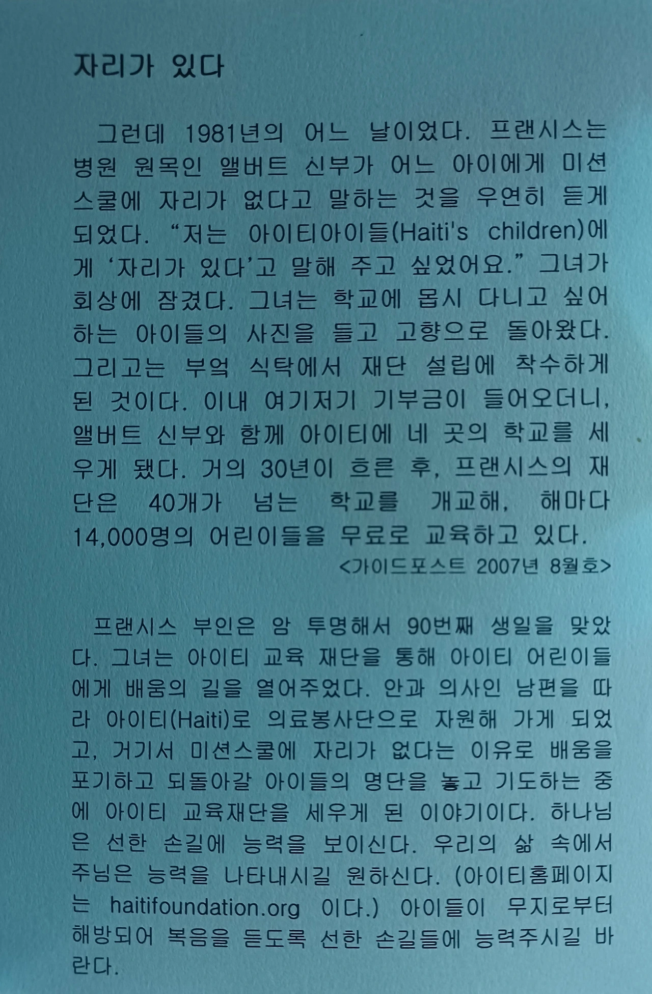 요즘은 학교 가기를 애타게 그리워하는 부모나 아이들이 있을까? 이제는 학교가 없어서 배울 수 없다고 말할 사람은 없을 것이다. 그러나 우리나라(코리아)도 육칠십 년도에는 학교가 부족했고, 형편이 어려워서 학교를 못 다니는 아이들이 많았다. 칠십 년대에 내가 대학시절에 삼 년 동안을 야학학교에서 아이들을 가르쳐 왔었던 것이 생각이 난다. 그때에 제자들 몇 명은 지금도 소식을 듣고 있다. 또한 기독교 교사회(TCF)에서 수련회 중에 교사들의 소망나누기 중에 '기독교교육을 하고 싶다, 그런 학교가 있으면 좋겠다.'는 소리를 수년간 들었다. 아무도 실천해보려고 하지를 않았다. 그때 나는 야학활동 봉사를 해온 경험을 바탕으로 해보자고 했다. 그래서 여름방학과 겨울방학을 이용해서 기독교 교육을 하는 실험학교를 추진했었다. 놀랍게도 많은 학부모와 학생들이 반겨주고 기뻐했었다. 언론에서도 관심을 가져서 신문과 방송에 까지 보도되어었다. 그런데 기독교 교사회의 지도교사가 중단할 것을 요청해서 중단하고 말았다. 그런데 놀랍게도... 그 후에 교육기관에서 학교 부적응 학생을 위한 대안학교에 대한 정책이 나왔다. 지금도 그때가 아쉽고 그립다. 지금의 한국 교육은 아이들의 생지옥을 만들어 버렸다. 인간교육이 아니라 생존교육으로 변질되어버린 것이다. 거기에다 이념교육까지 덮어지고 있다는 것에 매우 심통하고 애절함을 떨쳐버릴 수가 없다. 이런 현실에서 프랜시스 부인과 같은 용기 있는 학부모가 나서 주길 기도할 뿐이다. 분명 하나님은 선한 일에는 능력을 주신다. 그때 실험학교에서 체험한 증인으로써 다시 외치고 싶다. 선한 아이들을 위해 참된 교육으로 회복되기를 소망한다.(추신: 80년대에 참 교육 운동이 있었다.. 그러나 변질되어 전교조의 토양이 되어버렸다)