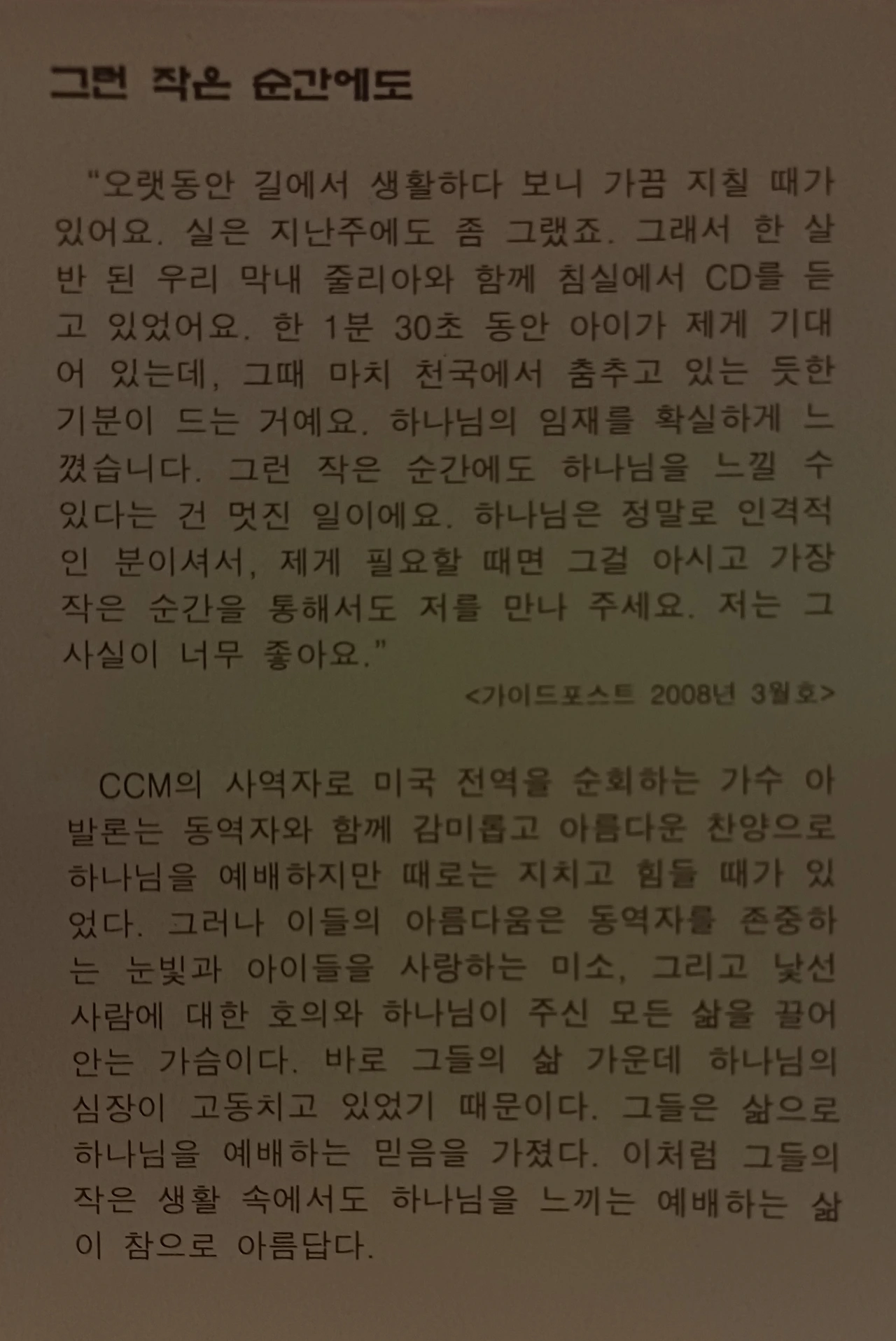 그렇다. 보이지 않아도 볼 수 있는 것은 믿음이다. 아이가 홀로 담대히 걸을 수 있는 것은 부모가 옆에 있기 때문이다. 곧 눈에 보이지 않으면... 아이는 부모를 찾고 두려워한다. 어릴 적에 국민학교 시절에 고아원에 사는 같은 반 친구가 있었다. 그 친구는 멋진 장난감을 자주 가져와 자랑을 한다. 나중에 알았지만, 미국으로부터 후원자들이 고아원에 보내준 것들이었다. 그땐 나도 고아원이였으면 하는 소망을 가져본 적이 있었다. 그러나 그 친구는 왜 학교에 그런 걸 가져오는지 한참 뒤에 알게 됐다. 부모가 없는 아이들은 어떤 것으로도 충족하지 못하고, 늘 갈망하는 습성이 있다. 그때에 난 그 친구의 눈을 보고서야 알게 되었다. 그런 후 난 그 친구를 더욱 믿어주었다. 이와 같이... 세상 사람들의 눈빛도 비슷함을 알았다. 왜 사람들이 난폭하고 잔인하고 방황하는 걸까? 바로 진정한 부모 같은 분이 없기 때문이다. 그러나 여기... CCM에서 사역하는 분들에는 전역을 돌아다니면서 찬양으로 하나님을 경배하고 전하는 삶이기에... 이들은 항상 하나님을 의식하며 사는 것이 아닐까? 그러므로 지치고 힘들어도 곧 치유되고 회복되는 이유는 하나님을 느끼면서 사는 삶이기 때문이 아닐까? 아이가 항상 옆에 부모가 있는지를 느끼듯이 말이다. 이러한 삶에는 참으로 아름다움을 지니고 있다. 그러므로 행복이 보이는 것이다. 이러한 믿음은 산 믿음이며, 거룩한 믿음인 것이다.(거룩한 믿음이란 의심 없는 확실한 믿음을 말한다.)