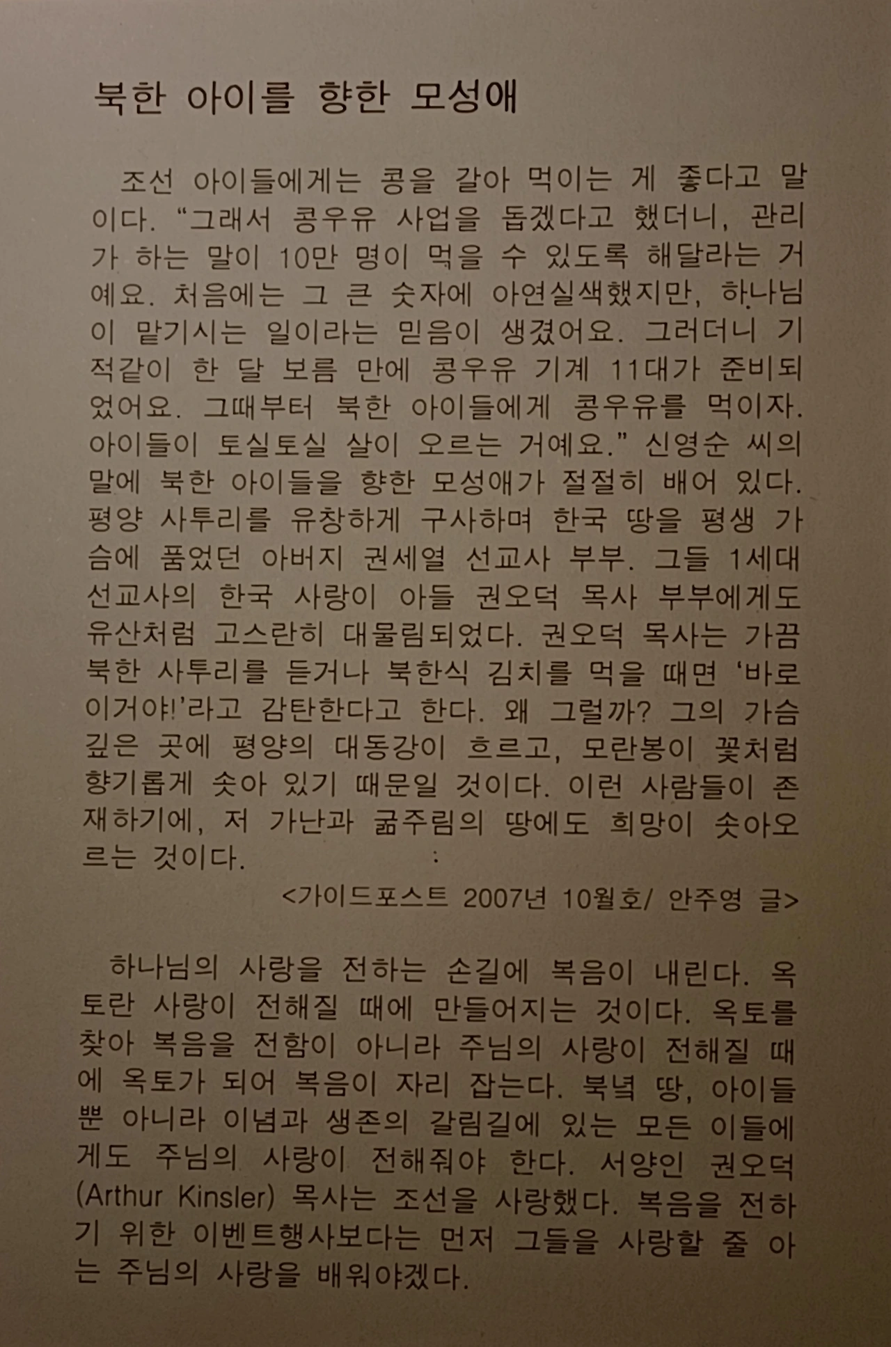 실향민에게는 북한 이야기만 들어도 눈물을 흘린다. 해방 직후에는 북한은 남한보다 잘 살았다. 일제 말기에는 한반도의 북쪽에 산업화가 잘되어 있었다. 그리고 부자와 지주들에게서 재산을 압수한 북한 정부는 인민들에게 배급제로 고루 잘 살 수 있었다. 한편 남쪽에는 주로 농촌지역이 많았고, 조선 양반의 후예들이 많았다. 그래서 매우 가난했다. 대동아전쟁 시 일제국은 배급제를 실시해 왔었다. 해방 후 북한은 배급제에 익숙해져 긍정적으로 호응했다. 남쪽에는 빈부차가 커지고, 부정부패가 농후하였다. 그 당시 한 노인은 이렇게 말했다. 왜정 때는 배급을 정확히 했고, 약속을 지켰다. 이제는 남한은 산업 발달로 부유해졌다. 그러나 북한은 착취한 재산으로 20년을 넘기지 못해 빈곤해졌다. 이들의 해법은 부유한 남쪽의 재산을 뺏는 것이다. 남한이 부유해지자 김일성은 걱정할 것 없다. 우리가 빼앗으면 된다. 그래서 간첩을 보내고, 사상교육을 해온 것인 셈이다. 그러나 이념을 넘어서는 힘은 모성애인 것이다. 북한의 아이들에 대한 모성애가 아이들을 지킬 수가 있었던 것이다. 권오덕 목사 부부는 이런 모성애 같은 선교를 했기에 가난과 굶주림의 땅에는 희망이 생기게 된 것이다. 이것이 기독교의 복음에 힘인 것이다. 모성애처럼 자비와 헌신이 바로 예수 그리스도의 십자가의 마음인 것이다. 하나님의 사랑을 모성애로써 깨우칠 수 있는 것이다. 그래서 하나님은 세상을 사랑하기를 독생자 아들을 내어주어 십자가에 죽음으로 하나님의 사랑을 보여주었고, 역사 속에 증거를 삼으셨다.
