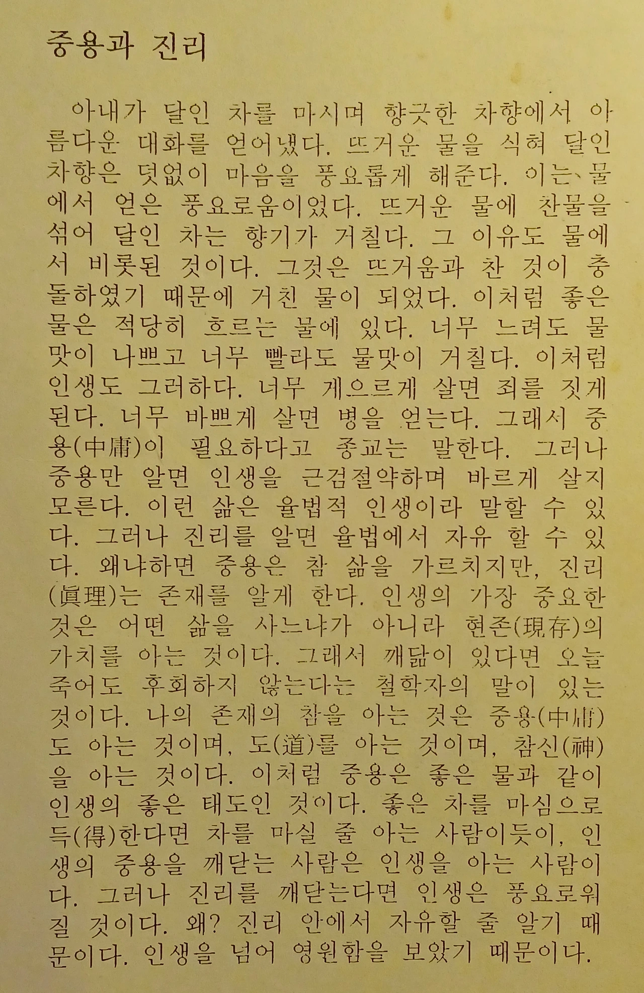 커피를 즐기던 나에게 아내와 첫 데이트를 하던 중에 명동에 있었던 유네스코 건물에 있는 멋진 고급스러운 찻집으로 나를 인도했다. 그것이 나로 하여금 전통차를 첫 입문하는 계기가 되었고, 그 후 40년간 녹차를 즐겼다. 결혼 후 가정에서도 아내가 달인 차를 마시곤 했었다. 차향을 잊을 수 없다. 산을 좋아하는 나로선 차향을 통해 산속 풀향기를 떠오르게 했다. 차맛에는 물이 중요하다. 옛 선비들이 차를 즐기면서 물 좋은 곳을 찾아다녔다는 이야기도 들었다. 그 후 인사동 옆 조계사 내에 있는 산중다원을 자주 찾아갔었다. 거기서 가끔 스님과 마주 앉아 차를 마시며 불교와 기독교에 대한 대화도 나누고, 불교에 경허스님에 대한 이야기도 나눴던 것이 생각난다. 불교에서 해탈은 마음을 비우는 건만은 아니란다. 인간의 욕심을 버리고 자비의 마음을 채우는 것이라 했다. 그리고 자비를 채우기 전에 중용의 자세도 중요하다고 했다. 그래서인지 불교의 스님은 기독교인 나와 서슴없이 대화를 할 수 있음은 곧 중용의 태도를 갖추었기 때문임을 깨달았다. 서로 생각이 다르다고, 취향이 다르다고, 이념이 다르다고, 종교가 다르다기 때문에 등을 돌리거나 외면하거나 경계하는 것은 중생들이나 하는 짓이라고 했다. 해마다 4월이면 햇차가 나오는 시기여서 절에서 차례를 연다고 해서 몇 번 찾아가 동석한 적이 있었다. 햇차를 부처께 드리는 차례인 것이다. 일본에서는 히데요시의 시대에 차 행사를 거대하게 열렸다. 그 후로 일본식 다도법이 생겼고, 역으로 한국에 도입되었던 것이다. 원래 고려시대에 차 재배와 수출을 해왔으며, 까다로운 형식의 다도법은 없었다. 편이하면서 간편한 예도가 있었을 뿐이었다. 특히 스님들이 차를 즐기는 이유는 참선을 할 때에 졸음을 이겨내기 위함이었다고 한다. 차의 특징은 마음을 차분하게 한다. 반면 커피는 마음을 뜨겁게 한다. 따라서 녹차는 중용에 도움을 준다. 즉 마음을 다스리는 데에는 녹차와 중용이 매우 유익하다. 그러나 중용은 터득하는 것이지.. 즉 득도에 이루게 됨을 의미할 뿐이다. 그러나 진리를 득하여 얻어지는 것이 아니다. 성자나 군자들이 깨우쳤다 함은 진리가 아니며, 진리의 그림자를 안 것이다. 그 좋은 예로써, 석가모니가 손가락으로 달을 가리키며 말씀하실 때에 제자들은 달을 쳐다보지 않고 석가의 손끝만 쳐다보았다고 했다. 그 후에 제자들은 부처상을 바라보는 것보다 부처의 가르침에 마음을 두는 것이 중요하다고 스님을 말씀했다. 사실 그렇다. 범생들은 학자들이 가르치는 말에는 별 깊이 생각하지 않고, 그 학자만을 바라보며 만족하고 즐길 뿐이다. 가수나 배우의 노래와 연기엔 관심 없고 가수와 배우만을 바라보며 만족하며 팬이라 한다. 이러한 사람들에게는 진리는 거리가 멀뿐이다. 그들은 자유하기보다는 추종하고 종속되는 것에만 온정을 쏟을 뿐이다.
