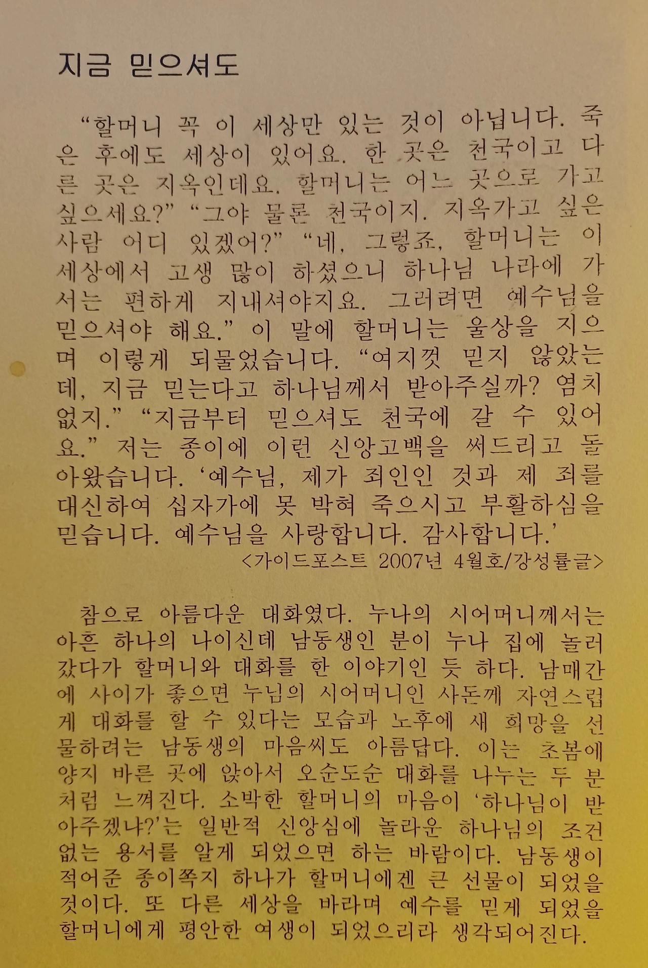 예수는 세례 요한에게서 물세례를 받은 후에 하늘로서 음성을 들었다. "너는 내 사랑하는 아들이다." 그 후에 예수는 마을을 돌아다니시며 제자를 찾고 병든 자를 고쳤다. 그러자 온 마을에 소문이 퍼지고 예수는 더 많은 일을 하시며.. 이렇게 말했다. "추수할 일은 많은데 추수할 일꾼이 부족하다." 세례 요한 때부터 추수할 영혼을 찾고 있었던 것이다. 여기서 아흔 하나이신 시어머니에게 며느리인 누나의 남동생이 사돈께 예수복음을 전하는 대화를 보며, 하늘에 계신 예수는 기뻐하셨을 것이다. 구십 평생을 믿지 않다가 아흔이 넘어서 믿기에 죄송한 마음을 말한 사돈어른께, '예수님, 제가 죄인인 것과 제 죄를 대신하여 십자가에 못 박혀 죽으시고 부활하심을 믿습니다. 예수님 사랑합니다. 감사합니다.' 이렇게 종이에 적어주시고, 읽으시고 고백하도록 해 줌으로 사돈 어르신을 구원하게 하고, 천국으로 인도한 지혜로운 전도에 감격하며... 이처럼 아름다운 대화가 어디 있을까? 절로 나도 고백하며, 감사하며, 감화를 받는다. 하늘에 계신 예수님도 기뻐하셨을 것이라 생각된다. 누구나 어디서나 어느 때나 구원의 문을 열려있고, 주님은 여전히 기다리시고 계신다.