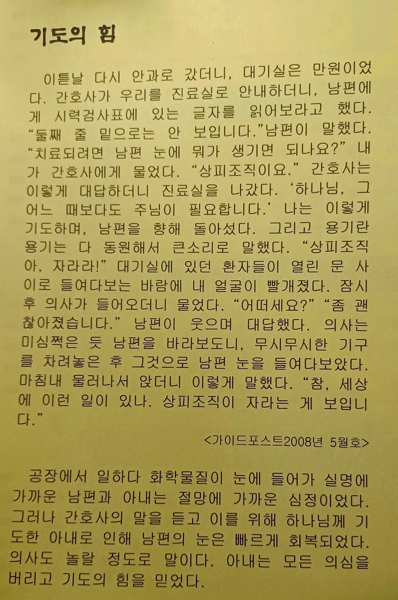아멘, 아멘! 성경 속에 스토리인 줄... 그렇게 반신반의하는 현대인의 크리스천? 문명이란 현실 속에서 살기에 더욱 믿어지지 않는 내적 불신... 아무리 입술로 믿어요 외친 들.. 내심 불신 의식을 감출 수 없는 진실성.. 그것은 어떤 인간도 거짓으로 포장할 수 없다. 스스로 문명인이기에 매우 현명한 척할지라도.. 내적 소리를 감출 수 없다. 그것은 본인과 하나님만 명확히 알고 있다. 그러므로 기도의 힘은 과거적 히스토리에 제한된 우스갯소리가 아닌 것이다. 공장에서 화학물질이 눈에 튀어 눈동자의 상피조직의 회복력이 아내의 진실함의 외침 기도가 현실로 나타날 줄을 믿을 수 있는 사람이 얼마나 될까? 자칭 문명인임을 의식하는 현대인들에게는 더욱 믿어지지 않는 일이다. 그러나 이천 년 전이나 지금도 일어날 수 있다는 믿음은 내적 진실함의 힘인 것이다. 여호와 하나님은 정말 살아계신 분이시다. 또한 부활하신 예수님도 역시 살아계신 주님이시다. 그 아내는 정말 주님이 그렇게 하실 것이라 믿었던 것이었다. 지금도 이와 같은 기적을 당연히 일어난다. 살아계신 하나님은 진실한 기도에는 거절하지 않으시고, 아니 못하신다. 이처럼 진실한 기도의 힘은 살아있는 것이다. "아내의 발목 수술도 주님의 도움이 필요합니다. 나도 그렇게 주님이 하실 분이라 믿습니다. 아멘."