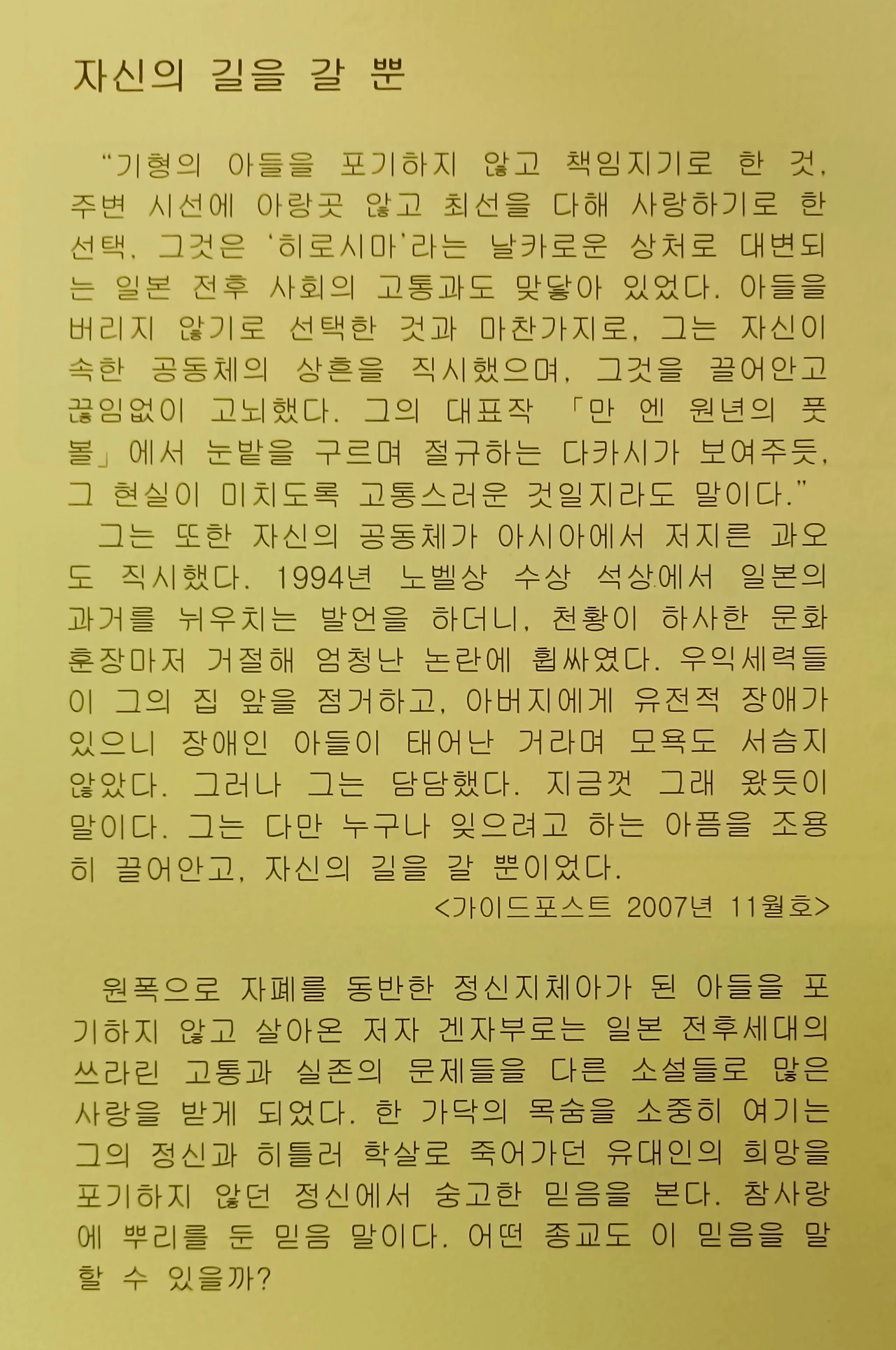 참으로 놀랍고 존경할 뿐이다. 가장 비열한 인간은 어떤 인간일까? 자신의 길을 걷지 않으면서 늘 타인을 훑고 비난하고 간섭하려 하는 인간들이다. 요즘은 트위터나 SNS를 통해 맹 비난과 폭언과 저주까지 집요하게 하는 인간들이 많다. 결국은 자살해서 죽게 만든다. 그리고 양심 없는 뻔뻔하게 살고 있다. 만일 인생이 여기서 끝나고 내세가 없다면.. 저런 비열한 자를 누가 심판할까? 나는 확신한다. 인간은 동물과 달라서... 왜? 의식이 있는 존재이기 때문에.. 반드시 그 비열한 인간들에 대해 심판을 한다고 믿는다. 참다운 인간이라면 자신의 인생길을 가는 데에 충실할 것이다. 불과 백 년도 되지 않은 과거의 세계 이차대전... 그 당시엔 전쟁과 죽음이 전부였다고 할 것이다. 저자의 아들, 원폭피해로 자폐와 정신지체가 된.. 그렇지만 자신이 전쟁범이 아닐 텐데.. 전쟁으로 인한 피해.. 일본의 과거에 대해 뉘우치고 글로써 그 고통을 통감하는... 그리고 노벨 수상 석상에서 일본의 과거를 뉘우친 발언까지 하며, 천왕이 주는 문화훈장을 거절한 것 때문에 우익들에게 맹비난을 받으면서도... 담담하게 아픔을 끌어안고 자신의 길을 가는 모습은... 그가 독일의 히틀러에 의해 죽어간 유대인들의 모습에서 그들의 숭고한 믿음을 보았던 것이다. 지금도 유대인은 자신이 유대인임을 나타내게 했던 별 마크나 머리에 쓴 키파를 아직까지 하고 있다.
