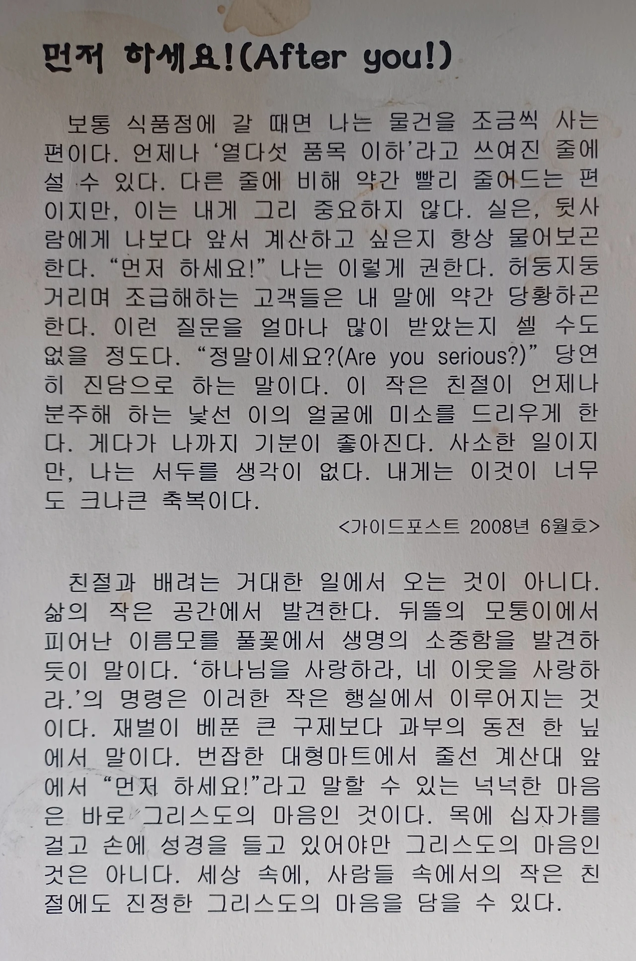 오늘은 바깥도 덥지 않고, 실내는 서늘하여 창문을 열고 혹시나 하고는 더운 바람을 바랐었다. 그러나 더 찬 바람이 반바지를 입은 내 무릎을 치니.. 일어나 겨울 잠바를 주섬주섬 입었다. 그리고 봉투 속에서 엽서 한 장을 꺼내어 읽으며 창밖을 바라보았다. 흔히 볼 수 있는 마트 계산대에 줄지어선 고객들.. 표정들은 매우 조바심이 가득 찬 것 같았다. 어느 고객을 두루 살피더니 짧은 줄에 서는 것도 보았다. 난 늘 이해가 되지 않았다. 장을 볼 때는 느긋한 모습들이였던 고개들.. 계산대 앞에선 왜 안달일까? 한땐, 그런 생각을 해본 적이 있다. 혹 화장실 가려고? 학창 시절 때가 생각난다. 등굣길에 버스를 타려고 죽으랴 달렸는데 끝내 놓지고는 다음 버스를 기다리는 친구를 보고 미소를 던진 적이 있었다. 지각할 정도는 아닌데 말이다. 또한 횡단보도를 건너갈 때도 멀리서 달려와서 함께 건너가는 분들을 참 많이 본다. 왜 그럴까? 혹시 무덤으로 가는 길에서도? 저승 가는 길에서도... 그렇게 달려갈까? 나는 종종 혼자서 극장에 잘 가는 편이다. 즐겁게 영화를 보고는.. 끝나면 부랴부랴 일어나 급히 서들러 나가는 관객들을 바라보며.. 왜 그럴까? 아직 안 끝났는데.. 불도 안 켜지고, 음악소리와 출연배우 등 자막들이 계속 나오고 있는데 말이다. 그래서 친구들은 날 부르길..'도사'라고 부른다. 내가 너무 느긋하게 행동한다고 말이다. 정말 내가 거북처럼 느린가? 그래서 난 다른 친구보다 머리가 좀 부족할지도 모르지... 그리 생각을 가져었다. 그러나 여행을 좋아하는 나는 해외여행을 통해서 깨달은 것은 선진국일수록 여유롭게 행동하고 마음도 그래서 양보한다는 것을 알게 되었다. 오히려 여유를 즐기는 모습을 보고 놀랐다. 이러한 태도는 타인에게 친절과 배려를 보여줌으로써, 선한 관계를 낳게 된다고 생각했다. 한편, 나를 만나는 외국인은 코리아인임을 알고 하는 시늉..."빨리빨리~" 할 때마다 나의 얼굴은 화끈거리게 된다. 난 마음속으로, "조선 오백 년의 노예근성을 언제 벗을꼬~"라고 되새겨 보았다.