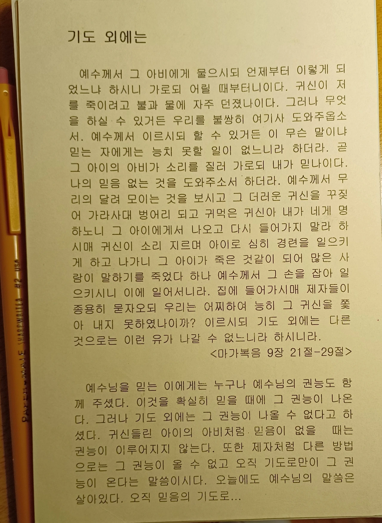 이 말씀, 예수가 변화산에서 내려왔을 때에 큰 무리에 둘러싸여 제자들과 서기관들이 서로 변론하고 있다가 예수를 보자, 귀신 들린 아들의 아비가 예수께 나와 "무엇이든 하실 수 있거든 우리를 불쌍히 여기사 도와주소서."라고 말하자. 예수께서 말하기를, "할 수 있거든이 무슨 말이냐. 믿는 자에게는 능치 못할 일이 없다."라고 말했다. 그때사 아비는 소리 질러 고백하기를, "내가 믿나이다. 내가 믿음 없음을 도와주소서." 하였다. 이 말씀에서 나 역시 동일함을 깨달았다. 나도 역시 이 아비와 같이 믿음이 적음을 깨달았다. 오늘날에도 하나님의 기적, 예수님의 기적, 믿음의 기적은 일어난다는 것에 대해서 온전한 믿음이 아님을 깨닫게 된다. 그뿐만이 아니라 평소에 기도할 때에도 입술로는, "주여! 믿사오니 내 기도를 들어주소서!"라고 하면서도, 내 속에 마음 깊은 곳에서는 의심이 일고 있는 것까지 의식하면서도 애써 아닌 척하려고 해도, 그렇게 온전한 믿음이 되지 않을 때가 태반이다. 그렇게 내가 아무리 온전한 믿음을 가지려고 해도, 내 속에 가득 찬 이념들이 나를 괴롭히고 있음을 느낄 수가 있었다. 한번 내 속에서 어떤 이념에 내 마음을 여는 순간 끝없이 솟아나는 의심과 불신이 샘솟듯이 솟아남을 느낄 수 있었다. 그러므로 철저하게 내 속에 꽉 찬 이념들을 다 털어내고 싶으나 그럴 수가 없는 것이 내 죄의 근성이다. 한번 내 뇌 속에 저장된 이념들, 사상, 전통, 문화, 경험 등등은 절대로 지워지지 않는다. 일시적으로 기억나지 않을 수는 있을 수 있겠으나... 절대로 완전히 지워지지 않는다. 심판 날에는 더욱 확실하게 선명하게 다 기억되고 드러나서 결코 핑계 하지 못하게 될 것이다. 치매? 망각? 그건 지워진 것이 아니라 기억하지 못할 뿐이다. 그러므로 더욱 하나님의 말씀을, 진리를, 예수님의 가르침을 확실하게 뇌에 저장하고, 의식하고, 인식하고, 되새기면서 나의 생각을, 기억을 지배하도록 날마다 묵상하며 힘써 믿음이 충만한 생활이 되어야겠다. 지금도 예수님 말씀대로... 믿는 자에게는 능치 못할 일이 없다고 하는 믿음이라면 이보다 더 큰 기적도 이루어질 것이다고 깨닫게 된다.믿음은 선물이다. 내가 믿어줄께, 내가 믿어, 그런다고 믿음이 되는 게 아니다. 아무리 입으로 그렇게 고백해도, 그 속에서는 아니라고 말하고 있어. 믿음은 선택하는 조건이 될 수 없다. 믿음은 오직 진실한 자만이 받을 수 있는 선물이다.