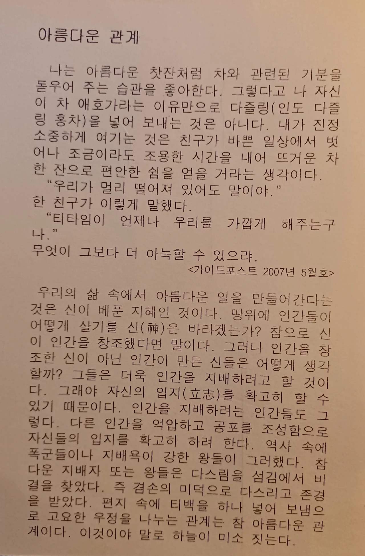 나는 사람들을 참 좋아한다. 그러나 얼마 못 가서 실망을 하게 된다. 직장에서도.. 학교에서도.. 동네에서도.. 등산 중에도.. 아니 전철이나 버스에서도.. 번잡한 도시 거리에서도.. 나는 카페에서 창가에 앉아 커피를 마시며.. 길을 가는 사람들을 바라보면서도.. 참으로 사람들을 바라볼 때... "어찌 그리 아름다운가!" 나는 사람들에서 하나님의 모습을 보게 된다. 특히 어린아이들의 노는 모습을 보면 더욱 그렇다. 그러다가도 뉴스나 신문 기사를 보았을 때.. 인간의 사악함을 보면 두려움에 분노를 느낄 때가 많다. 인간관계에서도... 처음은 매우 친절하던 분이.. 점점 실망을 하게 하는지 모르겠다. 왜? 인간은 악한 짓을 하는 걸까? 그래서 나는 산을 좋아한다. 산은 내게 악한 짓을 하지 않기 때문이다. 더욱 친구라면... 서로 좋은 것을 나눌 수 있어야 하지 않을까? 왜? 거짓된 짓을 하는 걸까? 사람에게는 참 아름다운 모습이 가득하다. 가만히 벤치에 앉아 있는 모습도 아름답고... 우산을 쓰고 빗길을 걷는 모습도 아름답고.. 특히 웃는 모습은 얼마나 아름다운가! 여기 엽서의 글을 읽으며... 참 아름다운 모습을 보게 된다. 친구에게 큰 선물은 아니어도.. 조용한 시간을 내어 쉼을 얻으라고 차를 보내는 그 손이 얼마나 아름다운가! 그런 작은 관심.. 친절.. 배려심.. 사람만이 할 수 있는 아름다움인 것이다. 이런 모습을 인간을 창조하신 그분은 매우 기뻐하실 게다.