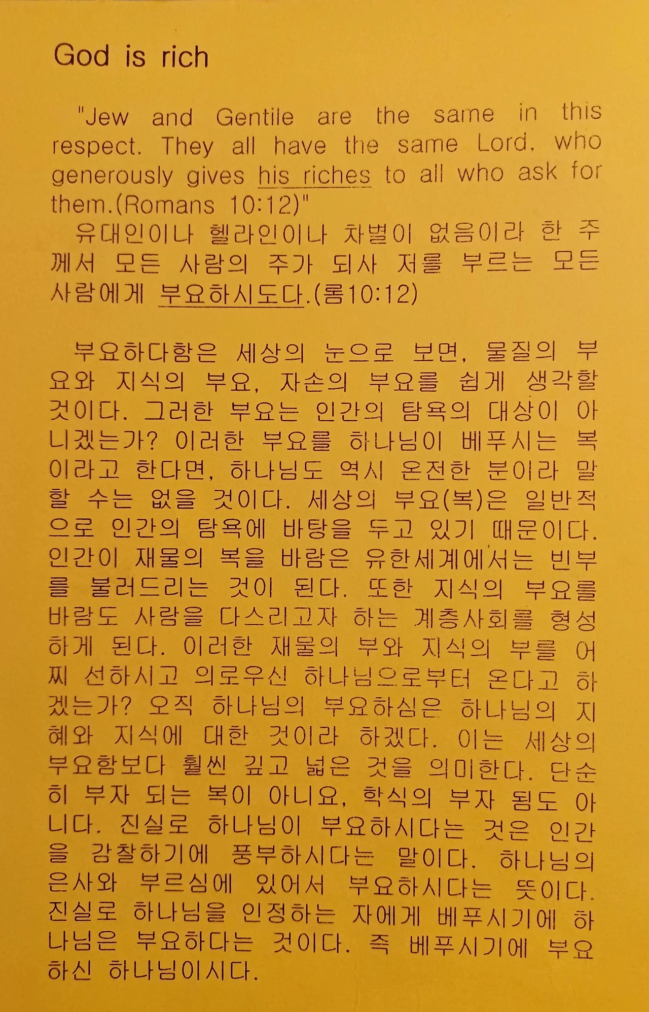 창조주 되신 주 하나님은 모든 사람에게 부유하심은 베푸시는 자비와 은사로써 주시기를 아끼지 않으신다는 말씀이다. 진정 주의 은사를 받은 사람이라면, 주의 부유하심이 무엇인지를 알 것이다. 세상을 쫓는 인간들이 추구하고 갈구하는 욕망의 주머니는 구멍 난 것으로 채워도 채워도 만족하지 않는, 못하는 근본 뿌리는 인간의 교만인 것이다. 그 증거가 북한의 한 악인을 보면 이해가 될 것이다. 인간의 교만의 형태는 자연이 아닌 인간 위에서 벌벌 떠는 인간들을 바라보며 쾌락을 즐기려는 악성인 것이다. 인간의 교만은 형태도 없고, 부피와 무게도 측정할 수 없는 어둠의 실체이다. 이 인간의 교만은 오직 인간만을 향해 겨냥하고 있는 기관총과 같다. 왜일까? 왜 인간의 교만이 인간을 향해 있을까? 그것은 창조주 하나님에 대한 질투이기 때문에.. 하나님이 가장 관심 많고, 사랑하는 인간이기 때문이다. 이런 인간에게는 재물의 부유, 지식의 부유, 자손의 부유(근대적 사고방식)의 3대 부유를 추종하는 이유는 모든 인간이 추구하는 것이기 때문이다. 이러한 3대 부유도 역시 유한적일 뿐이다. 그러므로 빼앗고, 죽이고, 짓밟고 그러는 악한 것이다. 그러나 하나님의 부유함은 선하며, 의롭고, 참되며, 영원한 것이다. 그 대표적인 것이, 예수가 우물가에서 사마리아 여인과 대화한 내용이 말해준다. "내가 주는 물을 마시는 자는 영원히 목마르지 아니하리니, 내가 주는 물은 그 속에서 영생토록 솟아나는 샘물이 되리라."(요한 4:14)... 이제 알기를, 하나님의 부유함이란 예수가 사마리아 여인에게 한 말씀과 같다.