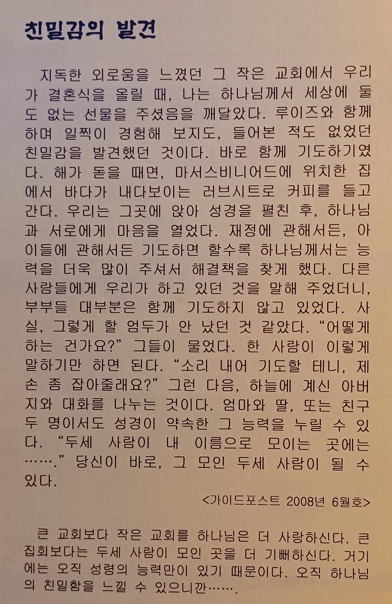 여기 작은 교회에서 결혼식을 한 두 사람이 깨달았던 친밀함에는 참 사랑의 진실성이 느껴진다. 요즘에는 가정에서, 교회에서, 학교에서, 직장에서, 동네에서 얼마나 친밀감을 느꼈을까? 잘 살지 못했던 옛날에는 이웃에서 친밀감을 느껴었다. 하물며 뉴스를 보고도 친밀감을 느껴었다. 그런데 가끔 거리에서 남녀의 연인들을 보게 되는데.. 어색한 모습을 많이 보게 된다. 어떤 때는 걱정이 될 때도 있었다. 대화도 매우 부자연스럽다. 아니... 요즘 티브이 드라마는 더 심하다. 도대체 진실성은 찾아보기 어렵고 가식과 위선을 얼마나 멋들어지게 연출하느냐에 비중을 두는 것 같았다. 친밀감은 진실한 관계일 때만이 느낄 수 있는 것이다.