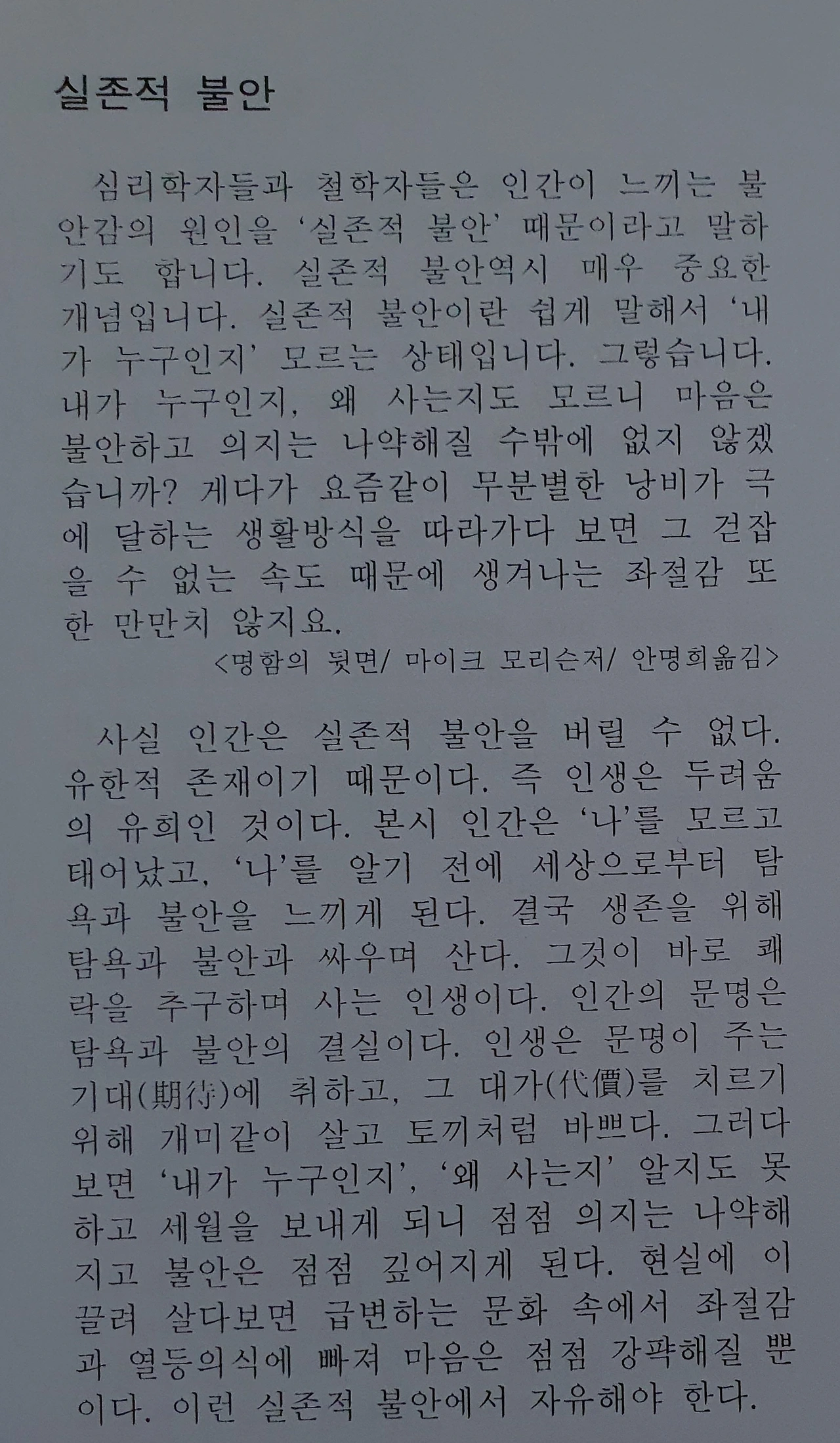 불안을 잊으려고, 외면하려고 인간들은 온갖 수단으로 해답을 찾으려고 해 왔다. 최초의 불안을 느낀 인간은 아담일 게다. 그다음으론 가인일 게다. 그 후로 인간은 불안을 극복하려고 모여들었다. 그 대표적인 것이 홍수 이후에 바벨탑을 쌓는 일에 몰두했다. 그러나 인간은 보이지 않는 불안에서 보이는 자로부터의 불안에 빠지고 말았다. 그러한 인간사회? 한 통치자의 지배를 받으러 불안 속에서 불안을 잊으려고 해 왔다. 그래서 독재자나 폭군이 생겨났고, 극도의 불안통치로 인간들을 지배하고 유지할 수가 있었던 것이다. 그 통치와 지배의 불안 속에서 충성맹세를 통해 불안을 잊으려고 했다. 그런 역사는 얼마든지 찾을 수 있지만, 대표적으로 쉽게 이해할 수 있는 집단, 즉 깡패집단이나 조폭집단에서 불안해하는 인간들의 두 가지 현상, 그 불안 속으로 깊이 들어감으로 불안을 일시 망각하려는 심리, 또는 점점 더 포악해지는 것으로써 불안을 대체하려는 심리로 볼 수가 있겠다. 그러므로 짐승보다 더 불행하게 살고 있는 것이다.