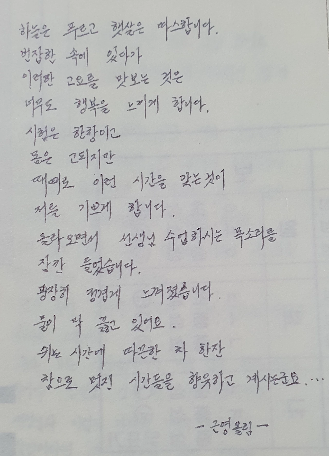 오늘은 수첩들을 정리하다 수첩 속에 고이 간직된 메모지에 글... 조용하고 소심한 성품을 가진 그러면서 생각이 깊고 진솔한 여제자로부터 받았던 쪽지 글... 다시 읽어보니 왠지 부끄러움이 맴돈다.