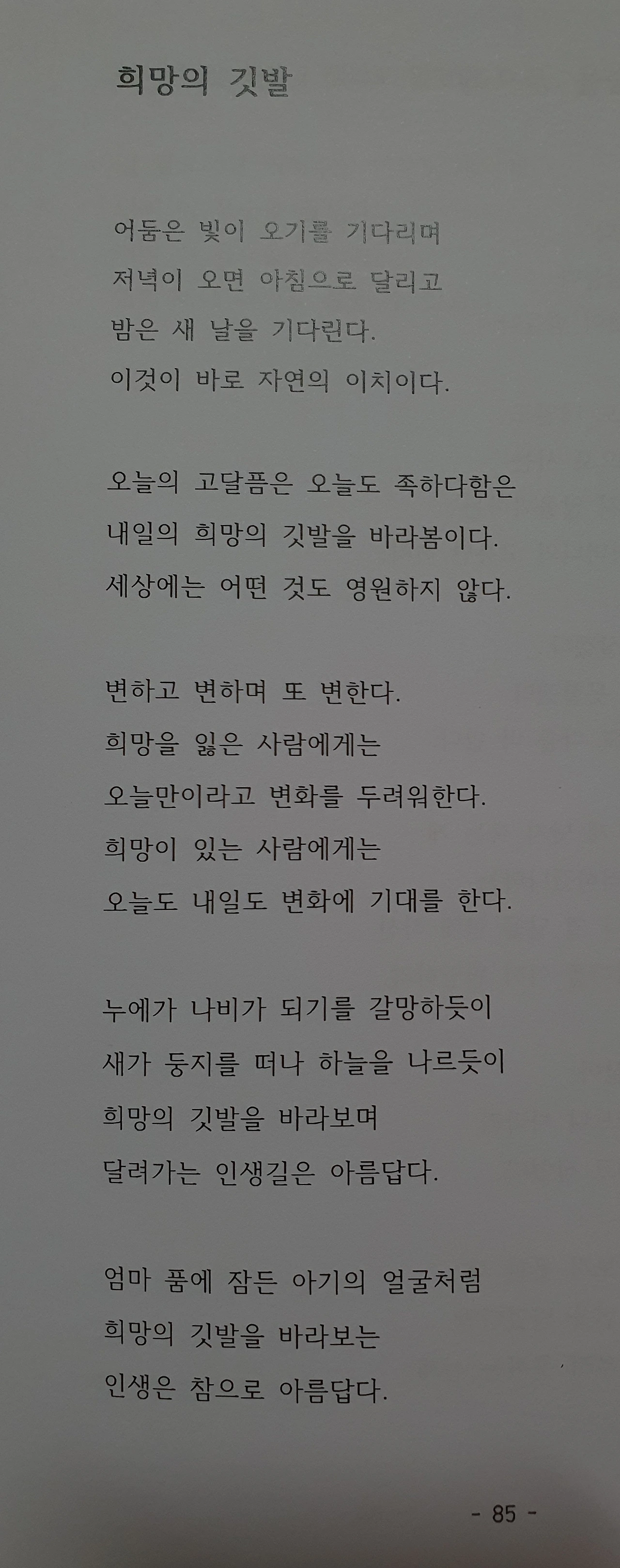 그럴 할지라도, 희망을 잃어서는 안 된다. 왜냐하면, 그 희망은 자아를 꿈틀거리게 해 준다. 그래서 나는 희망의 깃발을 높이 들고 싶었다. 희망은 믿음을 끌어내고, 사랑의 능력이 일어나게 하기 때문이다. 그래서 희망의 깃발을 바라보는 인생으로 살아간다면.... 그 모습이 아름답게 될 것이라 믿는다. 왜냐하면, 이 어둠의 세상에는 참된 것이 더욱 빛을 낼 것이기 때문이다. 그래서 어둠은 결국 빛이 오게 할 수밖에 없다.