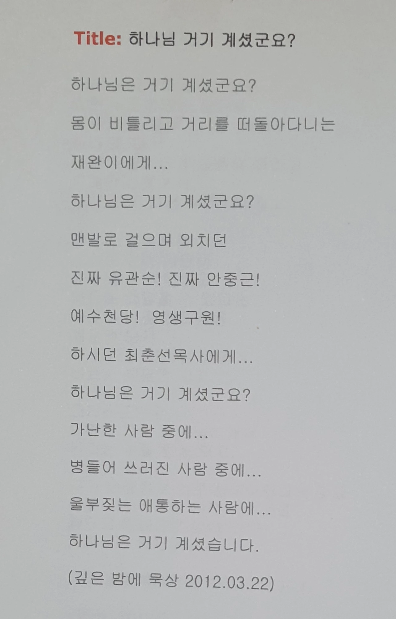 "아~ 하나님은 거기 계셨구나! 최목사님은 혼자 맨발로 다니신 것이 아니었구나! 예수님도 함께 하셨구나!"