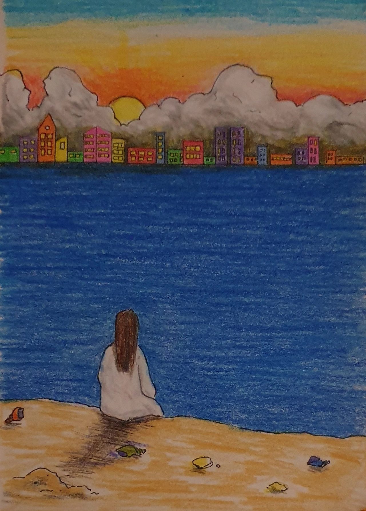 그때에 구름 속으로 숨어들려던 해가 모래사장에 앉아 있는 소녀를 발견했다.