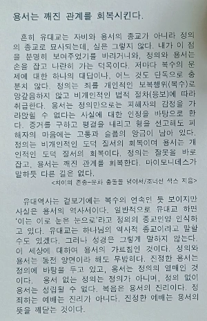 그러나 성경은 그렇게 말하지 않는다. 이 세상에 대하여 용서의 가르침인 것이다. 정의와 용서는 동전의 양면이라 해도 무방하다. 진정한 용서는 정의에 바탕을 두고 있고, 용서는 정의의 열매인 것이다. 용서 없는 정의는 정의가 아니며, 정의 없이 용서는 성립될 수가 없다. 복음은 용서의 진리이다. 정죄하는 예배는 진리가 아니다. 진정한 예배는 용서의 뜻을 깨닫는 것이다.