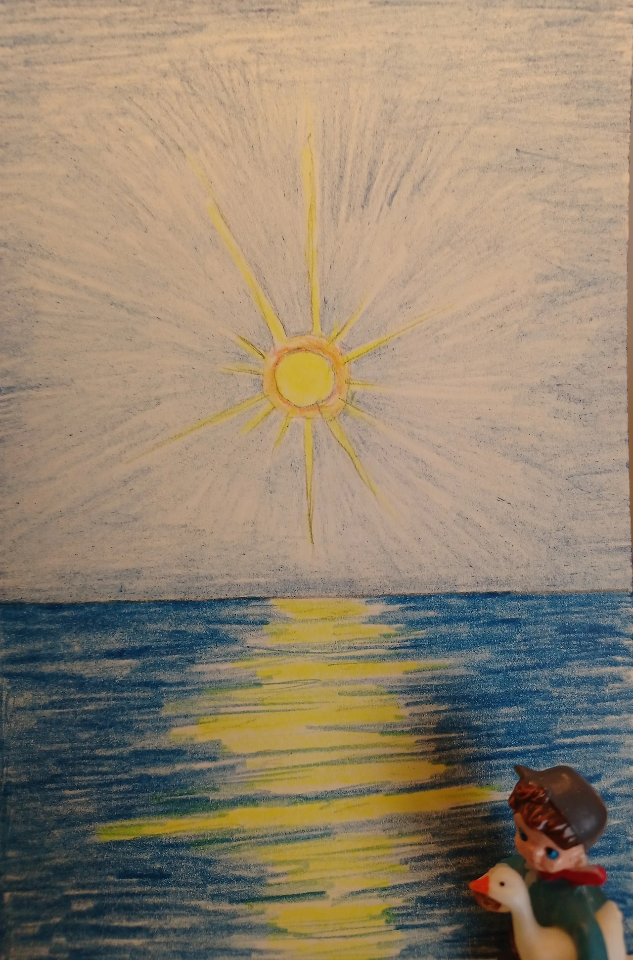 하늘에 해가 내리 비추니 하늘과 바다 속에 뭇 생물들이 깨어나고 빛아래에서 춤을 추며 즐거워 한다. 어린 아이도 오리와 함께 해아래 해변에서 기뻐 뛰며 즐거워 한다.