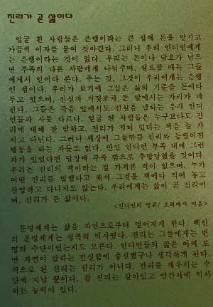 서양인들은 진리의 책을 갖고 다니며 찬양한다고 인디언이 말한 것은 매우 의미심장한 말이다. 실제로 그런 면이 없는 것이 아니다. 진리를 책으로 인식하는 자에게는 삶 속에서 진리를 찾지 않고 책에서 찾는다. 한편 성경과 성경책의 차이도 그렇다. 그래서 성경책은 거룩한 것이라고 함부로 해서는 안 된다고 신줏단지 모시듯 한다. 그러니 어떤 신자는 이렇게 말한다. 성경책을 착 펴는 순간, 거기에 쓰인 말씀으로 은혜가 되었다고 자랑한다. 이는 무엇인가? 하나님은 우습게 여기는 것이 아닌가? 이는 성경책이 진리라는 것이다. 그러나 성경을 믿는 사람이라면, 비록 성경책일지라도 그 속에 기록된 성경(거룩한 말씀)을 깊이 묵상하지 않겠는가? 인디언이 삶이 진리라고 했듯이, 그들은 삶을 소중하게 여긴다. 그처럼 성경을 진리로 믿는 사람은 삶을 소중하게 살 것이다. 삶? 자연에서 사는 인생에는 자연에서 진리를 보게 된다. 사람과 함께 사는 참 인생에는 사람에게서 진리를 발견하게 된다. 그것이 바로 인디언이 말하는 진리가 곧 삶이다.