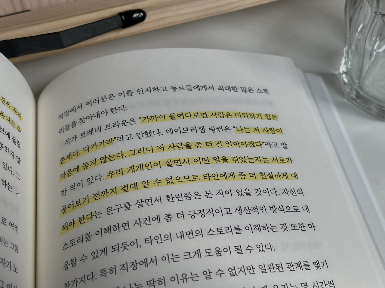 모든 사람은 고유한 스토리의 산물이다. 이를 인정하고 타인을 있는 그대로 바라보기란 결코 쉽지 않은 일이지만 '히든 스토리'가 도와줄 것이다. 첫 문장을 보고 떠오른, 나와 정말 맞지 않는 그 사람 때문에 스트레스를 받고 있다면 그가 아닌 나를 위해 그 사람의 스토리를 물어보고 대화를 나눠보자. 대화 속에서 그와 나의 스토리를 발견하고 서로를 이해하게 될 것이고 더는 스트레스받지 않고 공존하는 법을 깨닫게 될 것이다. 그에게 다가설 용기를 줄 책의 한 구절을 소개하며 글을 마무리하려 한다.