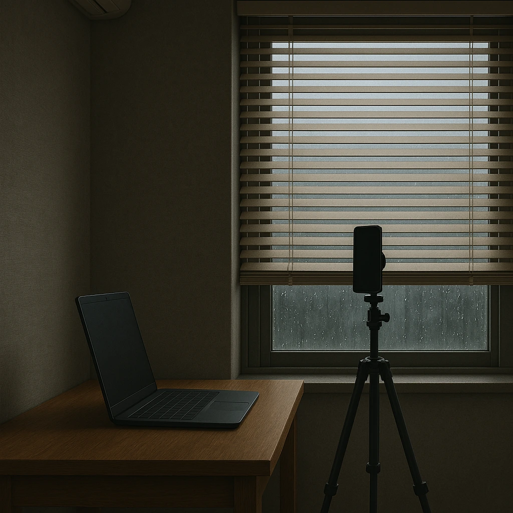 삼각대를 길게 뽑아 휴대폰을 장착한 뒤 노트북을 향해 비췄다.