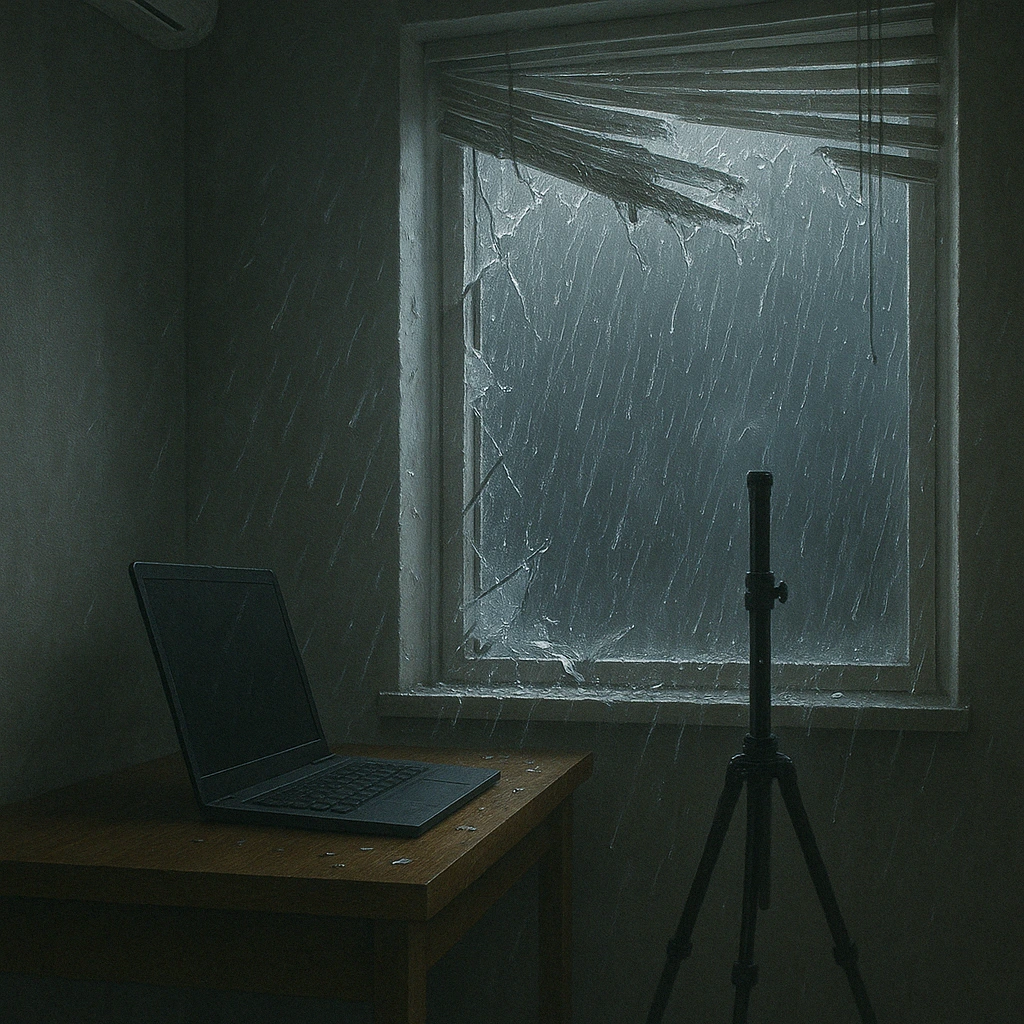 유리 조각이 방구석구석에 튀었고, 깨진 창문으로 비바람이 마구 들어왔다