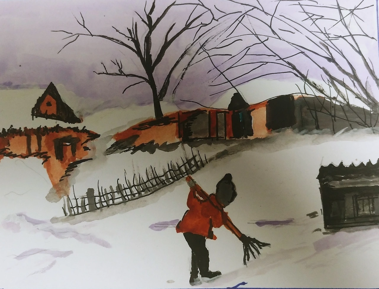 어머니의 그림 속에 화려한 겨울 풍경 대신, 묵묵히 눈을 치우는 '사람'이 주인공으로 서 있는 이유도 아마 여기에 있지 않을까 싶습니다. 눈을 치우는 행위는 단순히 바닥을 깨끗이 하는 작업이 아니라, 사랑하는 사람들, 사랑하는 것들에게 자리를 만들어 주는 일이 아닐까? 그 풍경 속을 안전하게 걸어갈 사람을 위한 것이 아닐까? 그런 어머님의 마음이 그림으로 표현된 것이라 생각합니다.