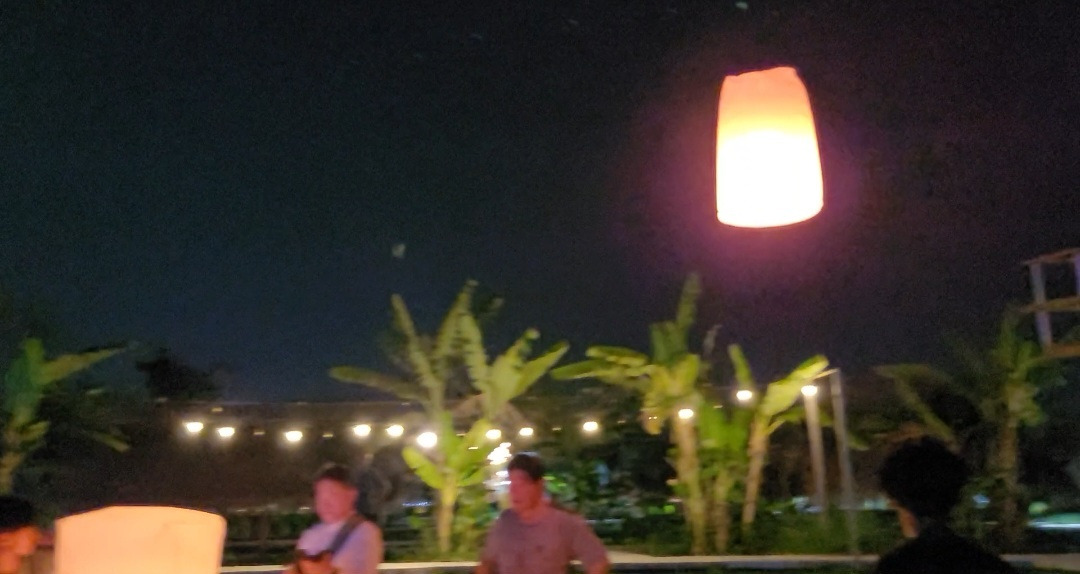 식사 끝나고 밤하늘에 풍등(風燈) 띄우는 이벤트가 있다. 작은 열기구 비슷한데 창호지로 만들어졌고 소원을 적어 밤하늘에 둥둥 띄우는 것이다. 중국, 대만이나 동남아 국가에서 명절이나 경사 때 많이 띄운다.