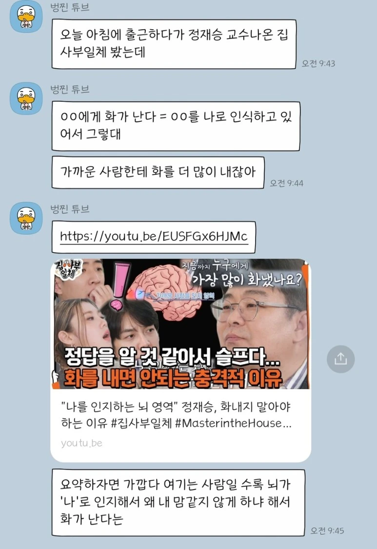 "오늘 아침에 출근하다가 정재승 교수 나온 <집사부일체>를 봤는데, 'oo에게 화가 난다'='oo를 나로 인식하고 있어서 그렇대. 가까운 사람한테 화를 더 많이 내잖아. 요약하자면 가깝다 여기는 사람일수록 뇌가 '나로 인지해서 왜 내 맘 같지 않게 하냐 해서 화가 난다는 얘기지"
