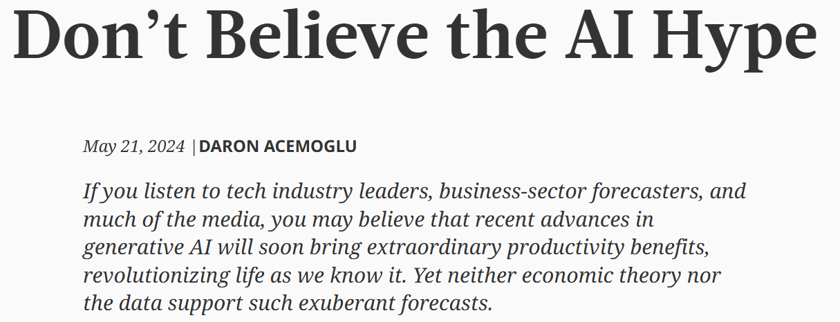 AI에 대한 낙관적 기대 중 하나는 AI의 엄청나게 발전하는 만큼 생산성을 엄청나게 향상시키고, 생산성이 엄청나게 좋아지면 인간의 삶도 풍요로워질 것이라는 기대입니다. 그러나 어떤 이들은 이 낙관론을 경계하고 있으며, 이에 관련한 글들도 많이 나오고 있습니다. 아세모글루는 AI 자동화가 기업들의 비용 절감에만 유리하지, 고용 감소 부작용을 우려합니다.
