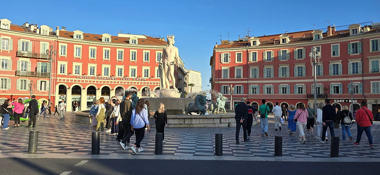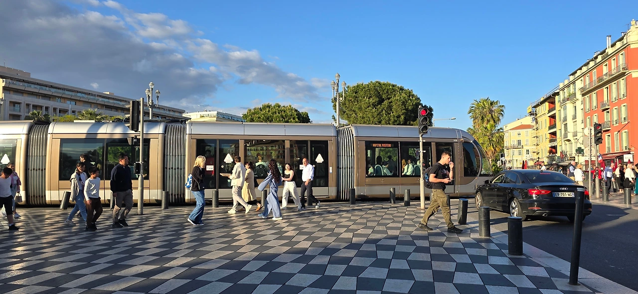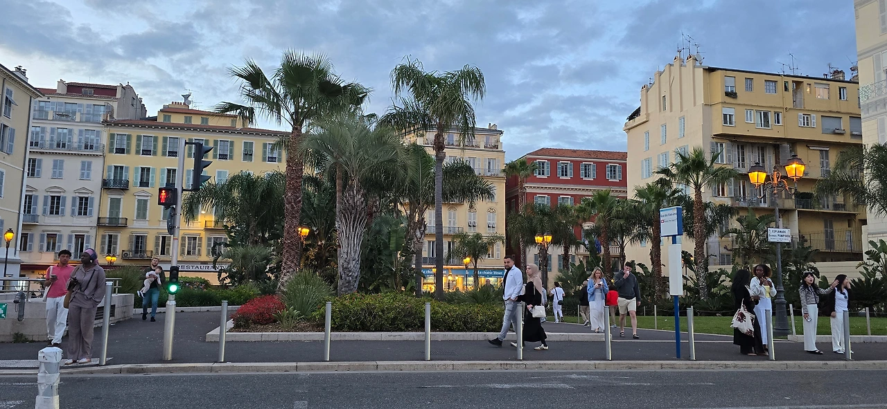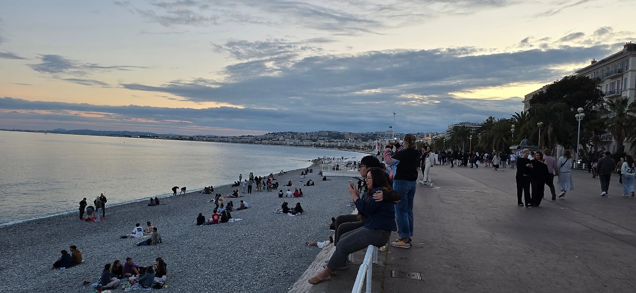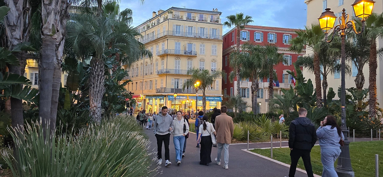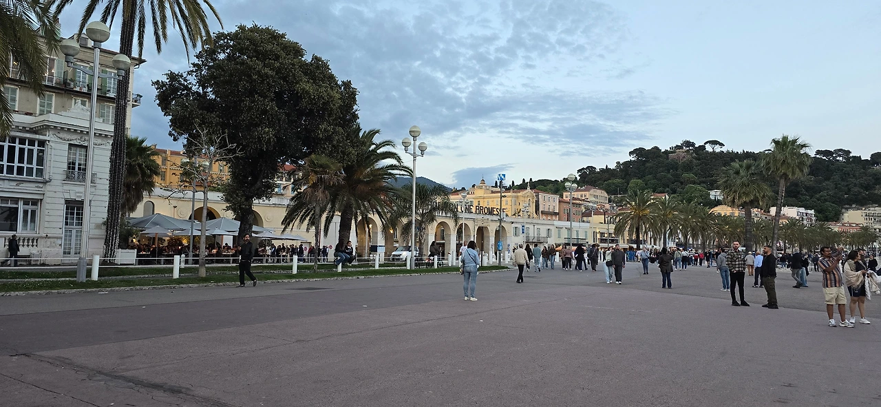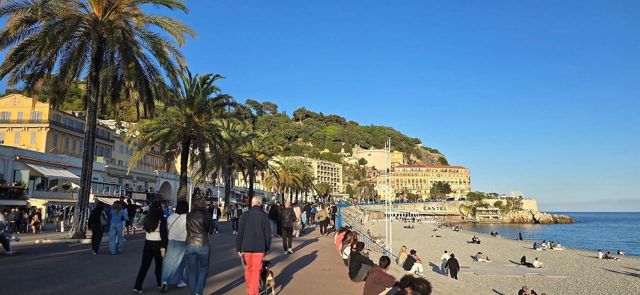 한가한 주택 지역을 10여분을 걸어가니 어디서 들 나왔는지 많은 사람들이 보이며, 한 곳을 향해 걸어가고 있다. 바다 쪽으로 가고 있는 것이 아닌가 하고 따라가니 커다란 대로가 나오고, 대로변을 따라 상가들이 밀집한 지역이 나온다. 카페, 식당, 의류점들이 즐비하다. 나이키, H& M, 버거킹, 맥도널드, 스타벅스도 나온다. 트램이 저 멀리서 들어오고 있다. 조금 더 나아가니 커다란 광장이 나온다. 광장 한편으로 트램이 빙 둘러 나간다. 마세나 광장이다. 다비드상이 서 있는 분수대도 나온다. 조금 더 남쪽으로 나아가니 식당과 기념품을 판매하는 상가가 나오고, 남녘에서 자생하는 키 큰 식물의 정원을 지나니 차로와 보도 너머로 마침내 탁 트인 바다가 보인다. 차로와 보드는 동서로 길게 뻗어 있는데, 폭 10여 미터 내외의 널찍한 보도인 영국인 산책로는 해안을 따라 잘 단장되어 있고, 그 아래로 지중해 푸른 바다가 남실남실 폭 100m 정도 되는 해변 자갈밭을 쉴 새 없이 드나들며 가없이 펼쳐져 있다.