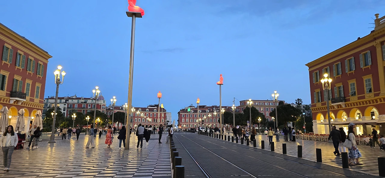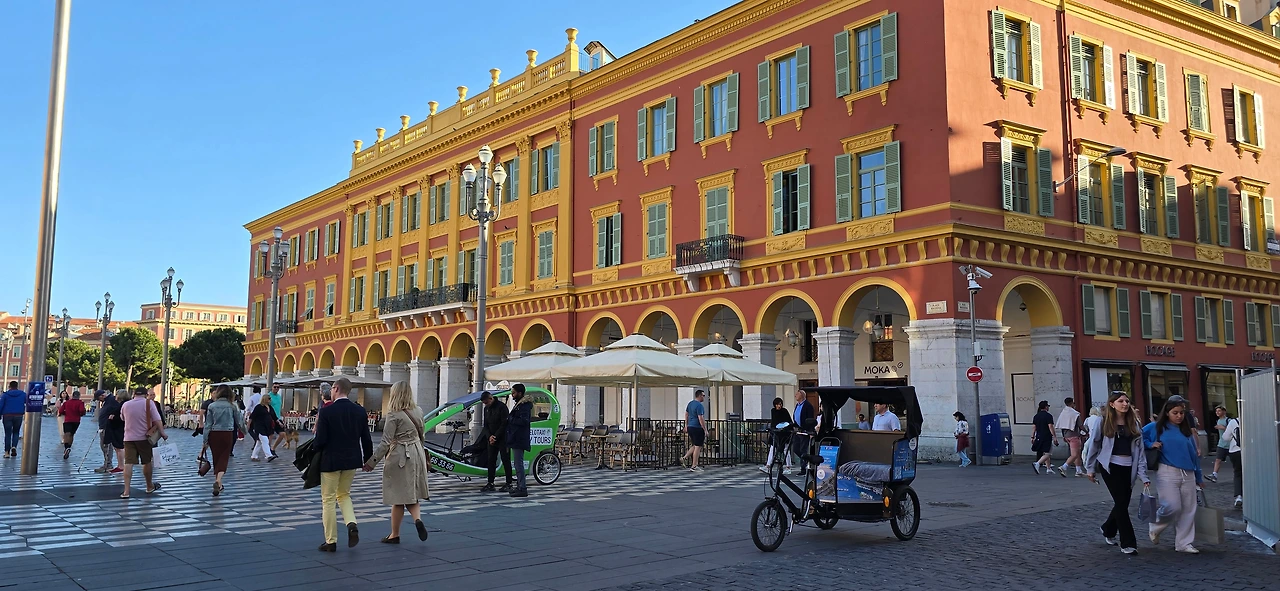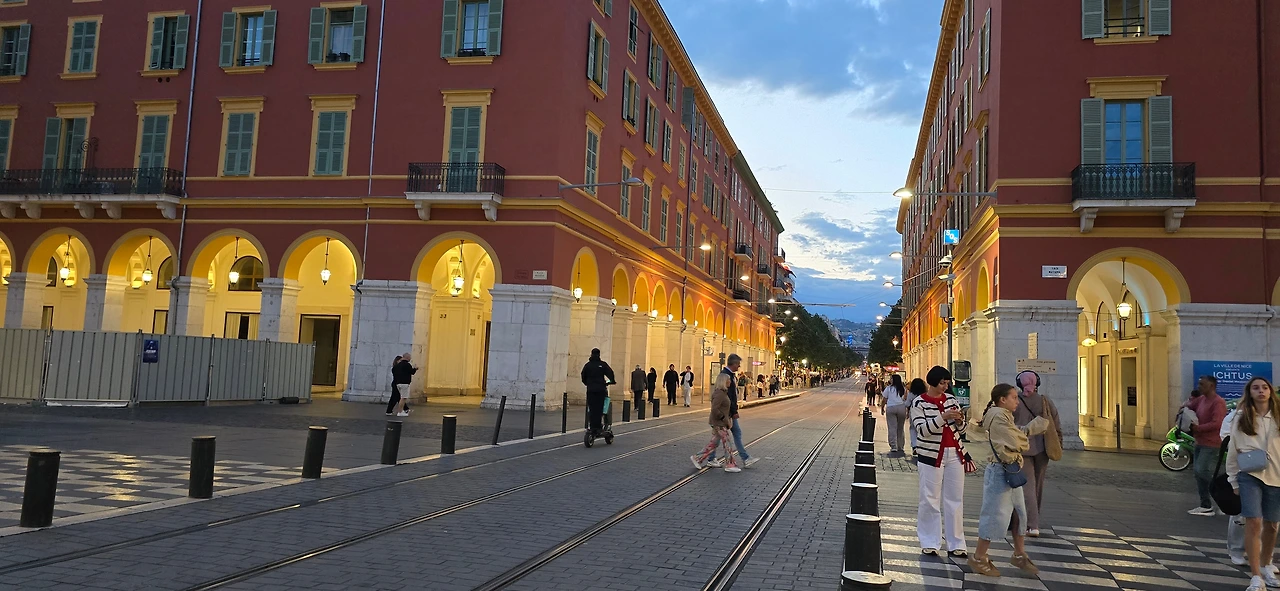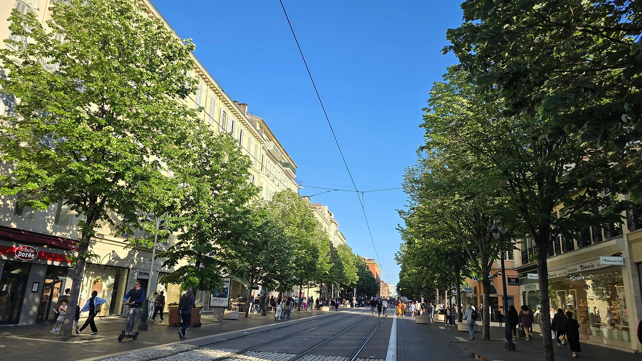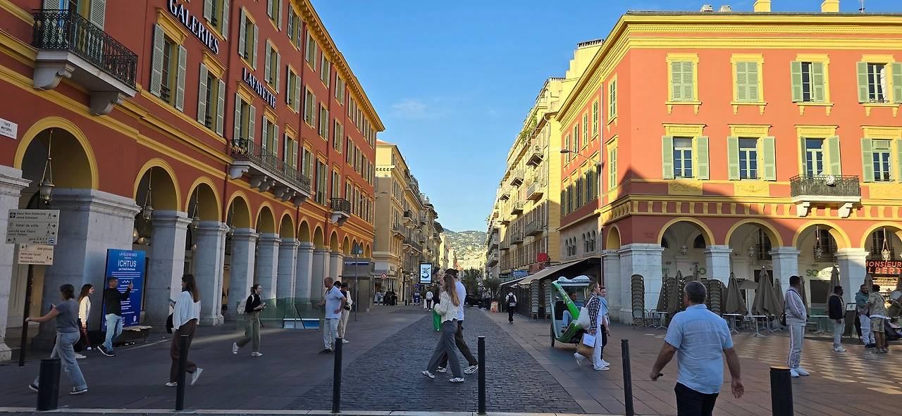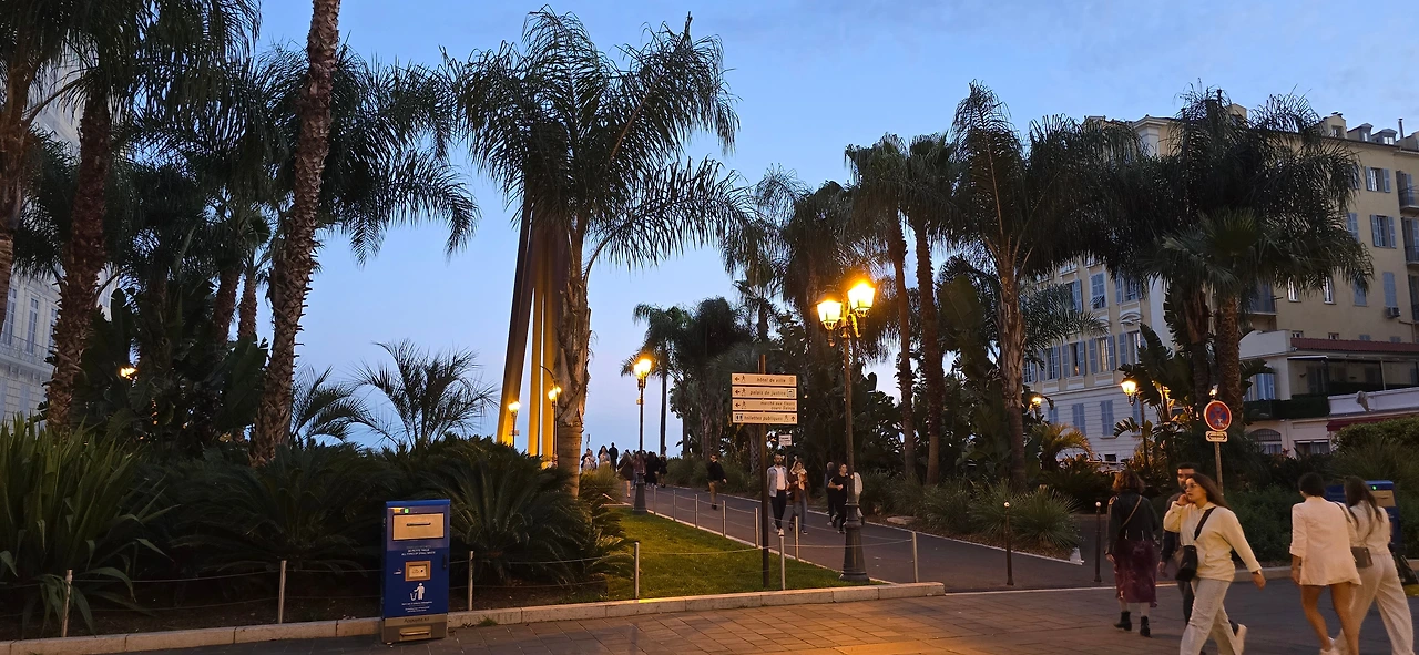 한가한 주택 지역을 10여분을 걸어가니 어디서 들 나왔는지 많은 사람들이 보이며, 한 곳을 향해 걸어가고 있다. 바다 쪽으로 가고 있는 것이 아닌가 하고 따라가니 커다란 대로가 나오고, 대로변을 따라 상가들이 밀집한 지역이 나온다. 카페, 식당, 의류점들이 즐비하다. 나이키, H& M, 버거킹, 맥도널드, 스타벅스도 나온다. 트램이 저 멀리서 들어오고 있다. 조금 더 나아가니 커다란 광장이 나온다. 광장 한편으로 트램이 빙 둘러 나간다. 마세나 광장이다. 다비드상이 서 있는 분수대도 나온다. 조금 더 남쪽으로 나아가니 식당과 기념품을 판매하는 상가가 나오고, 남녘에서 자생하는 키 큰 식물의 정원을 지나니 차로와 보도 너머로 마침내 탁 트인 바다가 보인다. 차로와 보드는 동서로 길게 뻗어 있는데, 폭 10여 미터 내외의 널찍한 보도인 영국인 산책로는 해안을 따라 잘 단장되어 있고, 그 아래로 지중해 푸른 바다가 남실남실 폭 100m 정도 되는 해변 자갈밭을 쉴 새 없이 드나들며 가없이 펼쳐져 있다.