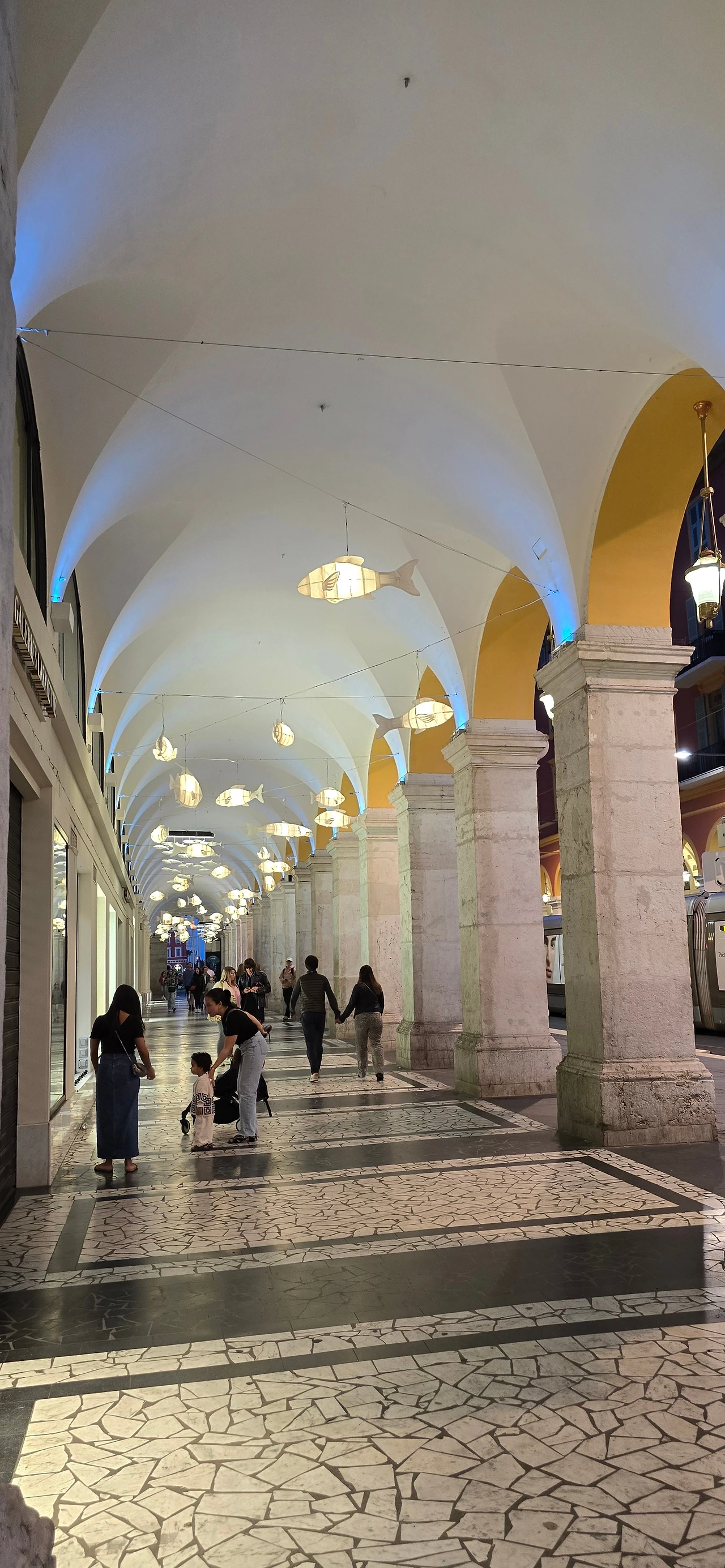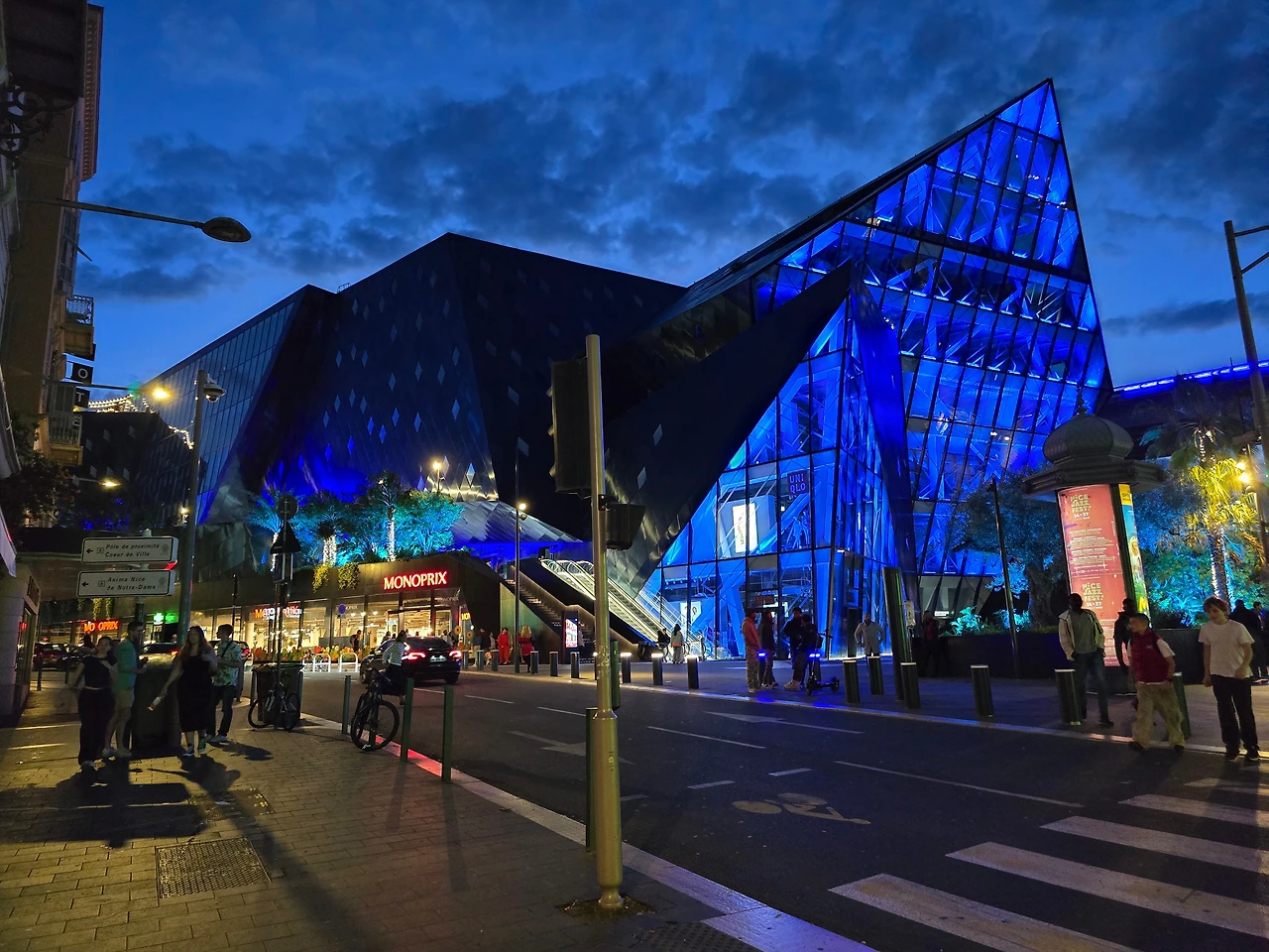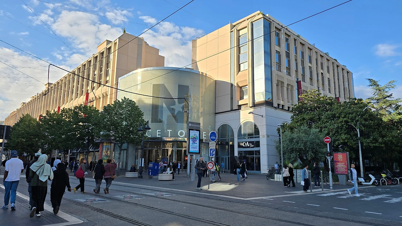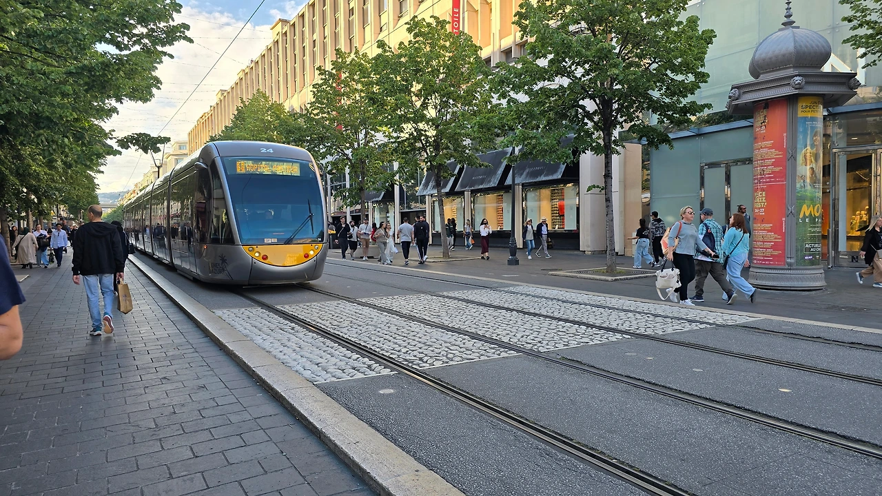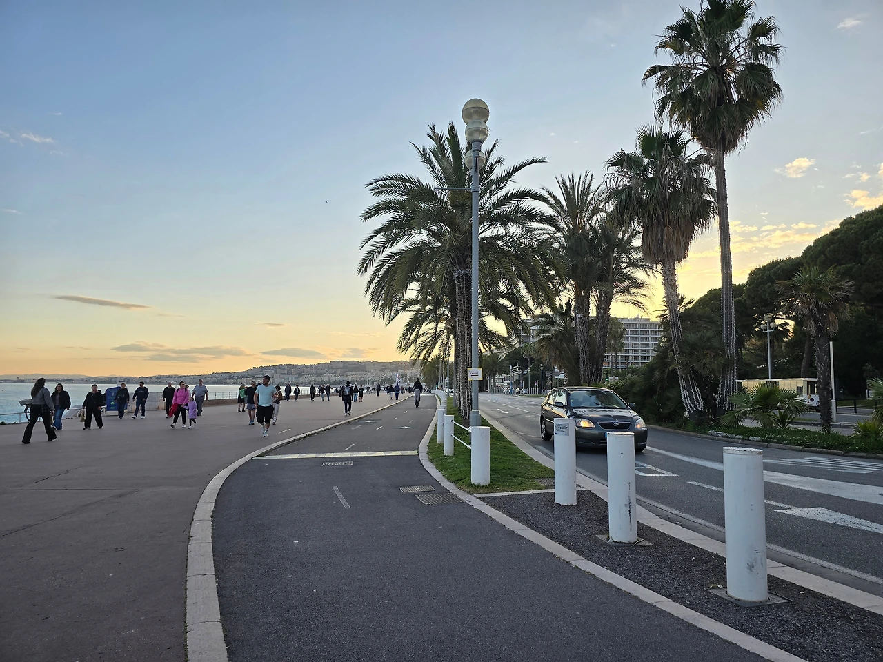 한가한 주택 지역을 10여분을 걸어가니 어디서 들 나왔는지 많은 사람들이 보이며, 한 곳을 향해 걸어가고 있다. 바다 쪽으로 가고 있는 것이 아닌가 하고 따라가니 커다란 대로가 나오고, 대로변을 따라 상가들이 밀집한 지역이 나온다. 카페, 식당, 의류점들이 즐비하다. 나이키, H& M, 버거킹, 맥도널드, 스타벅스도 나온다. 트램이 저 멀리서 들어오고 있다. 조금 더 나아가니 커다란 광장이 나온다. 광장 한편으로 트램이 빙 둘러 나간다. 마세나 광장이다. 다비드상이 서 있는 분수대도 나온다. 조금 더 남쪽으로 나아가니 식당과 기념품을 판매하는 상가가 나오고, 남녘에서 자생하는 키 큰 식물의 정원을 지나니 차로와 보도 너머로 마침내 탁 트인 바다가 보인다. 차로와 보드는 동서로 길게 뻗어 있는데, 폭 10여 미터 내외의 널찍한 보도인 영국인 산책로는 해안을 따라 잘 단장되어 있고, 그 아래로 지중해 푸른 바다가 남실남실 폭 100m 정도 되는 해변 자갈밭을 쉴 새 없이 드나들며 가없이 펼쳐져 있다.