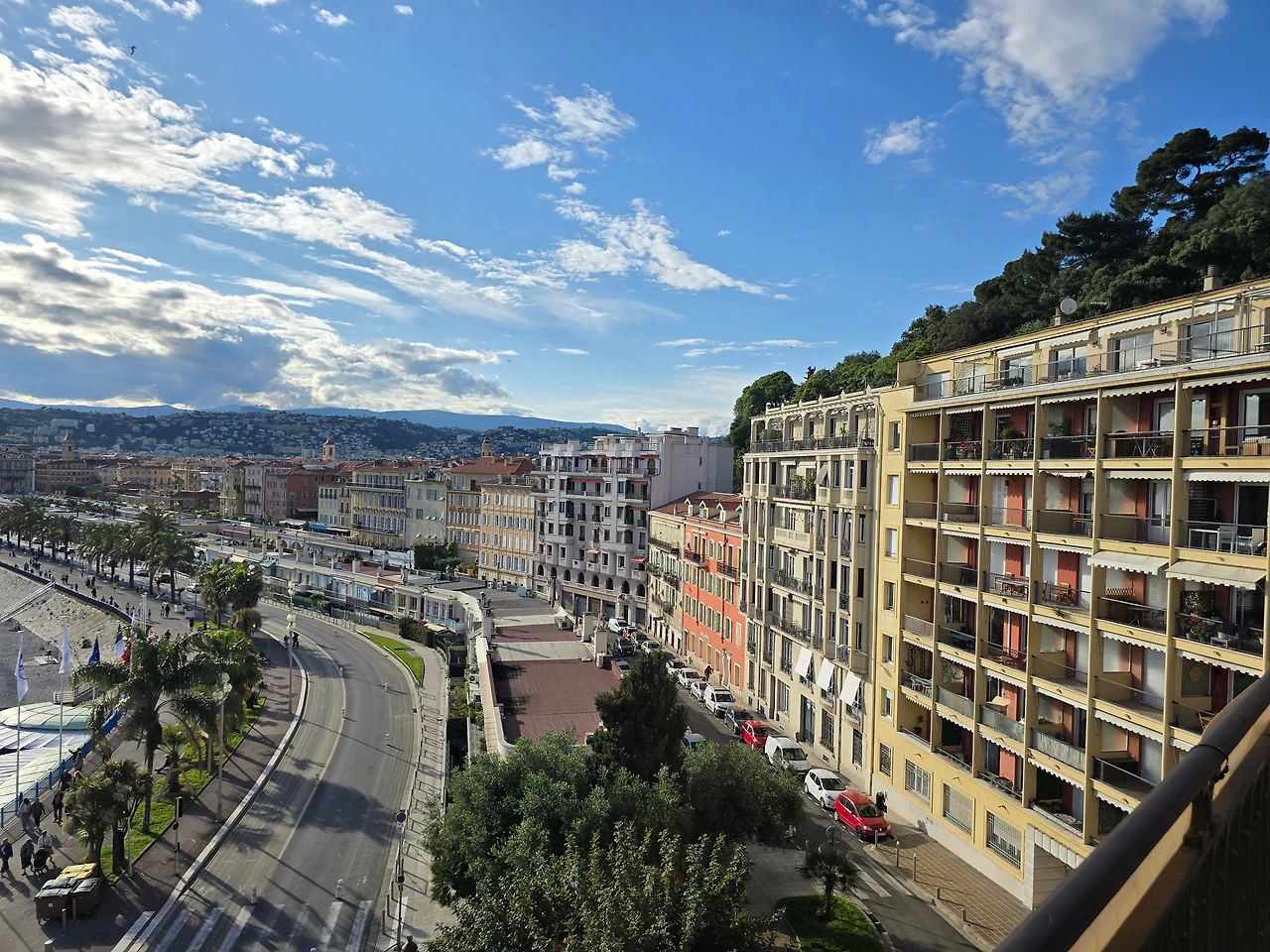 꿈에 그리던 로망을 실현할 곳에 무사히 도착했다는 안도감에 의자에 몸을 싣는다. 잠시 숨을 돌리고 창문을 열어 보니 길 건너 맞은편엔 같은 높이의 아파트가 마주하고 있다. 고풍스러운 건물은 하얀 커튼들로 창문을 가리고 햇살 가득 받고 있는 테라스엔 차양들이 쳐져 있다. 일반적인 호텔의 입지가 빌딩으로 둘러싸인 업무지역에 위치해 있는데 비해 사뭇 다른 분위기어서 낯설지만 니스의 맛을 고스란히 느낄 수 있어서 좋다.