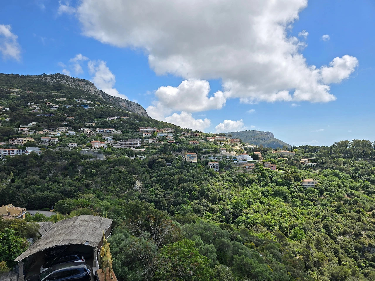 완만한 커브를 돌고 돌아 오르막을 어느 정도 올라가니 비교적 평탄한 도로가 나타나 계속 이어지며, 도로 오른쪽 저 아래로는 까마득히 지중해 바다가 놓여있다. 정신 바짝 차리고 운전을 한다. 어느 정도 시간이 지나고 길에 익숙해 지자 좌우로 고개 돌려 풍경을 감상하는 여유가 생긴다. 도로변 예쁜 지중해풍 가옥이 눈에 들어오고, 도로 왼쪽 위로 완만한 지형을 따라 곳곳에 형성되어 있는 마을들도 눈에 들어온다. 저 아래로 해안을 따라 꽤나 근사한 주택들이 LA 비벌리 힐즈 주택에서 풍기던 그 부유한 냄새를 풍기며 마을이 형성되어 있는 것도 보인다. 지중해를 내려다보며 드라이브하고 있다는 것을 상기하면서, 느긋하게 드라이브를 즐기게 된다.