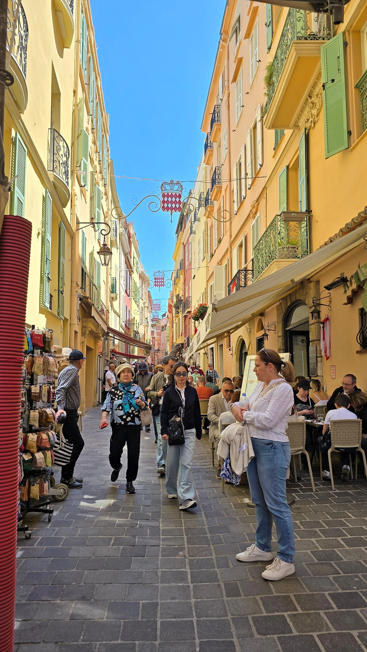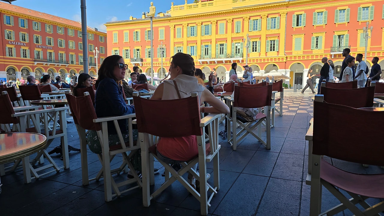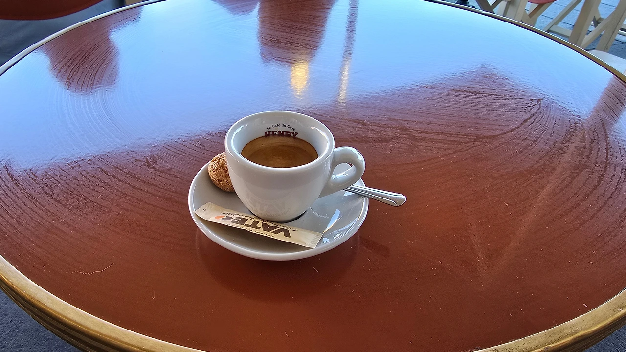 진한 에스프레소를 보고, 마시고, 오가는 사람들 구경하고, 2025년 5월 8일, 지중해 연안 니스에서