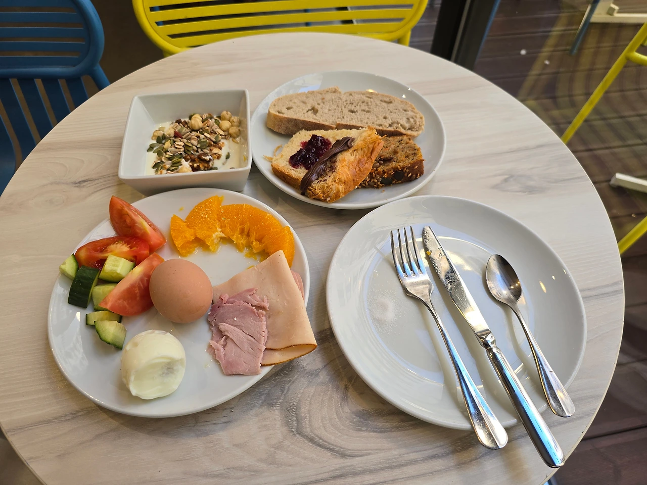 아침이 밝았다. 드디어 버킷리스트 1번을 실현할 날이다. 긴장도 되면서 흥분도 된다. 조식하러 1층 로비옆으로 나란히 있는 식당으로 내려간다. 호텔은 비록 작으나 1층 로비에 언제든 마실 수 있는 정수기 물이 있다. 그리고 식당 역시 아담하나 깔끔하고 천정이 탁 트인 중정 형태의 공간에 몇 개의 테이블을 구비해 놓아 개방감을 느낄 수 있다. 메뉴는 단출하지만 원하는 것은 다 있다. 바케트를 비롯한 여러 빵, 사과, 바나나, 오렌지 등 과일과 오이, 파프리카, 양송이버섯 등 야채류, 베이컨, 여러 햄류, 치즈류, 수프류, 우유, 요구르트, 삶은 계란, 토마토, 오렌지 주스류, 커피 등으로 차려져 있다. 중정의 테이블이 보이는 곳으로 가 바깥 실외가 환히 바라보이는 자리에 앉아 식사하고 있으니, 한국인들도 두 팀 들어온다. 좀 알려진 호텔인 모양이다.
