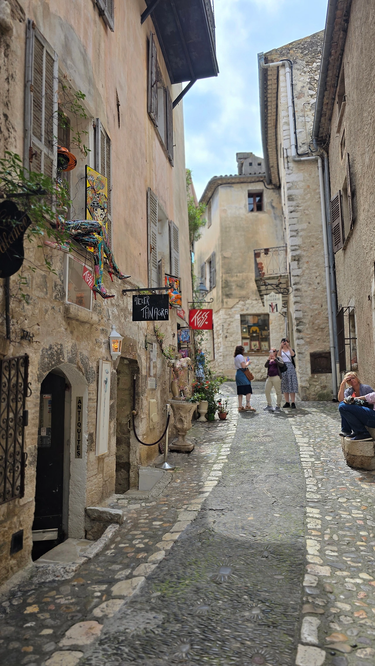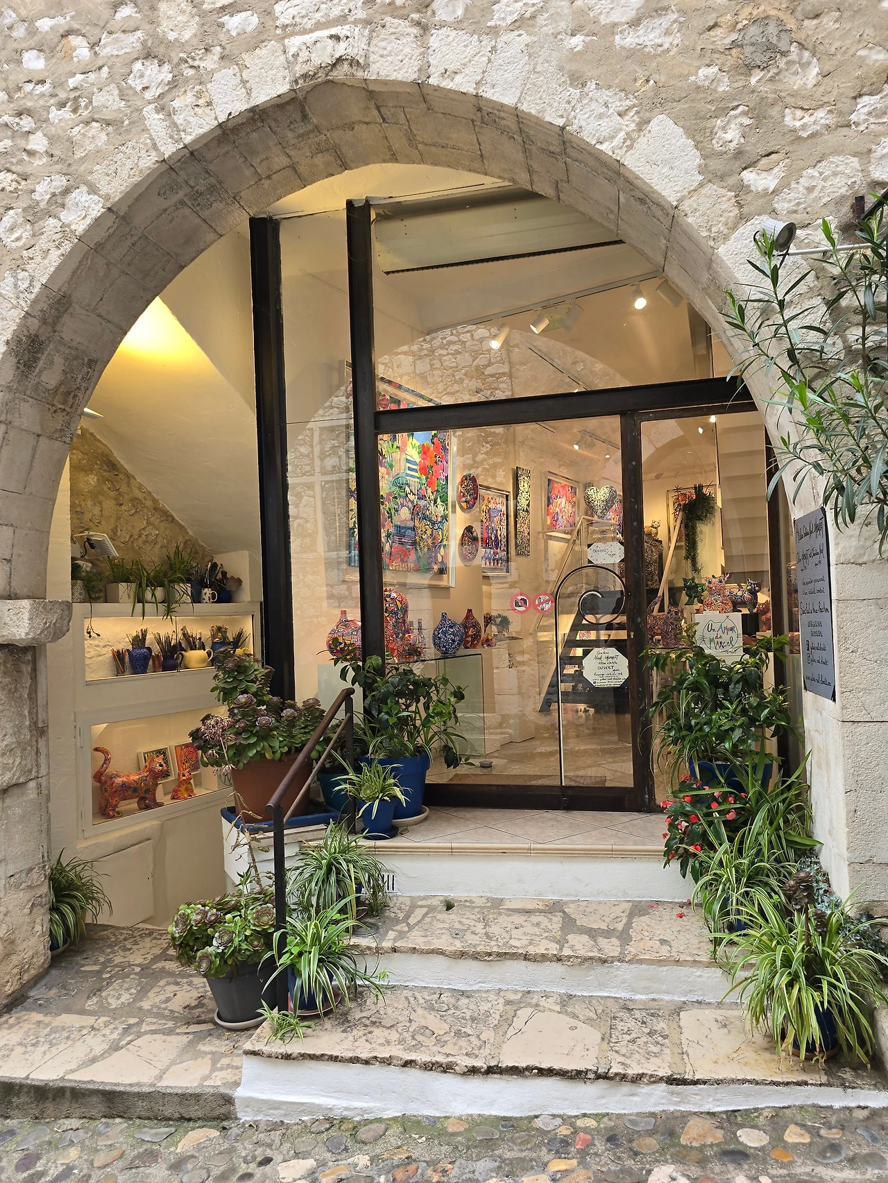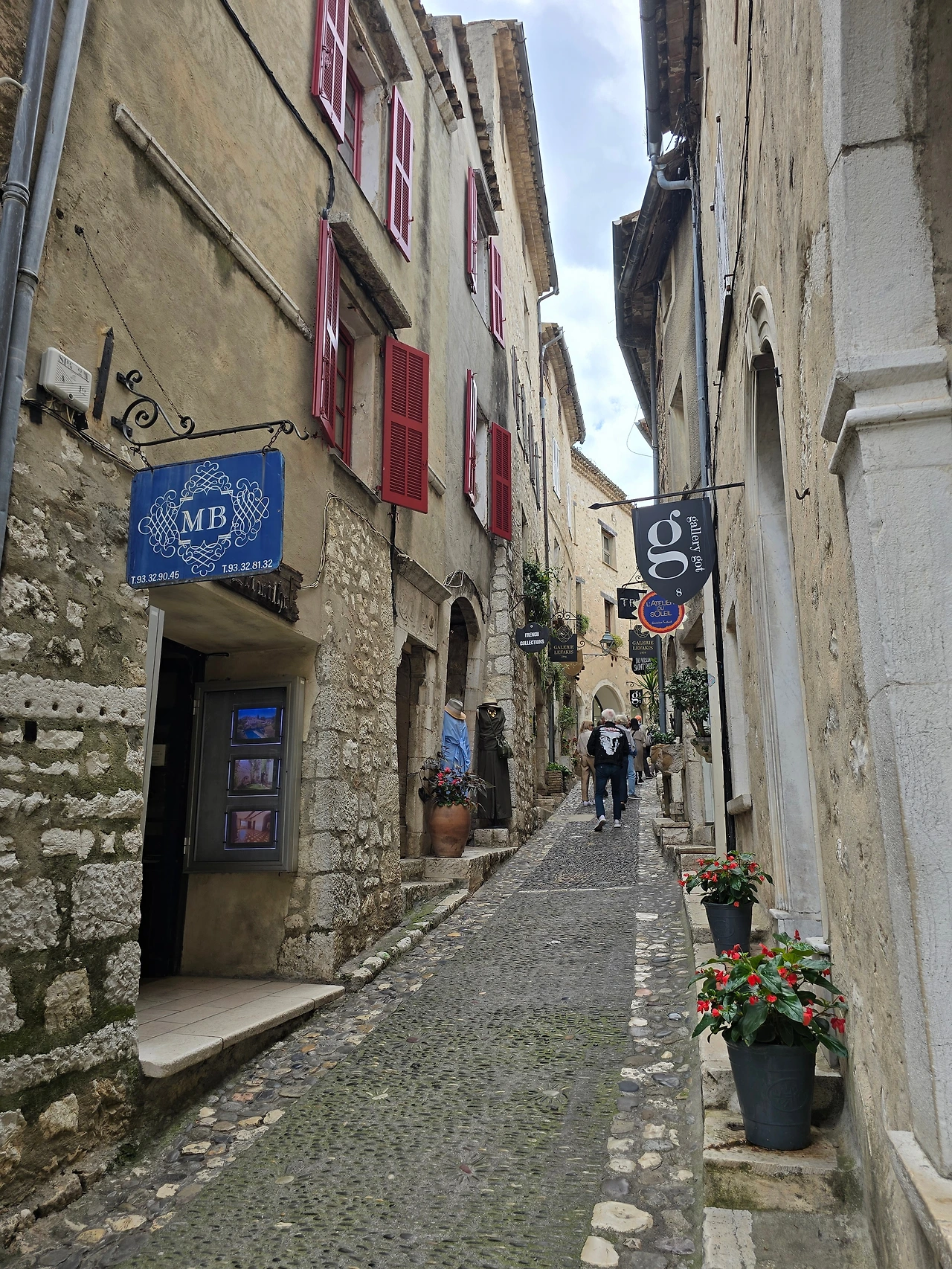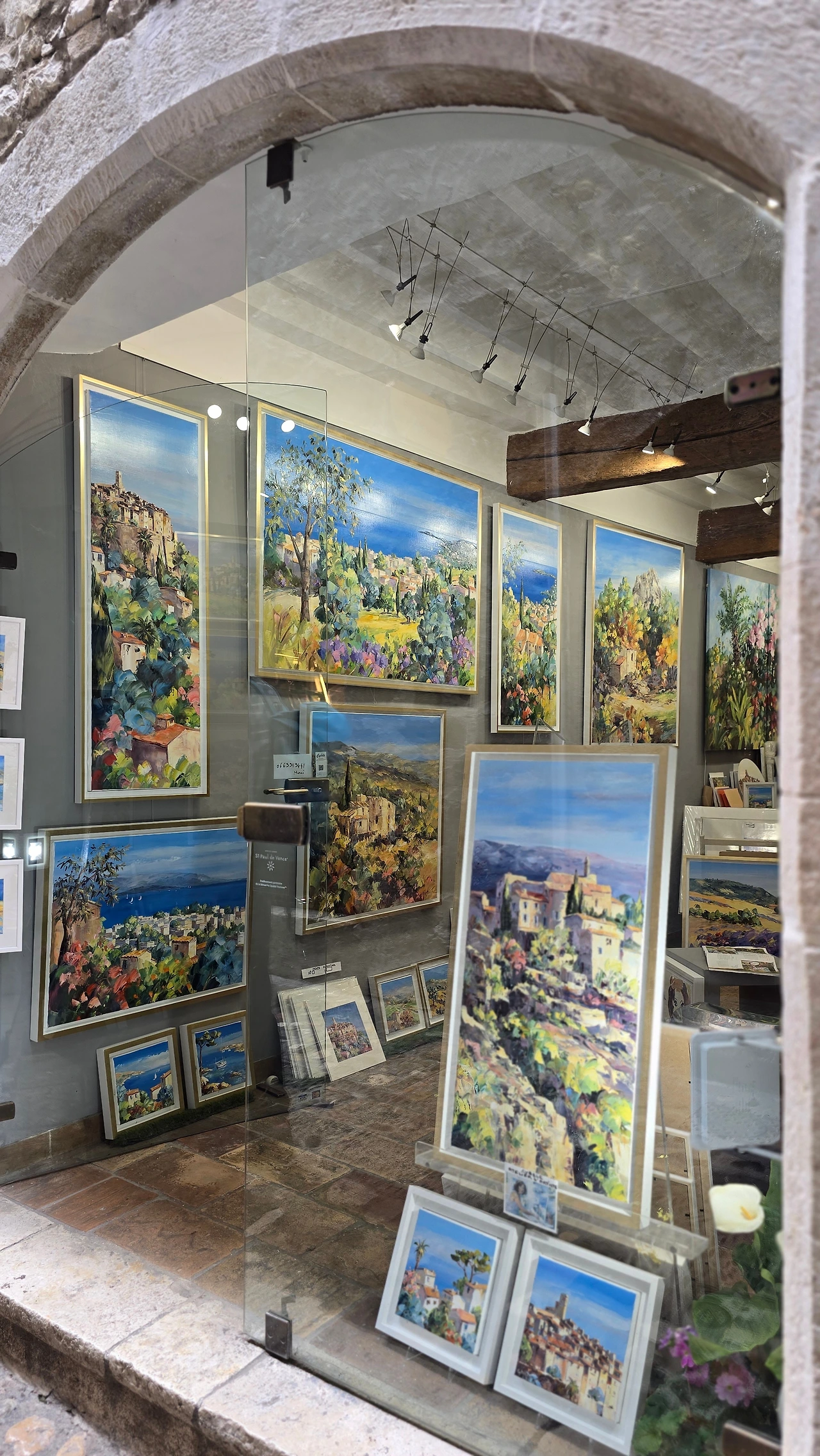그렇게 행복한 시간 속에서 어느 삼거리에 도착하였고, 그곳이 생폴드방스가 있는 곳이었다. 생폴드방스는 에즈빌리지와 많이 닮은 동네이다. 다만 위치에 있어서 에즈빌리지가 바다를 내려다볼 수 있는 곳에 우뚝 솟은 지형에 형성된 마을이라면, 생폴드방스는 내륙의 완만한 분지에서 불룩하게 솟은 언덕에 형성된 곳이다. 중세 시대에 형성된 고즈넉한 석축의 건축물, 빙 동네를 에워싸고 있는 성벽 위에서 내려다 보이는 완만한 산지와 군데군데 형성된 마을은 샤갈이 여생을 보낼만하다는 생각이 절로 든다. 아마도 다시는 못 올 거란 생각에, 물론 합류하는 국내 여행사팀과 한번 더 오게 되나 홀로 자유롭게는 못 올 거란 뜻으로, 마음 깊이 새기려 발걸음 옮기면서도 예쁜 경치를 몇 번이고 고개 돌려 보고 또 본다. 주택과 상가에서 풍기는 분위기는 에즈빌리지처럼 예쁘고 아기자기하고 독특한 디자인의 제품들로 예술적인 분위기를 풍기고 있다. 손재주 없는 입장으로선 구매 욕구 불러일으키는 제품을 만들어 내는 예술가들의 재주에 감탄할 뿐이다.