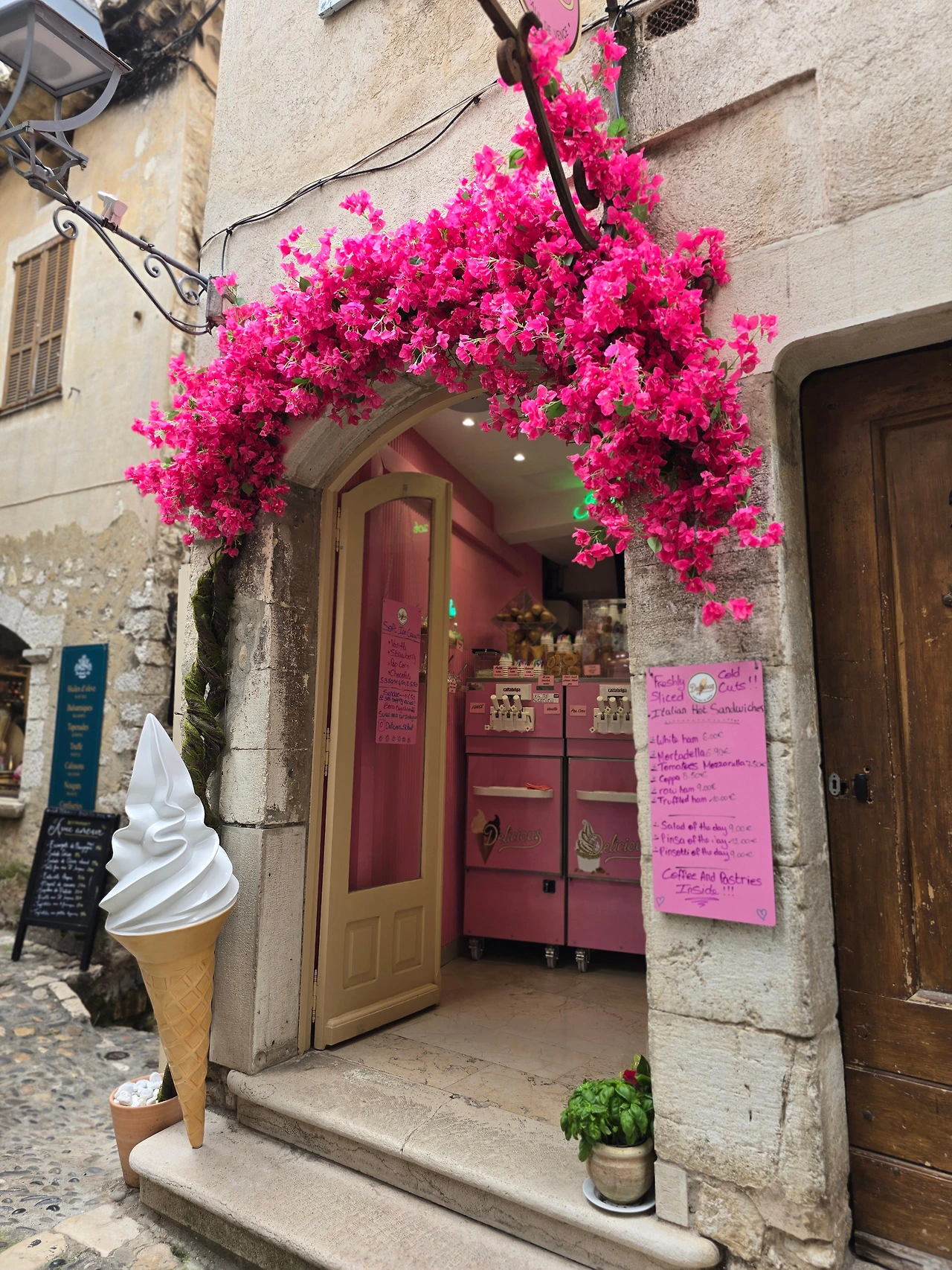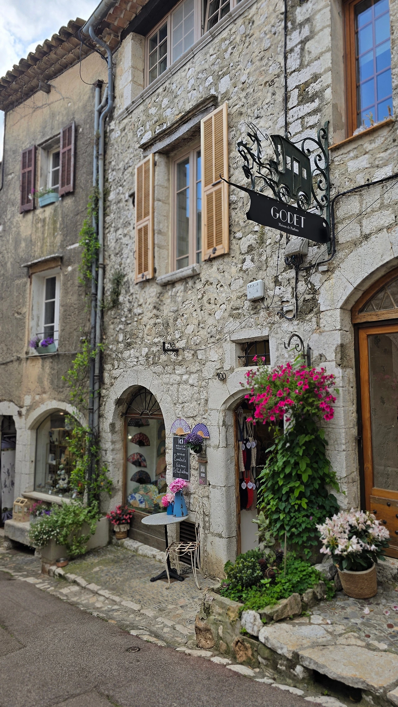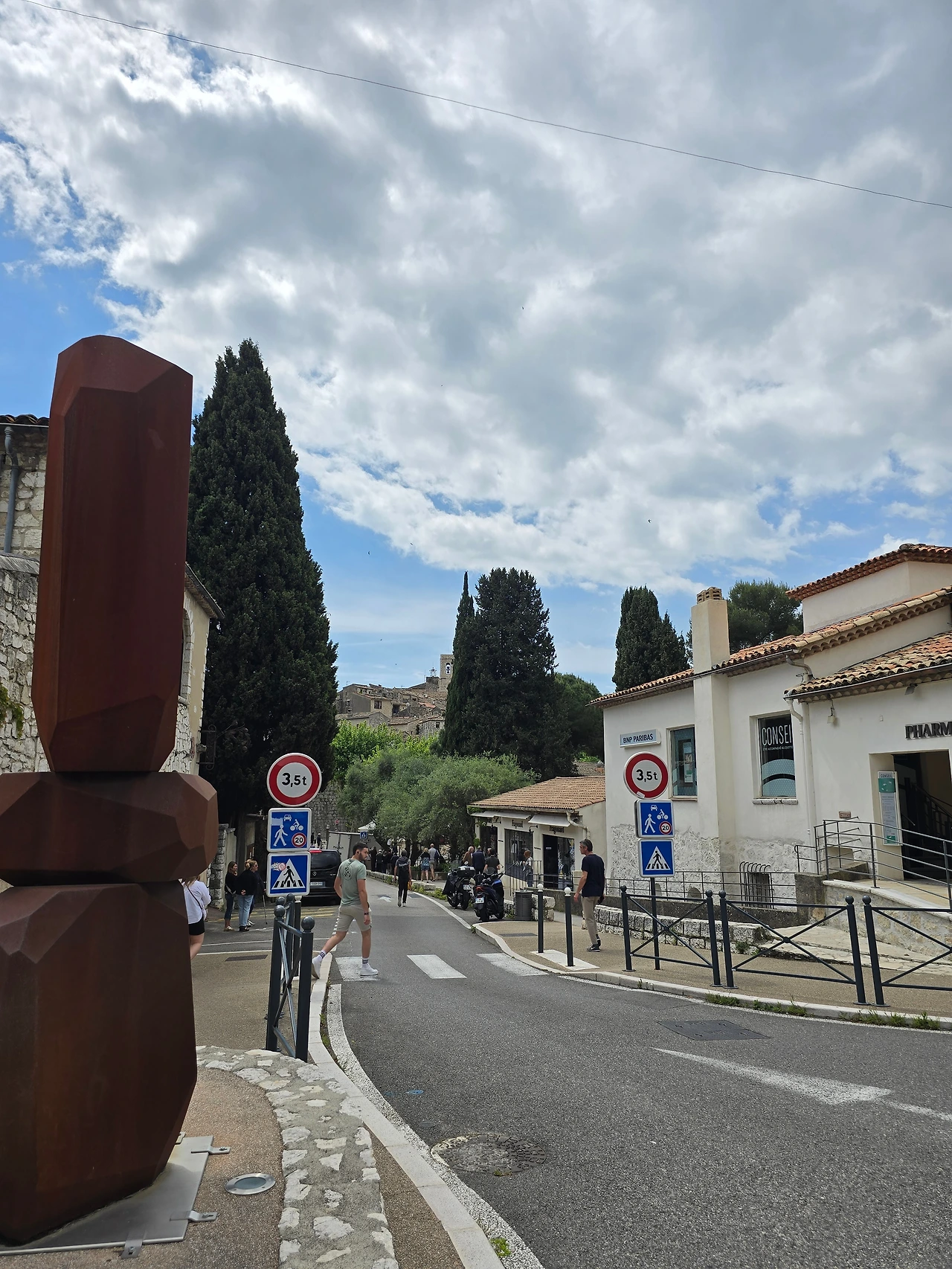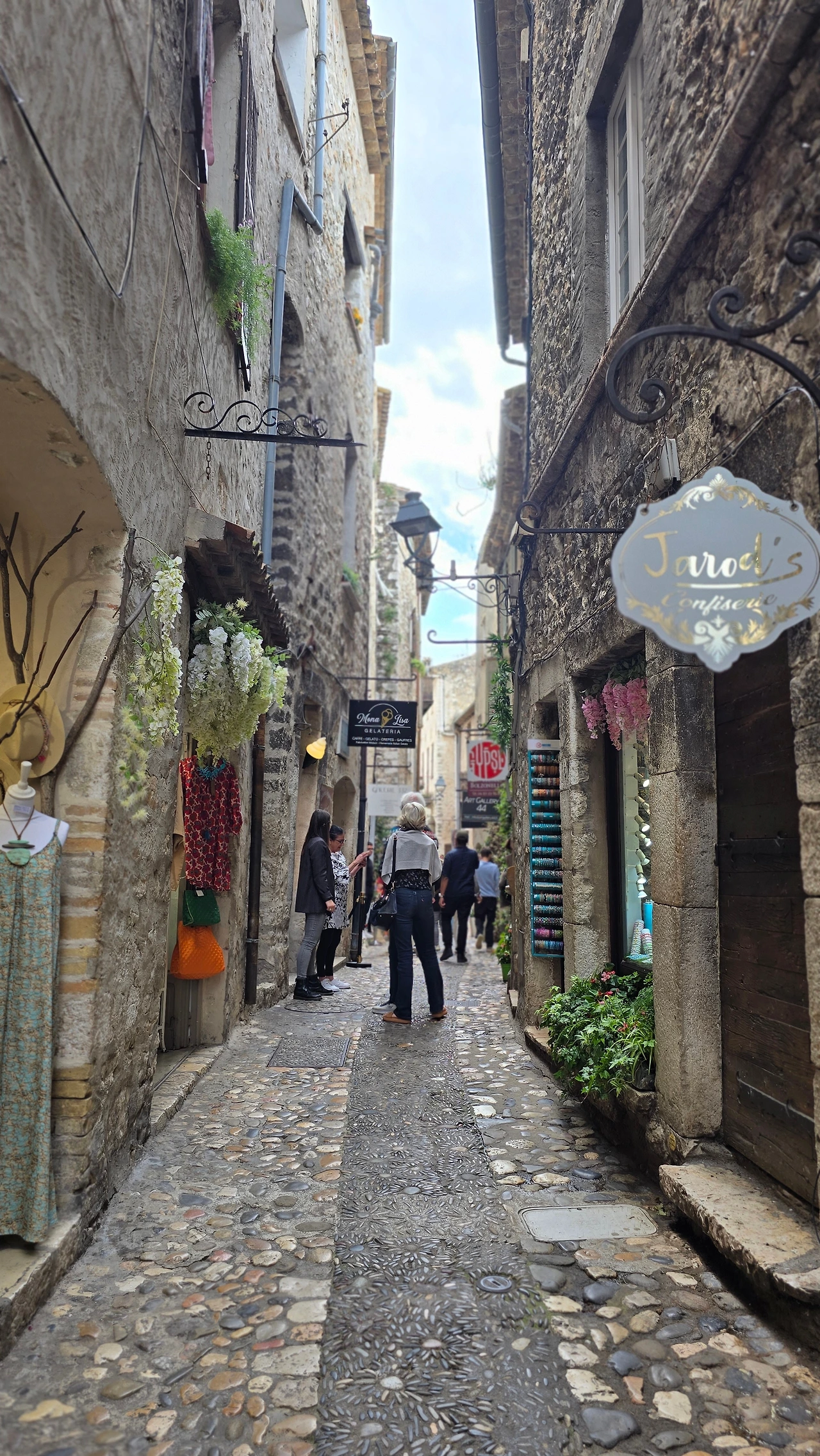 그렇게 행복한 시간 속에서 어느 삼거리에 도착하였고, 그곳이 생폴드방스가 있는 곳이었다. 생폴드방스는 에즈빌리지와 많이 닮은 동네이다. 다만 위치에 있어서 에즈빌리지가 바다를 내려다볼 수 있는 곳에 우뚝 솟은 지형에 형성된 마을이라면, 생폴드방스는 내륙의 완만한 분지에서 불룩하게 솟은 언덕에 형성된 곳이다. 중세 시대에 형성된 고즈넉한 석축의 건축물, 빙 동네를 에워싸고 있는 성벽 위에서 내려다 보이는 완만한 산지와 군데군데 형성된 마을은 샤갈이 여생을 보낼만하다는 생각이 절로 든다. 아마도 다시는 못 올 거란 생각에, 물론 합류하는 국내 여행사팀과 한번 더 오게 되나 홀로 자유롭게는 못 올 거란 뜻으로, 마음 깊이 새기려 발걸음 옮기면서도 예쁜 경치를 몇 번이고 고개 돌려 보고 또 본다. 주택과 상가에서 풍기는 분위기는 에즈빌리지처럼 예쁘고 아기자기하고 독특한 디자인의 제품들로 예술적인 분위기를 풍기고 있다. 손재주 없는 입장으로선 구매 욕구 불러일으키는 제품을 만들어 내는 예술가들의 재주에 감탄할 뿐이다.