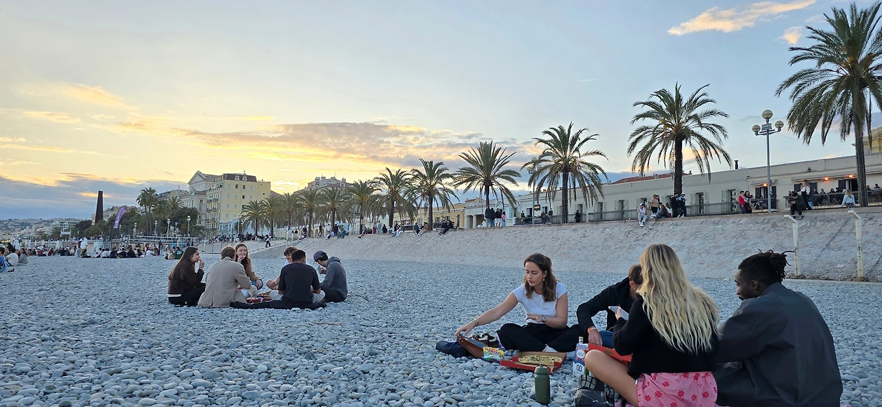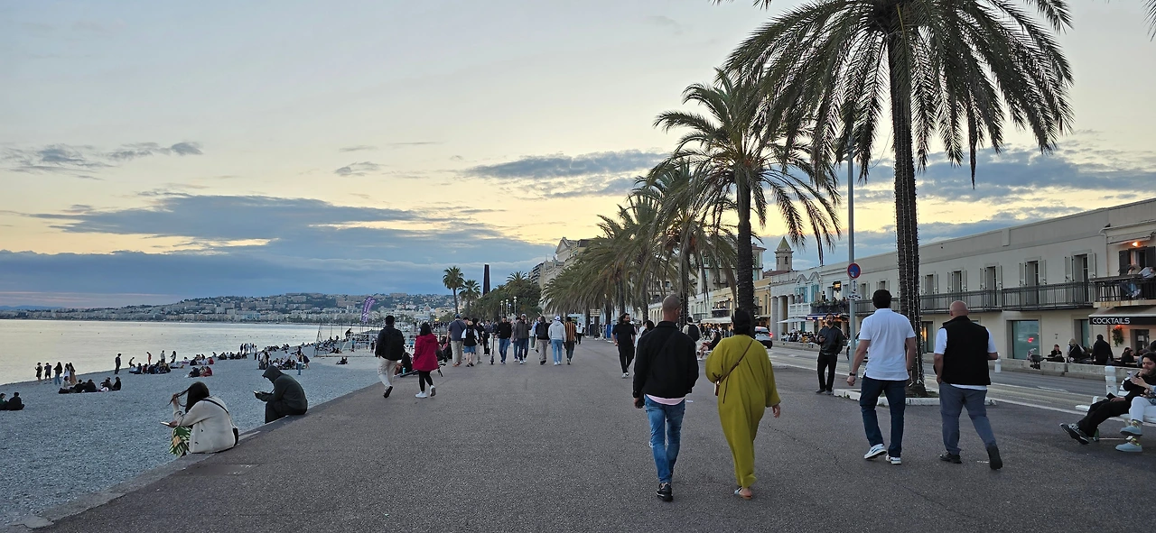 바다와 조금씩 거리를 두고 점점 잘 관리된 가로수가 놓인 도로로 진입하며 서서히 건물들이 나타난다. 코트다쥐르 공항이 있는 지역이다. 말쑥하게 차려입은 신사처럼 반짝이는 건물들의 깔끔한 지역에 이어 까마득히 멀리서 보이던 그 지역인 듯 한 곳으로 들어섰다. 조금 더 나아가니 익숙한 건물과 거리가 나타난다. 드라이브 마지막 종점인 니스 해변이다. 얼굴 내미는 지중해를 보며 드디어 도착했다며 속으로 환호했던, 어제는 느긋하게, 그저께는 두리번거리며 걸었던 영국인 산책로를 옆으로 끼고, 개선장군이나 된 듯, 열망하던 모든 것을 이룬 흡족한 얼굴로 한껏 여유 있게 지나간다. 마침내 드라이브의 종점을 찍었다.