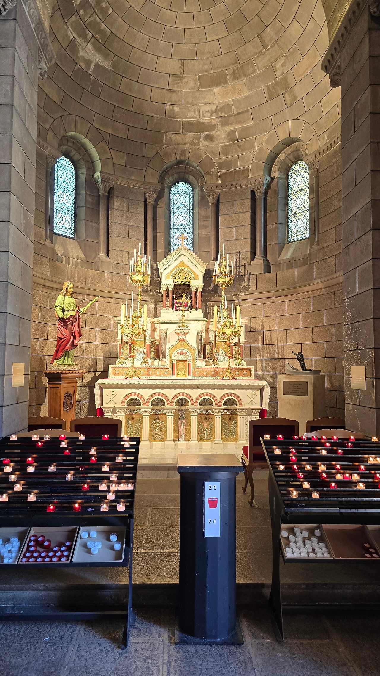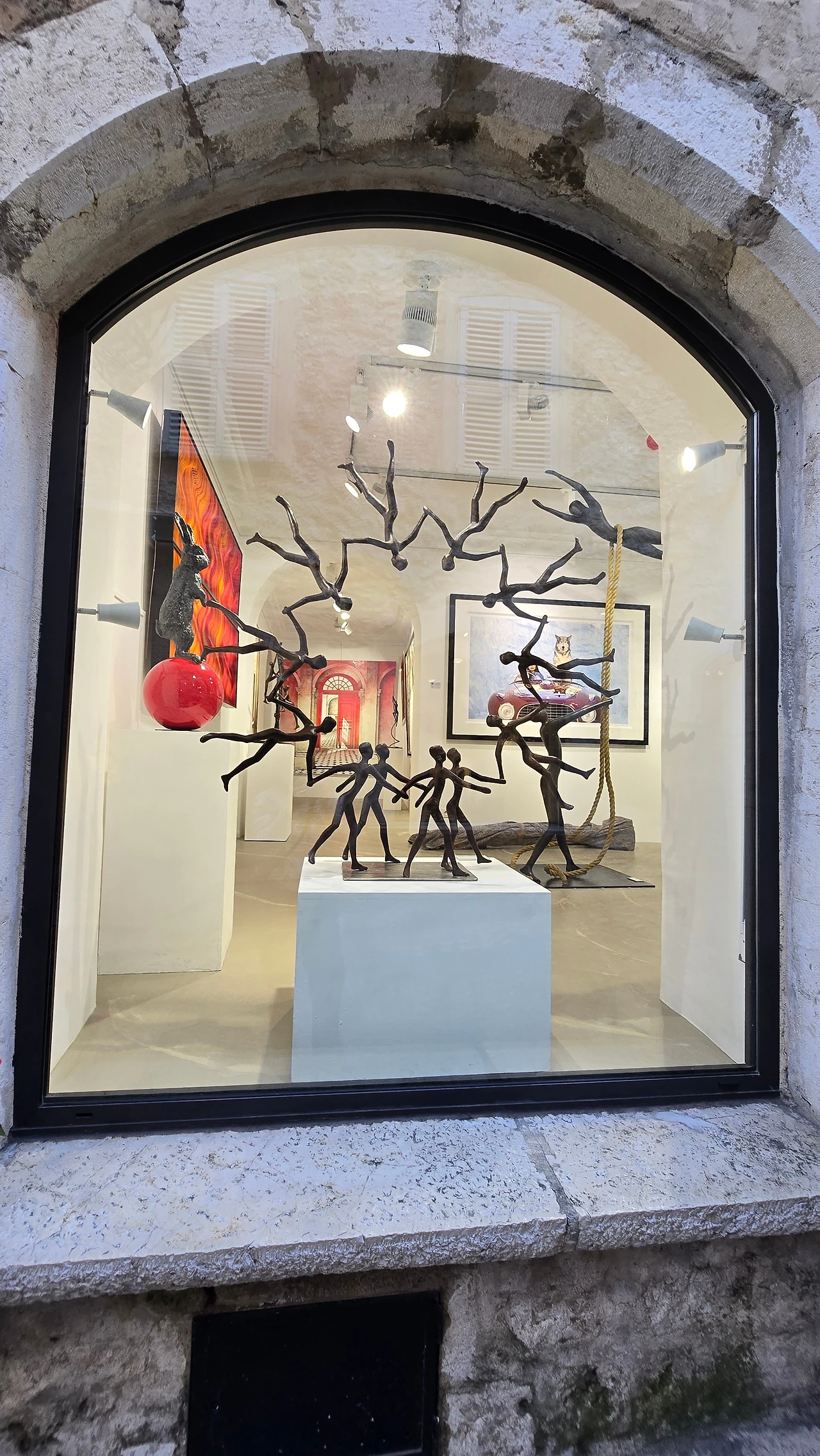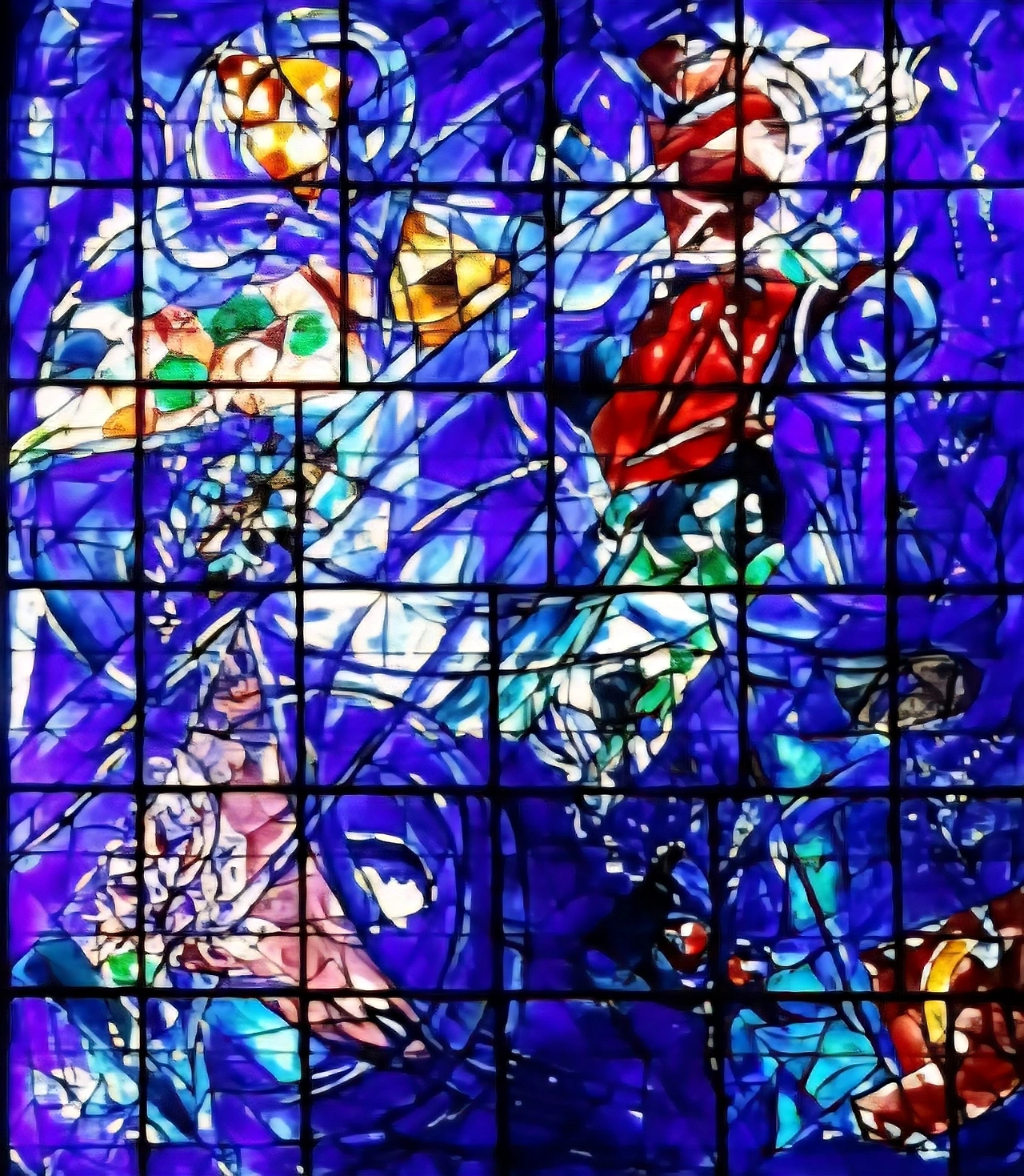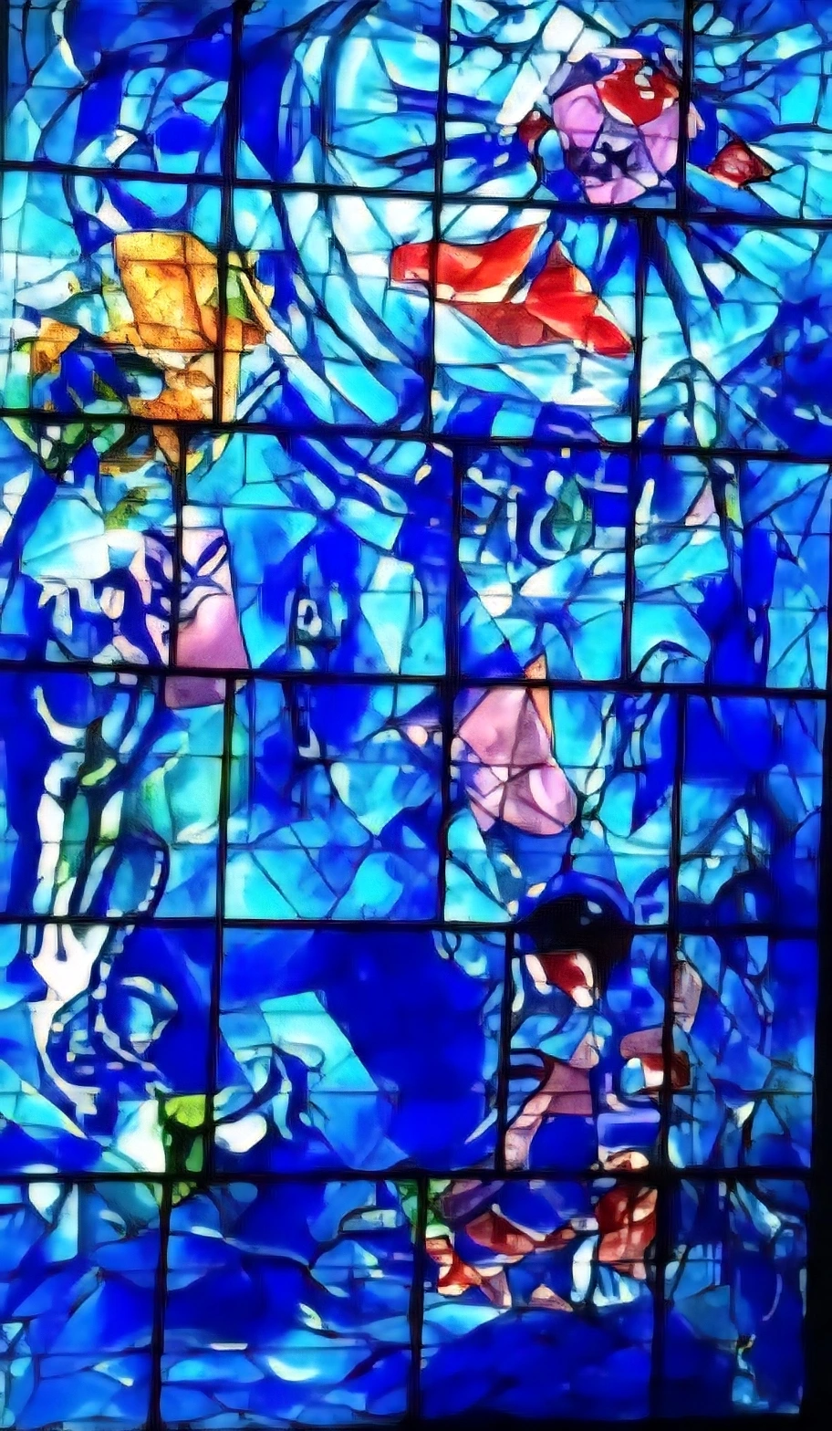 그리고 실내 전시 공간은 보수 관계로 일부만 개방되어 있었는데, 전시장으로 들어서면 반원형 구조에 가로, 세로 폭 2~3m 정도 되는 대형 그림들이 천지 창조, 아담과 이브, 노아의 방주 같은 구약 성서 내용을 담고 전면에 전시되어 있었다. 태곳적 우주의 분위기를 풍기는 짙푸른 바탕색에 인물과 물체들이 노란색, 빨간색, 하얀색으로 변주된 화폭은 색상에서 아우라가 압도적이었다. 한 발작 가까이서 들여다보노라니 성서의 내용들이 마치 어릴 적 할머니 무릎을 베고 잠결에서 옛이야기를 듣는 듯 신비한 느낌으로 다가왔다. 세상의 창조와 인류의 탄생, 그리고 인간 사회의 원죄와 같은 묵직한 주제를 꿈꾸듯 동화처럼 만들어 내는 작가의 자유로운 영혼과 재주가 부럽고 존경스럽다. 그리고 환상적인 색상과 형태로 기쁨과 즐거움을 주니 고맙기도 하다. 발걸음 옮겨 이동하면 환상적인 파란색 바탕의 스테인드 글라스 작품도 접하게 된다. 강렬한 남프랑스 지역의 내리쬐는 햇살, 그 아래 일렁이는 지중해 푸른 물결과 오가는 사람들의 밝고 환한 웃음소리가 경쾌하게 들리는 듯하다.