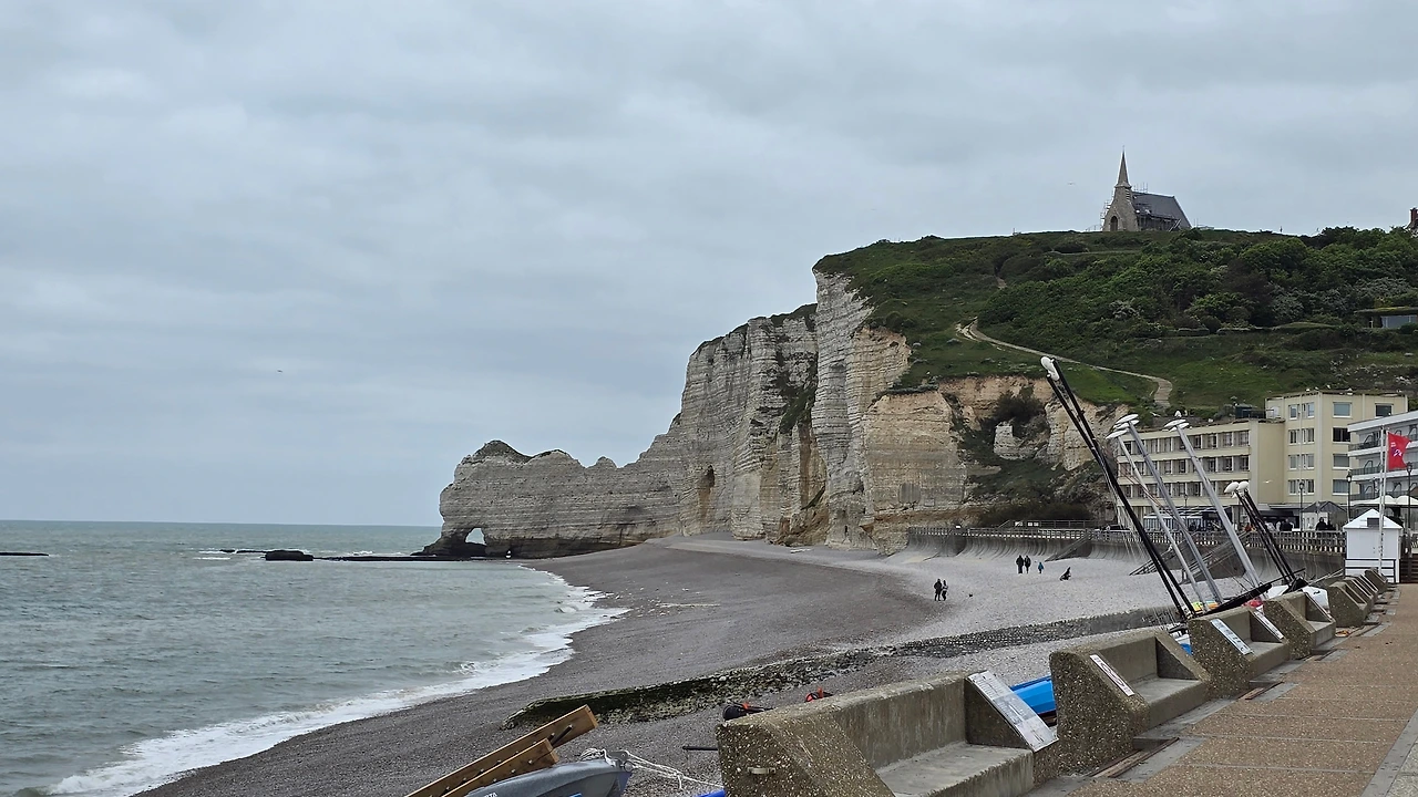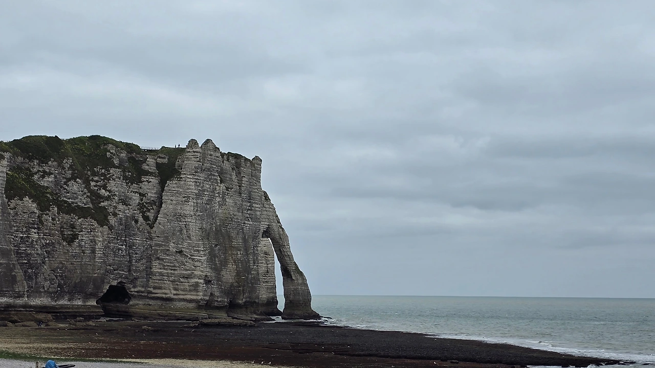 오늘의 여정은 에트르타, 옹플뢰르, 몽생미셸 순이다. 에트르타의 대기는 짙은 회색이다. 차에서 내리니 공기는 초겨울 마냥 차갑다. 추울 거라고 따뜻이 입고 오라는 예고가 있어서 무릎까지 내려오는 봄 외투에 안으로는 히트택 기능의 긴 상하 내의와 기모 셔츠를 입고 왔으며, 목도리까지 칭칭 목에 둘러 마치 추위와 한바탕 싸울 기세의 복장을 하고 거리로 나선다.