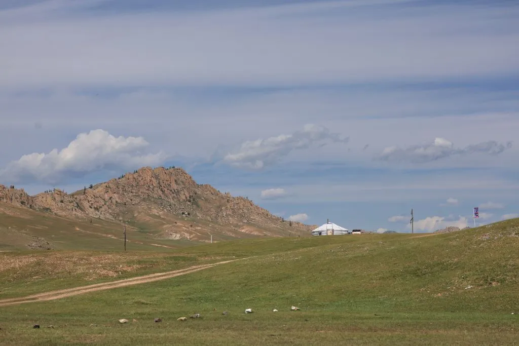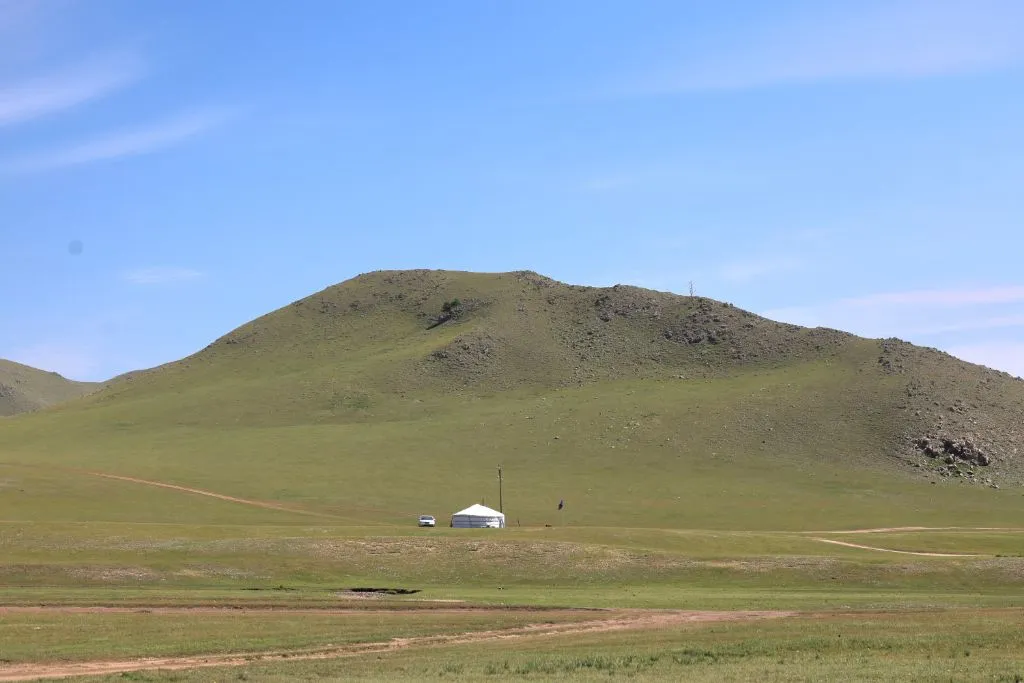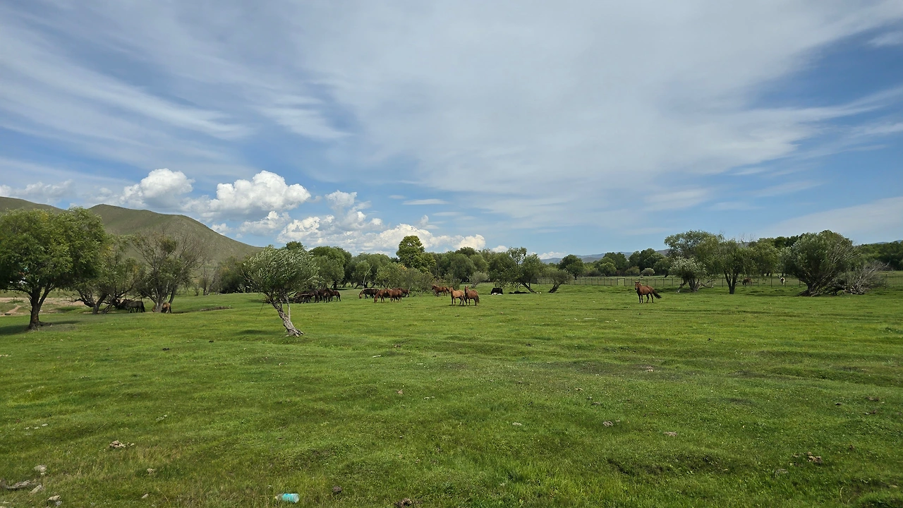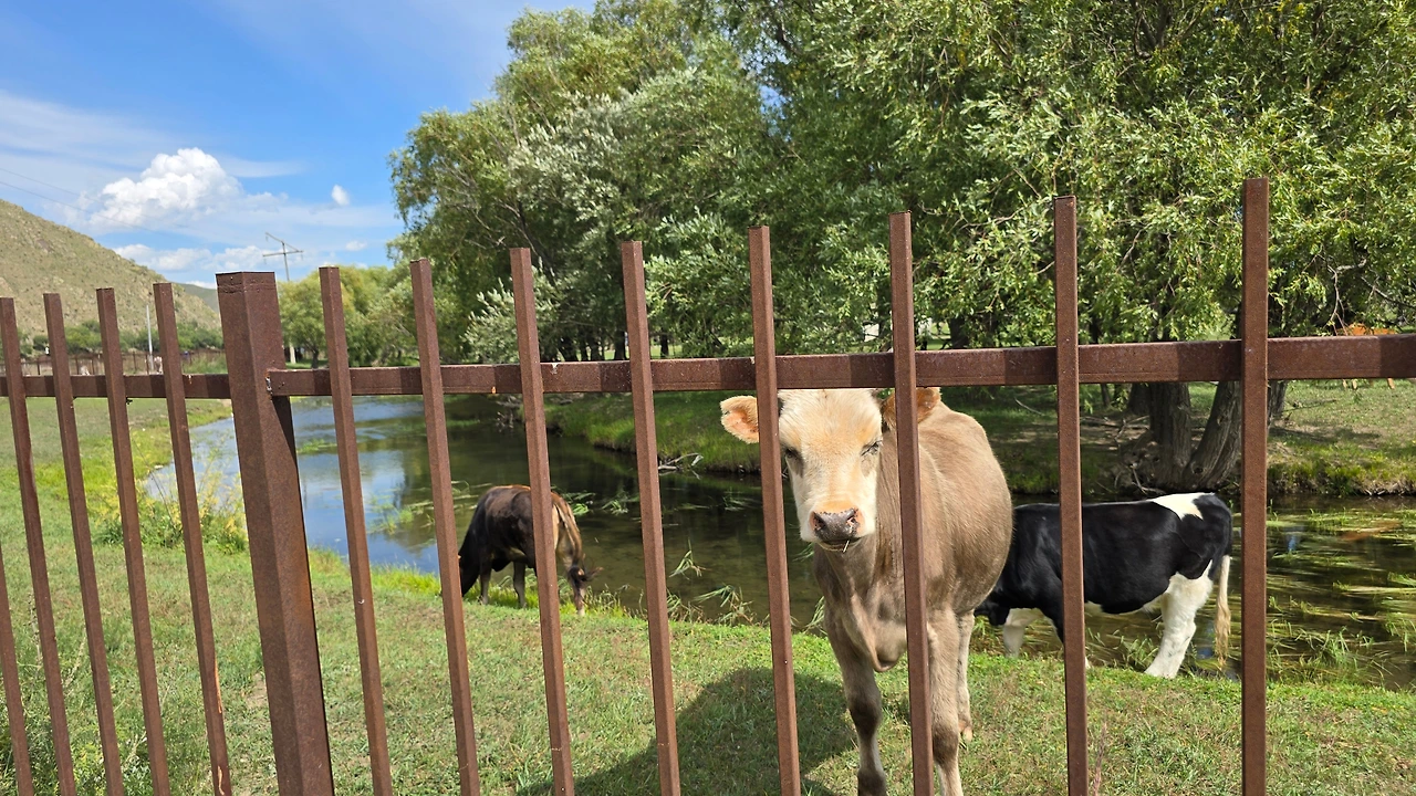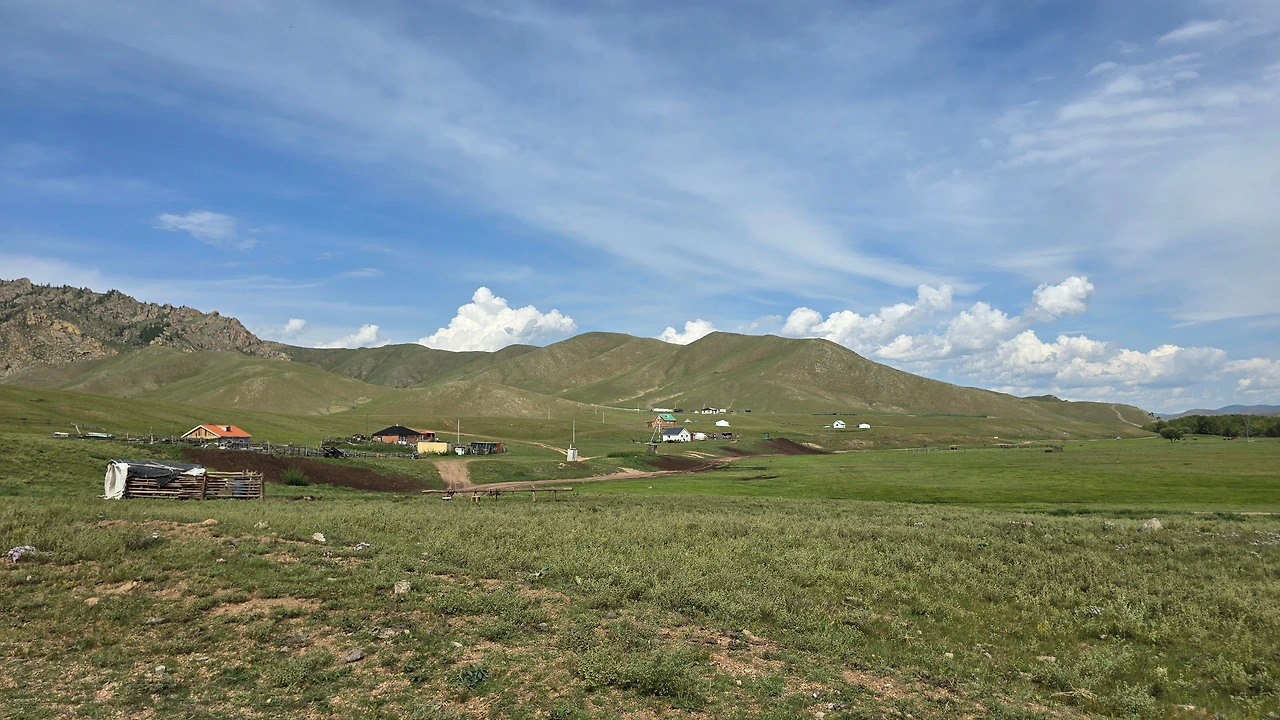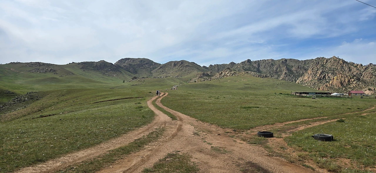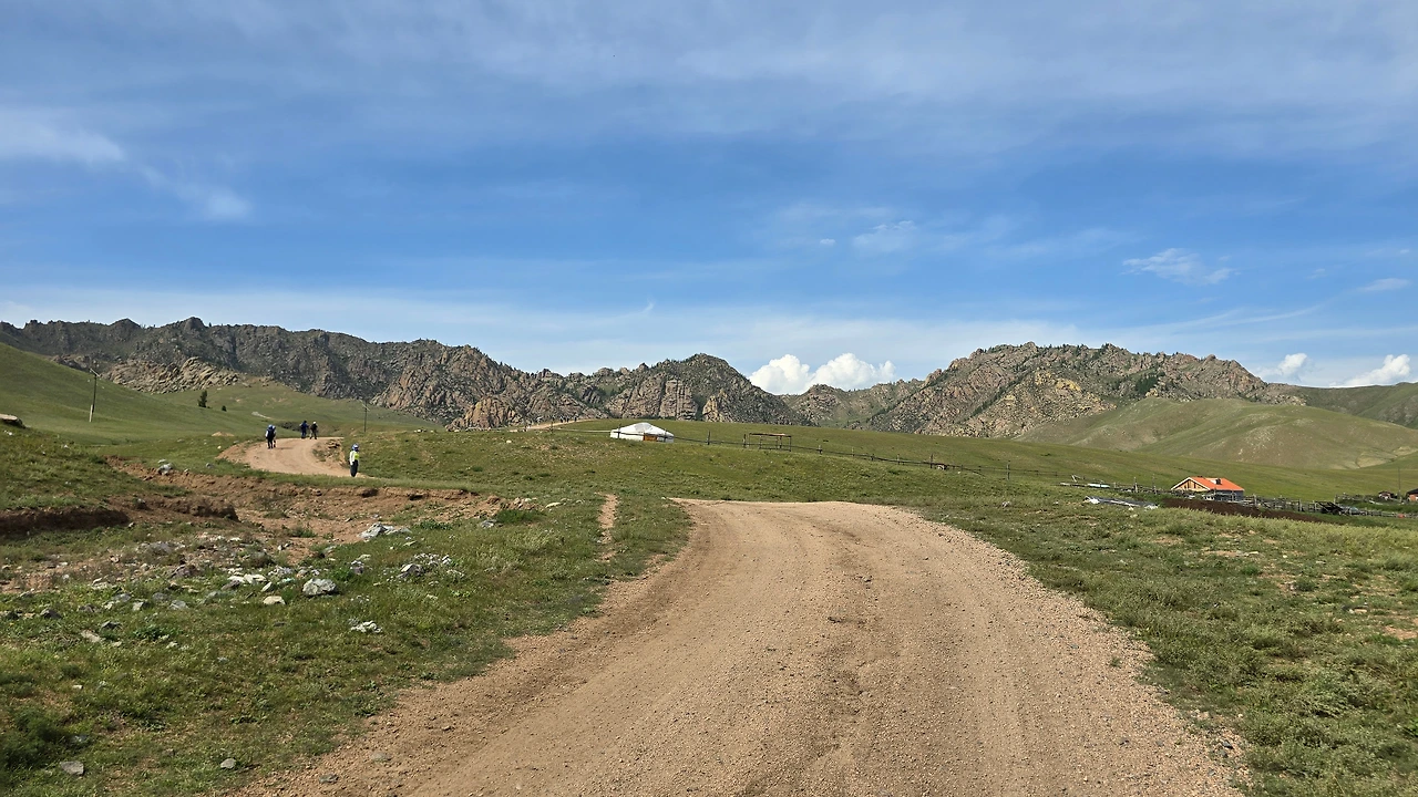 완만한 길 옆으로 목조 주택이 있고 언덕 위로 뽀얀 게르도 보인다. 차창으로 멀리서만 보던 게르를 드디어 가까이서 본다. 어릴 적 할머니 집에서 보았던 초가집을 보는 기분이다. 너무 푸근하다. 머리에 수건을 두른 우리 할매라도 나올 거 같다. 등에 지게를 진 할배가 나올 것 같기도 하다. 둥근 초가지붕을 닮은 둥글둥글한 게르..