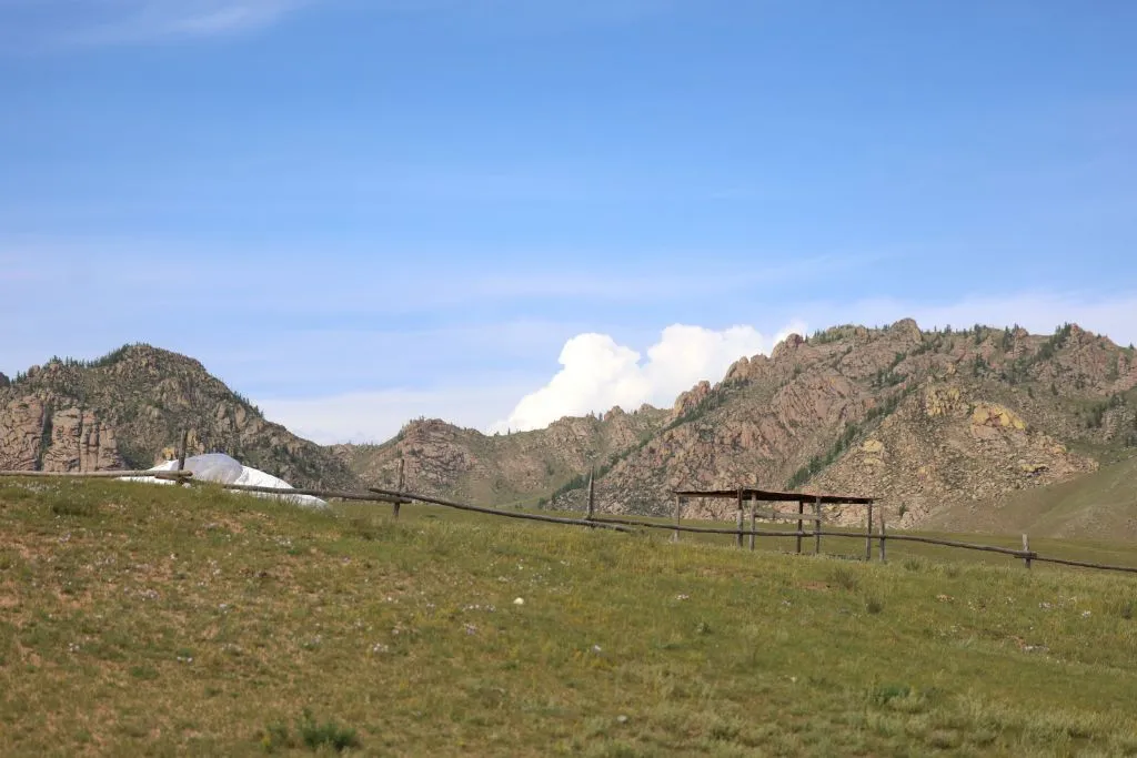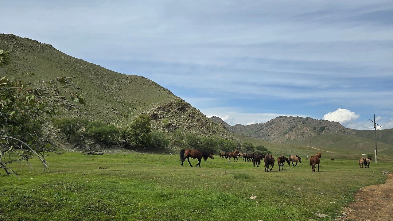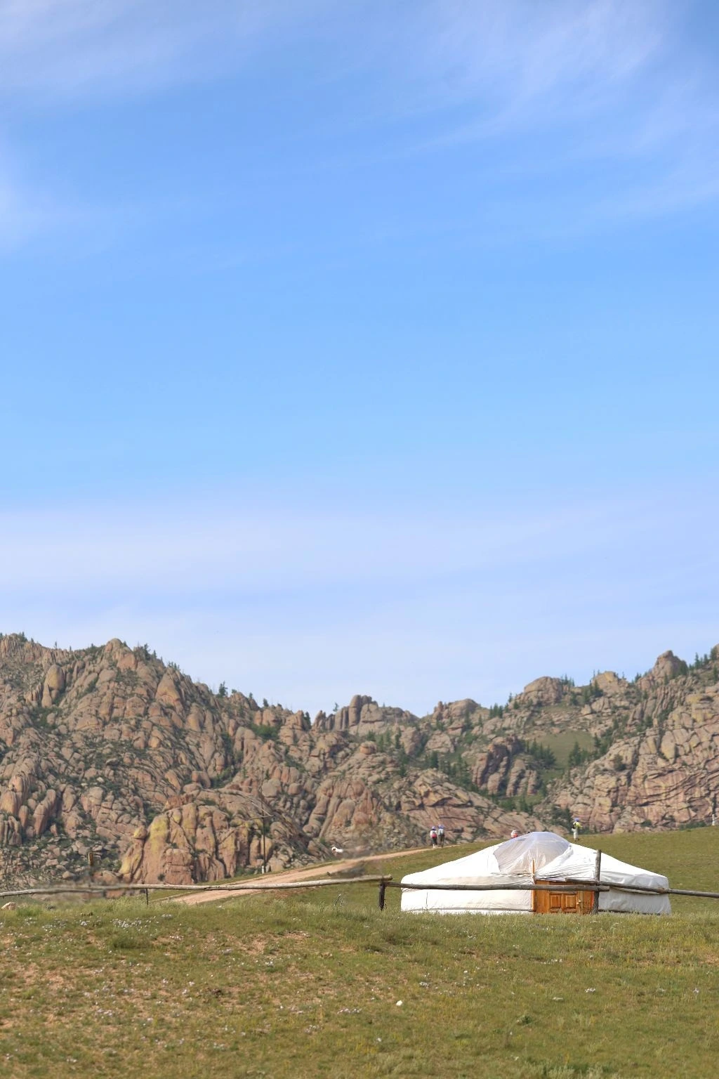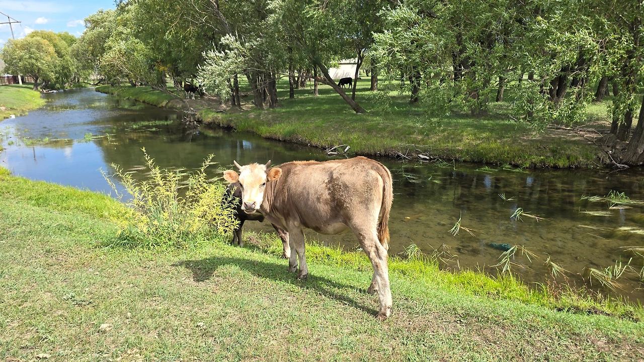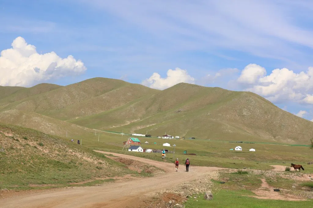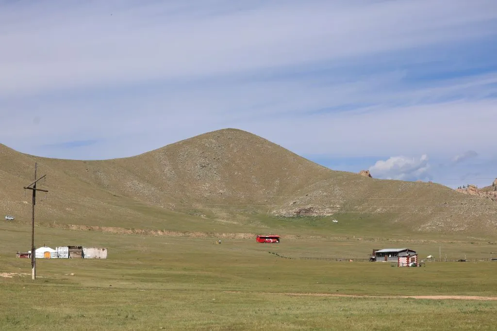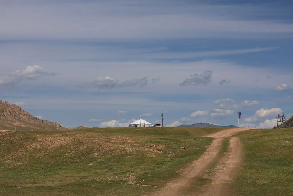 완만한 길 옆으로 목조 주택이 있고 언덕 위로 뽀얀 게르도 보인다. 차창으로 멀리서만 보던 게르를 드디어 가까이서 본다. 어릴 적 할머니 집에서 보았던 초가집을 보는 기분이다. 너무 푸근하다. 머리에 수건을 두른 우리 할매라도 나올 거 같다. 등에 지게를 진 할배가 나올 것 같기도 하다. 둥근 초가지붕을 닮은 둥글둥글한 게르..
