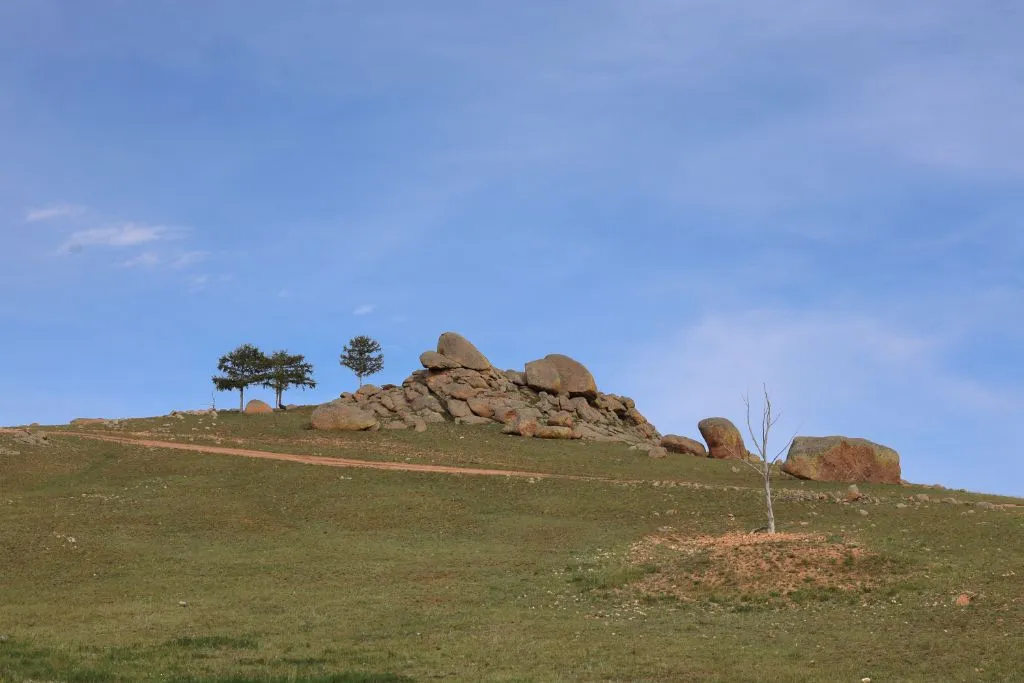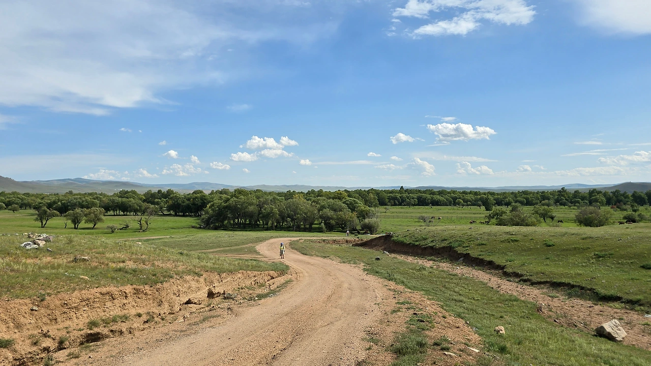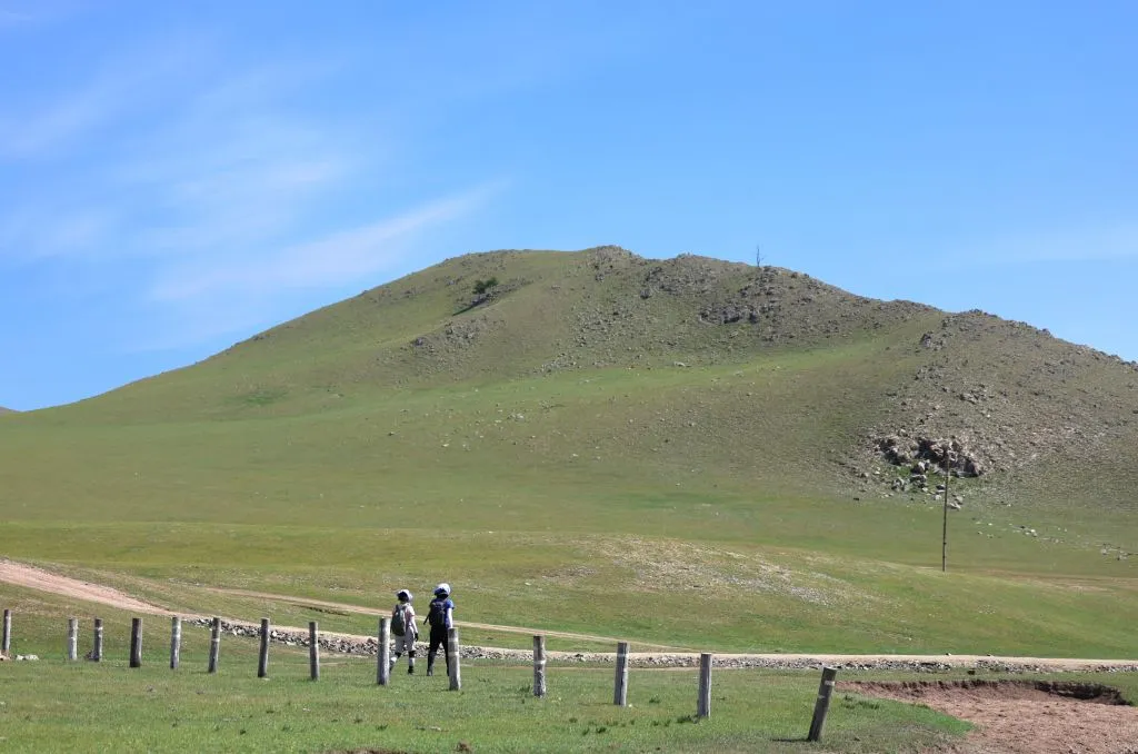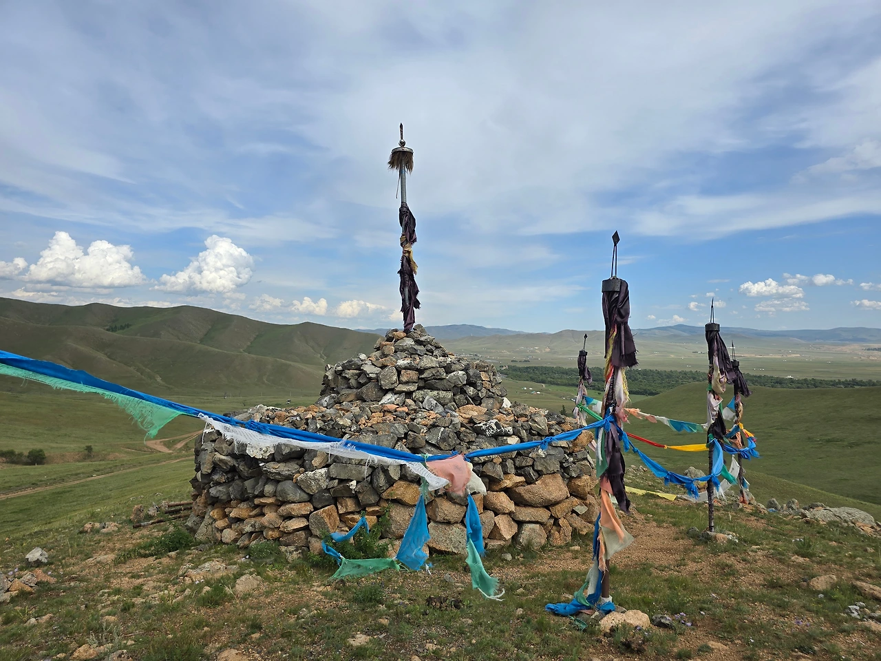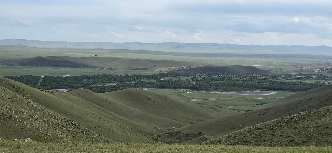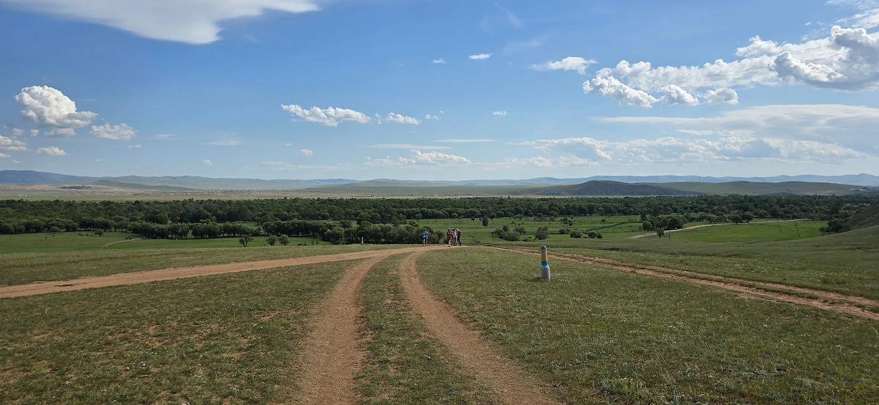 가이드 말처럼 완만한 지대를 걷고 또 걷는다. 언덕배기 너머로 보이던 산도 지나고, 어느새 정상에 도착했다. 아래를 내려다보니 몇 겹의 완만한 산 아래로 푸른 숲과 툴강이 보이고, 그 너머론 평지와 낮으막한 산이 몇 겹으로 펼쳐져 있다. 역시 어워가 있다. 너무나 낯선 풍경 놓칠 수 없어 사진도 동영상도 분주하게 찍는다.