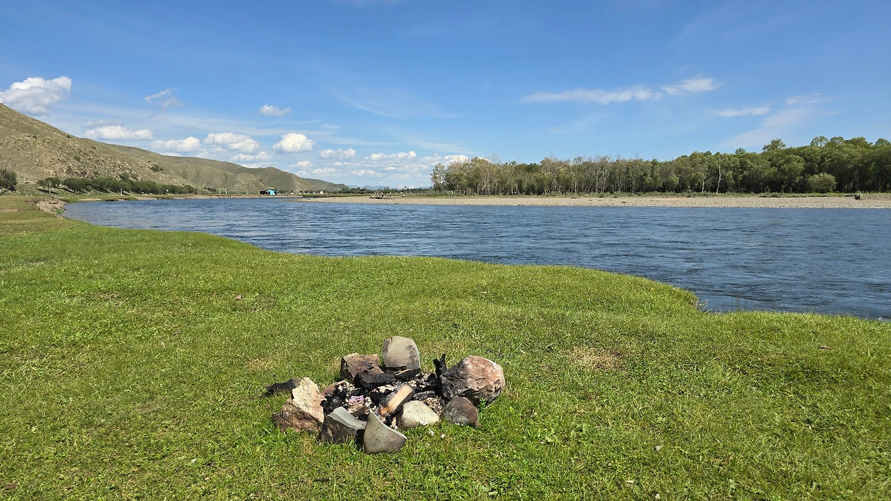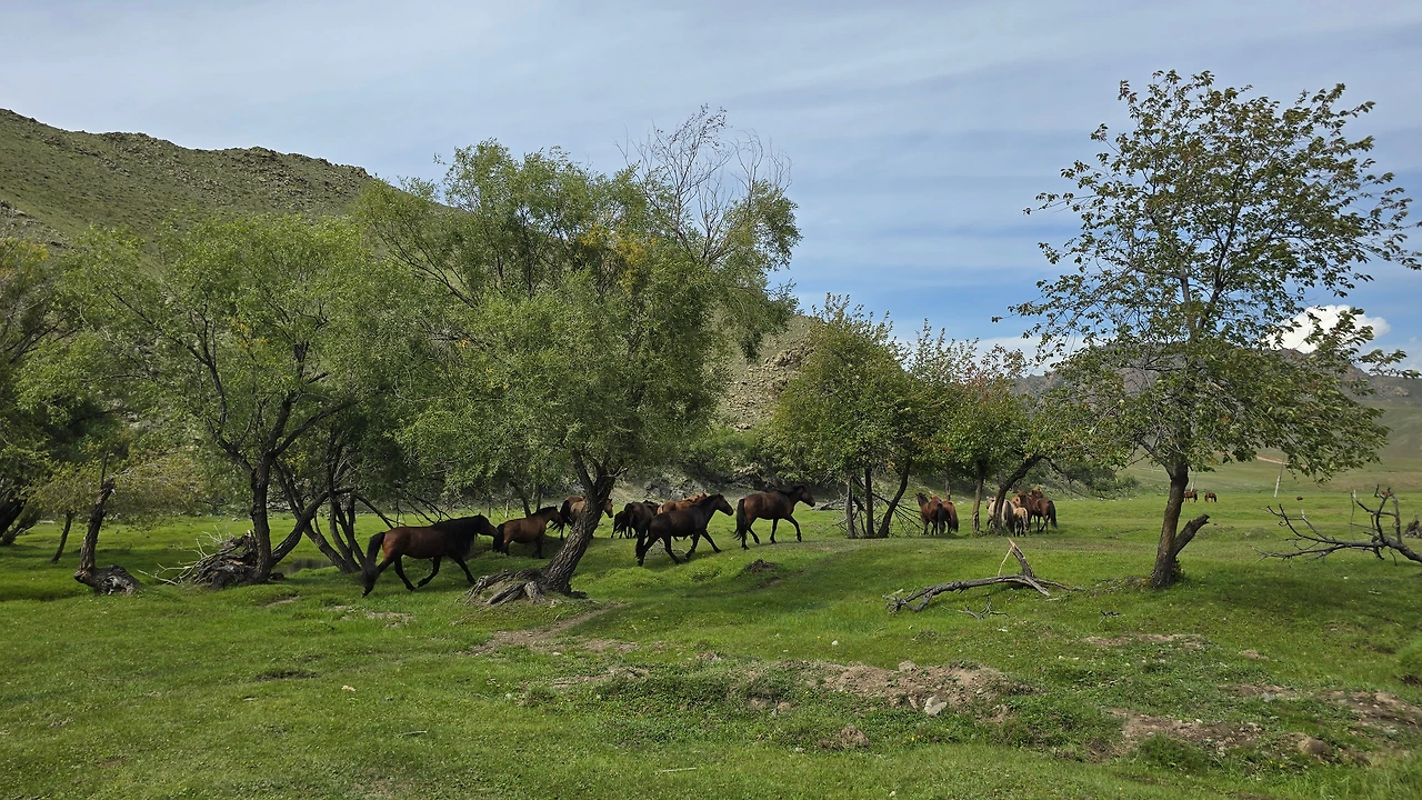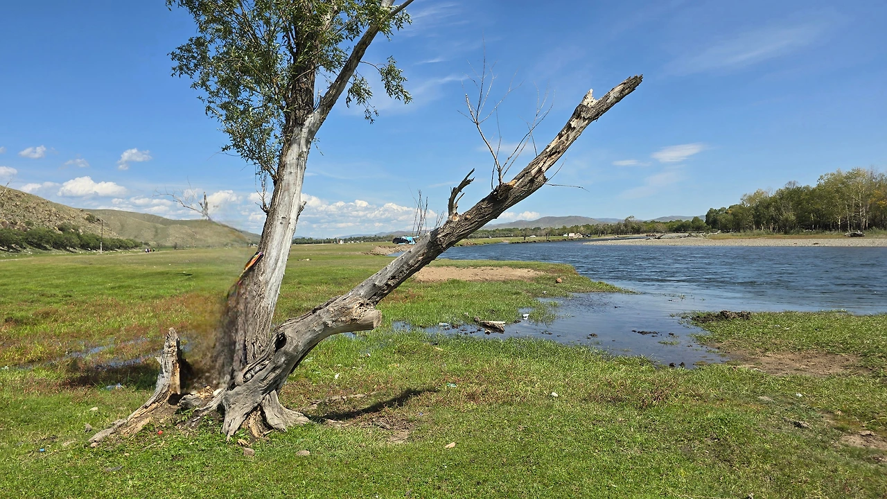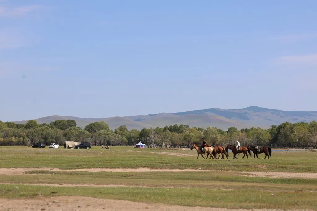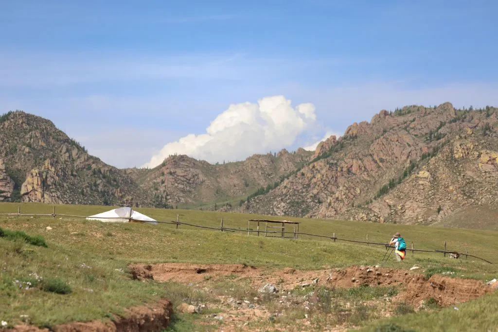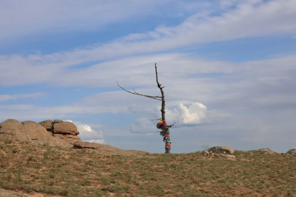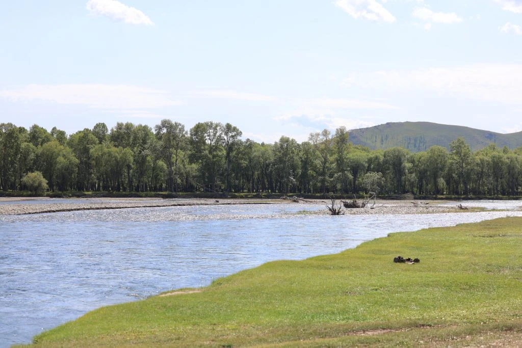 가이드 말처럼 완만한 지대를 걷고 또 걷는다. 언덕배기 너머로 보이던 산도 지나고, 어느새 정상에 도착했다. 아래를 내려다보니 몇 겹의 완만한 산 아래로 푸른 숲과 툴강이 보이고, 그 너머론 평지와 낮으막한 산이 몇 겹으로 펼쳐져 있다. 역시 어워가 있다. 너무나 낯선 풍경 놓칠 수 없어 사진도 동영상도 분주하게 찍는다.