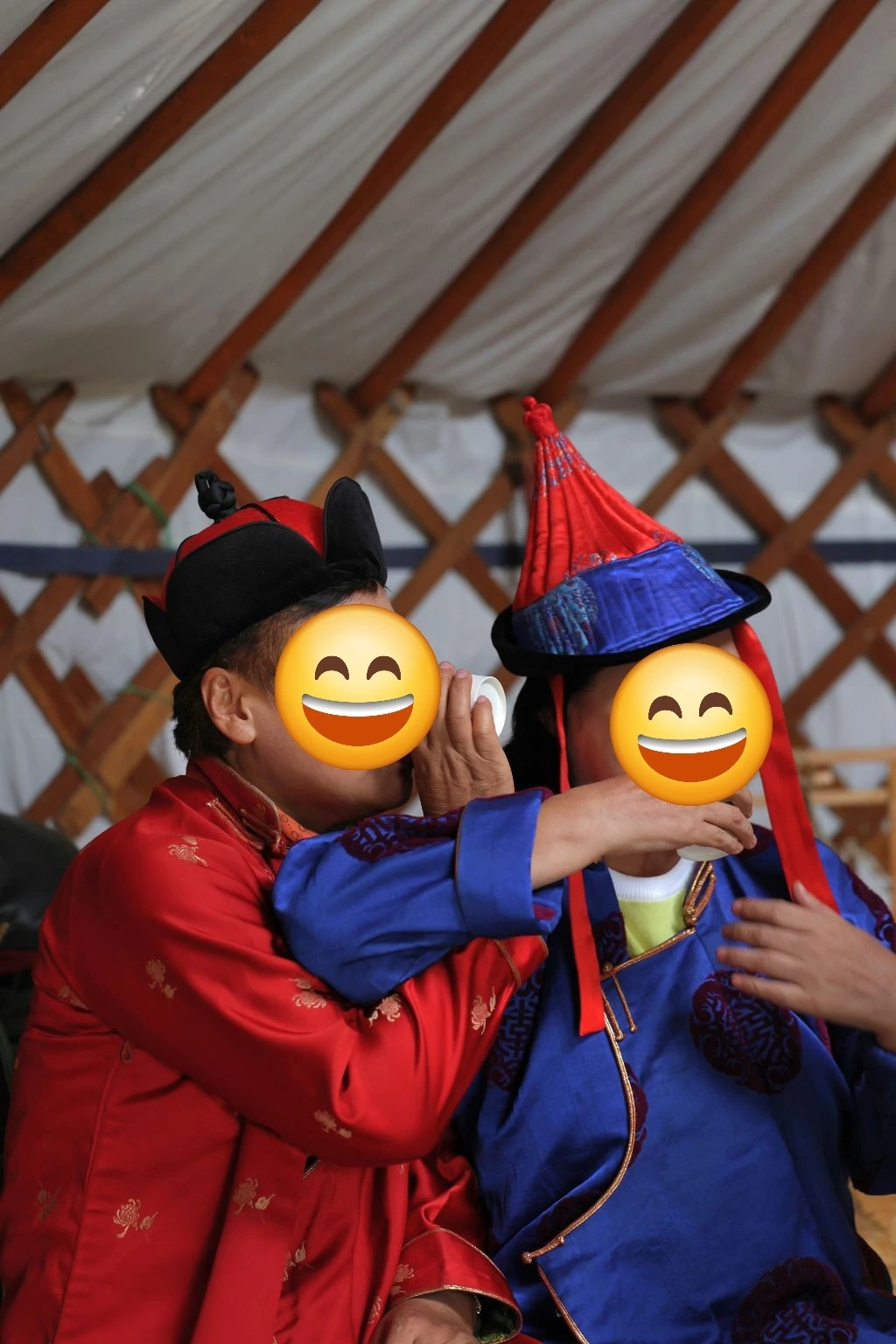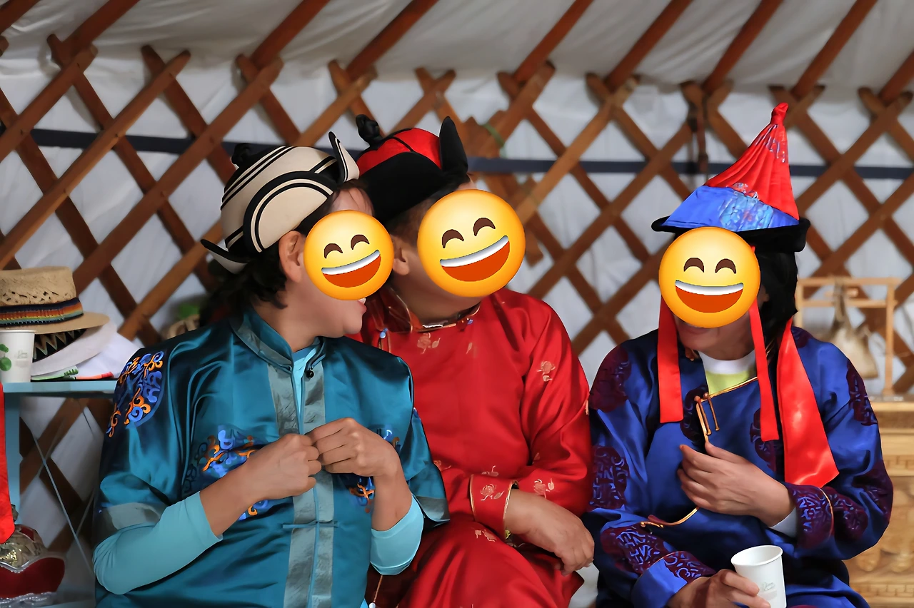 전통 가옥인 게르는 현재 이용하지는 않고 체험용으로 만들어 놓은 것이었다. 벽을 따라 두 개의 침대, 화구, 그릇, 옷 등이 너무 단출하다. 수시로 이동하는 삶을 고스란히 반영하고 있다. 얼마나 불안한 삶이었을까.. 마음 깊이 연민이 흐른다. 그러나 연민도 잠시, 좁은 게르 안은 웃음바다가 된다. 풍채 좋고 솟 커트한 한 여성이 어느샌가 귀퉁이에 가지런히 준비된 전통의상 중 하나를 골라 입고 앉아 있는데, 그 모습이 영락없는 몽골 중년 남성 포스였다. 옆에 있는 회원님께 여성 옷을 입어보라고 아우성 지르니 얼른 또 챙겨 입는다. 영락없는 몽골 부부의 탄생이다. 몽골 남성이 되어 버린 회원님이 몽골 아내로 분한 회원님께 부부 상황극을 펼친다. 순식간에 게르 안은 개그콘서트 장이 되어 버렸다. 얼른 또 한 명이 아동 복장을 하며 둘 사이에 태어난 아이로 분한다. 행복한 한가족의 탄생이다. 게르 안은 깔깔 웃음이 멈추지 않는다. 때로는 뜻밖의 순간에서 이런 빛나는 순간이 있다. 뜻하지 않은 이런 순간이야말로 진정 우리 삶의 카타르시스의 순간이 아닐까. 온몸 들썩이며 웃어 제끼느라 묵었던 체증이 쑥 내려가는 듯, 몸도 마음도 개운해졌다.