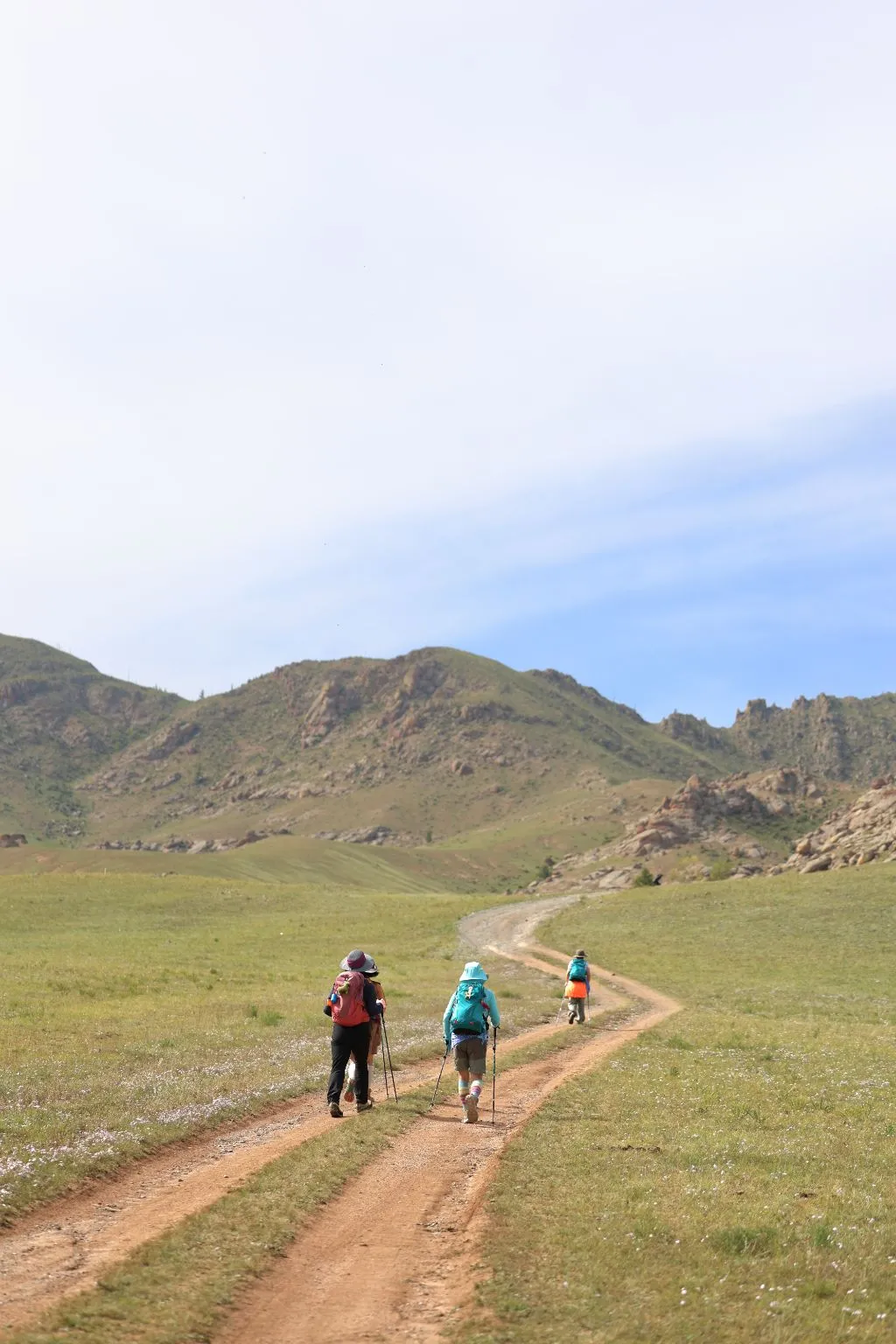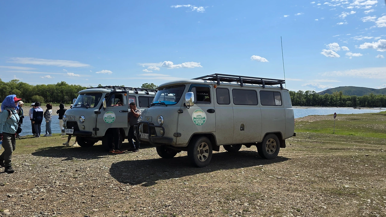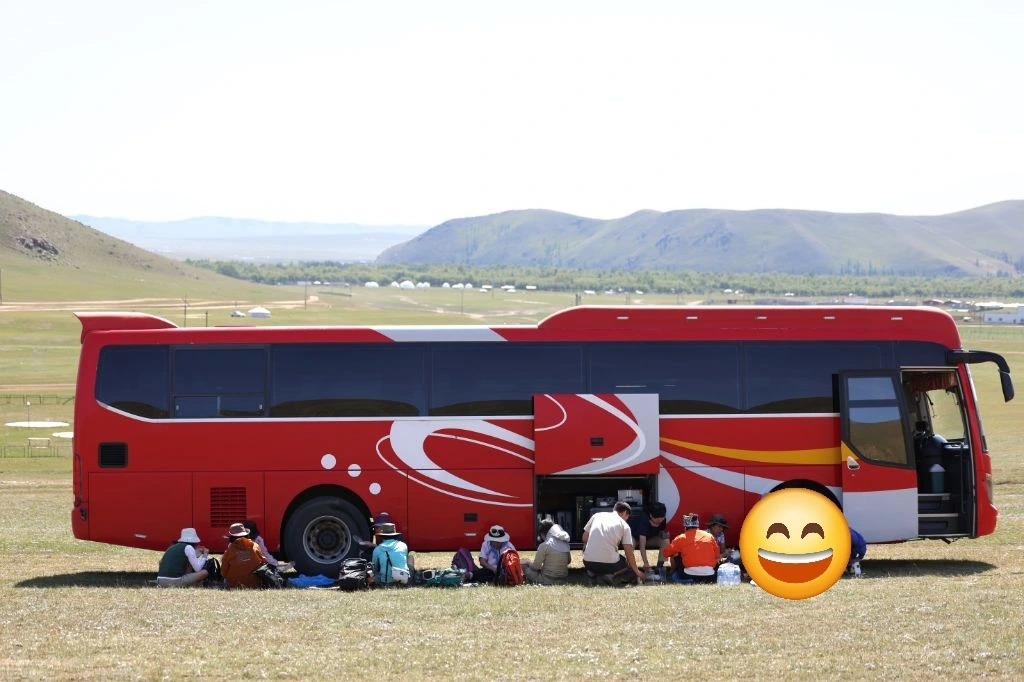 어제 점심부터 지금 도시락까지 맛난 음식들에 현지 가이드의 음식 선택에 별점 다섯 개를 준다. 맑고 푸른 하늘, 그 아래 넓은 초원에 빨간 버스 세워두고 맛난 오찬을 즐기는 풍경은 평화롭기 그지없다. 사과와 아이스커피로 디저트까지 깔끔하게 챙겨 먹고 배낭을 정리하고 툴툴 자리 털고 일어선다. 드디어 몽골 초원의 트래킹 시작이다. 들판 가득 피어 있을 야생화 생각에 마냥 즐겁다.