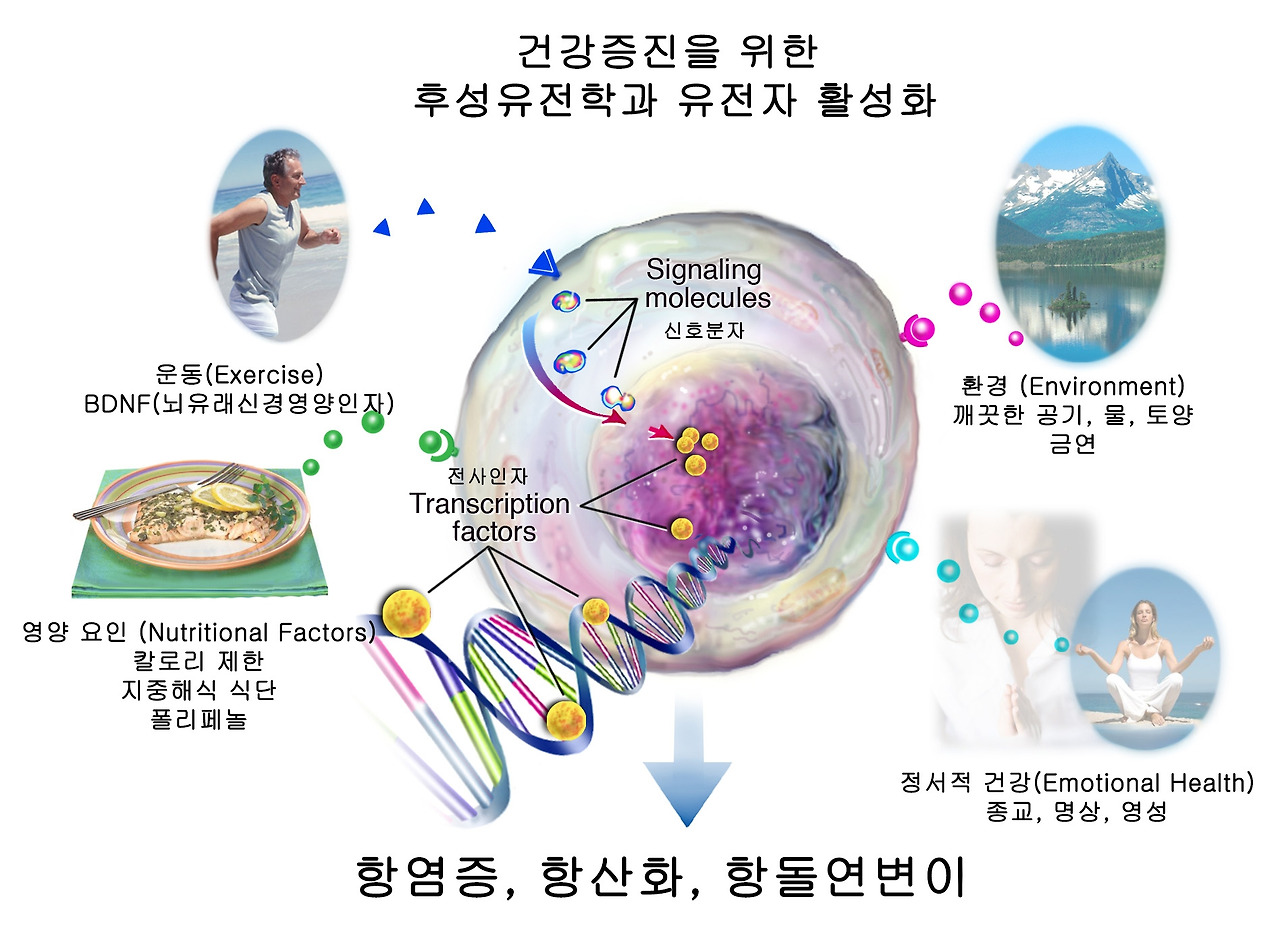 이러한 다양한 요인들이 종합적으로 작용한 결과, 세포 수준에서는 항염증, 항산화, 항돌연변이 효과가 나타나며, 이는 만성 질환의 예방과 노화예방 궁극적으로는 건강 수명 연장으로 이어진다는 메시지를 전달하고 있습니다. 더구나 좋은 습관과 환경은 나의 건강은 물론 좋은 유전자를 자녀에게 물려줄 수 있습니다.