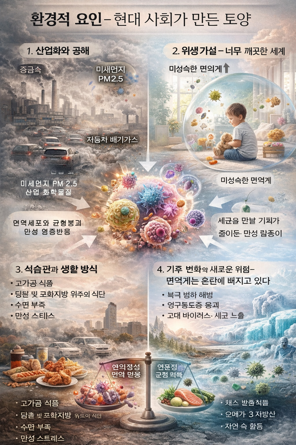 이 질문의 답은 우리 몸 안이 아니라, 우리를 둘러싼 환경에 있습니다. 산업화가 만들어낸 공기와 토양, 지나치게 깨끗해진 생활환경, 변화한 식습관과 생활 방식, 그리고 지구 규모로 진행 중인 기후 변화까지—이 모든 요소들은 조용하지만 강력하게 면역계를 재편하고 있습니다. 특히 성장기 아이들의 면역계는 이러한 환경 변화에 가장 민감하게 반응하며, 그 결과가 아토피와 천식이라는 형태로 드러나고 있는지도 모릅니다.